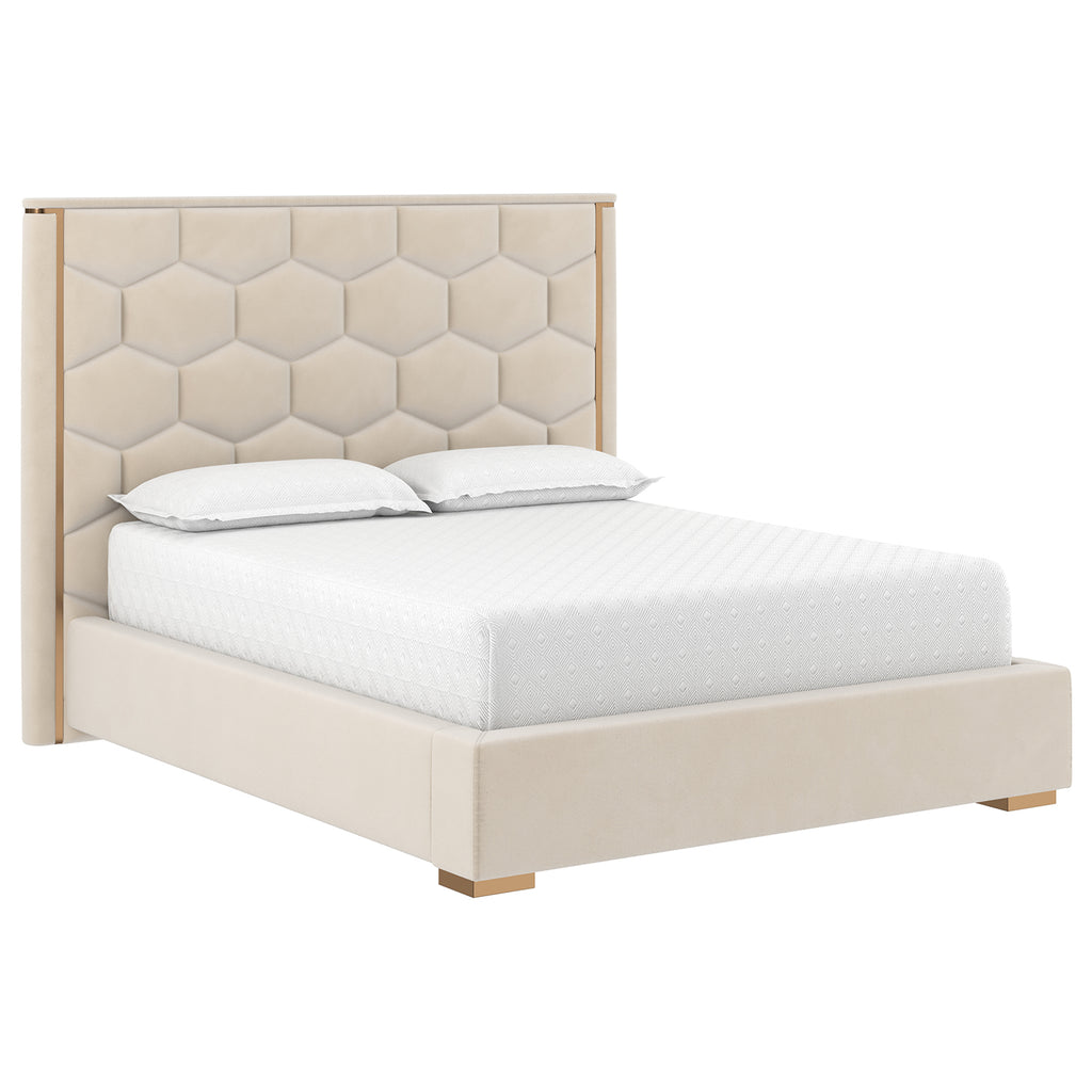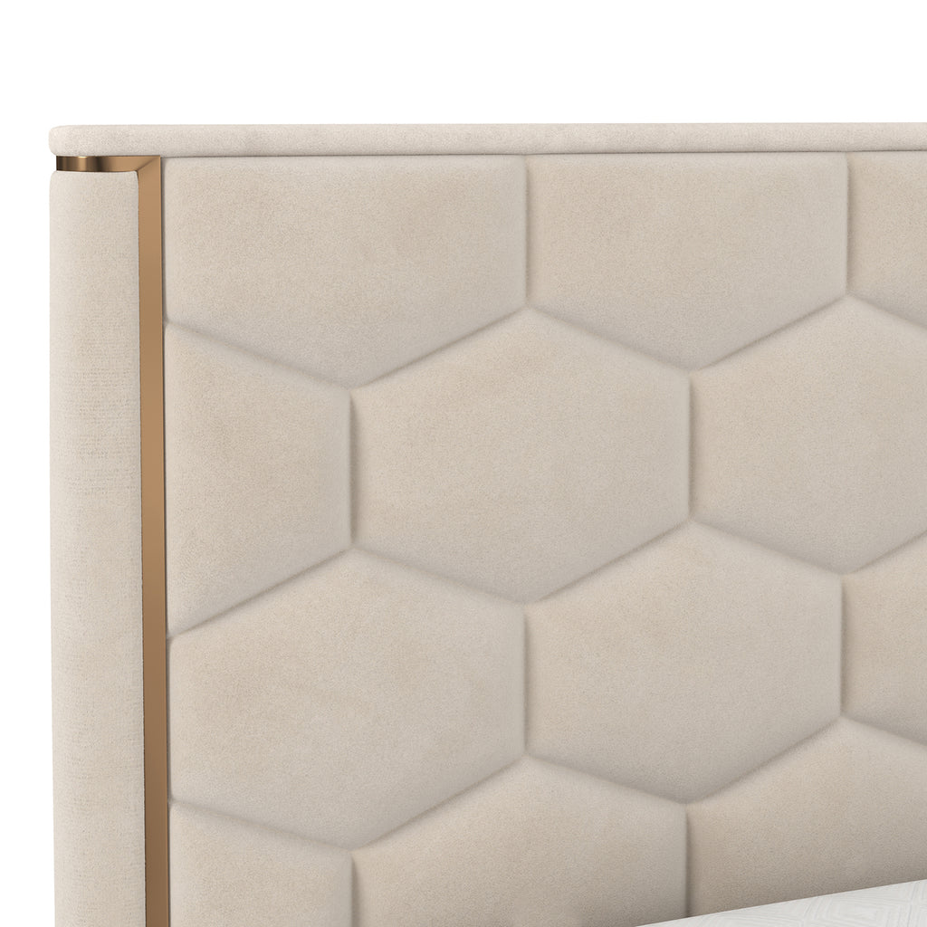 With a classic design that boasts opulence and supreme comfort, this luxurious bed will transform any bedroom space into a dreamy oasis. Upholstered in taupe or dusty teal fabric and features hexagonal tufting on the headboard. Completed with gold stainless steel accents.