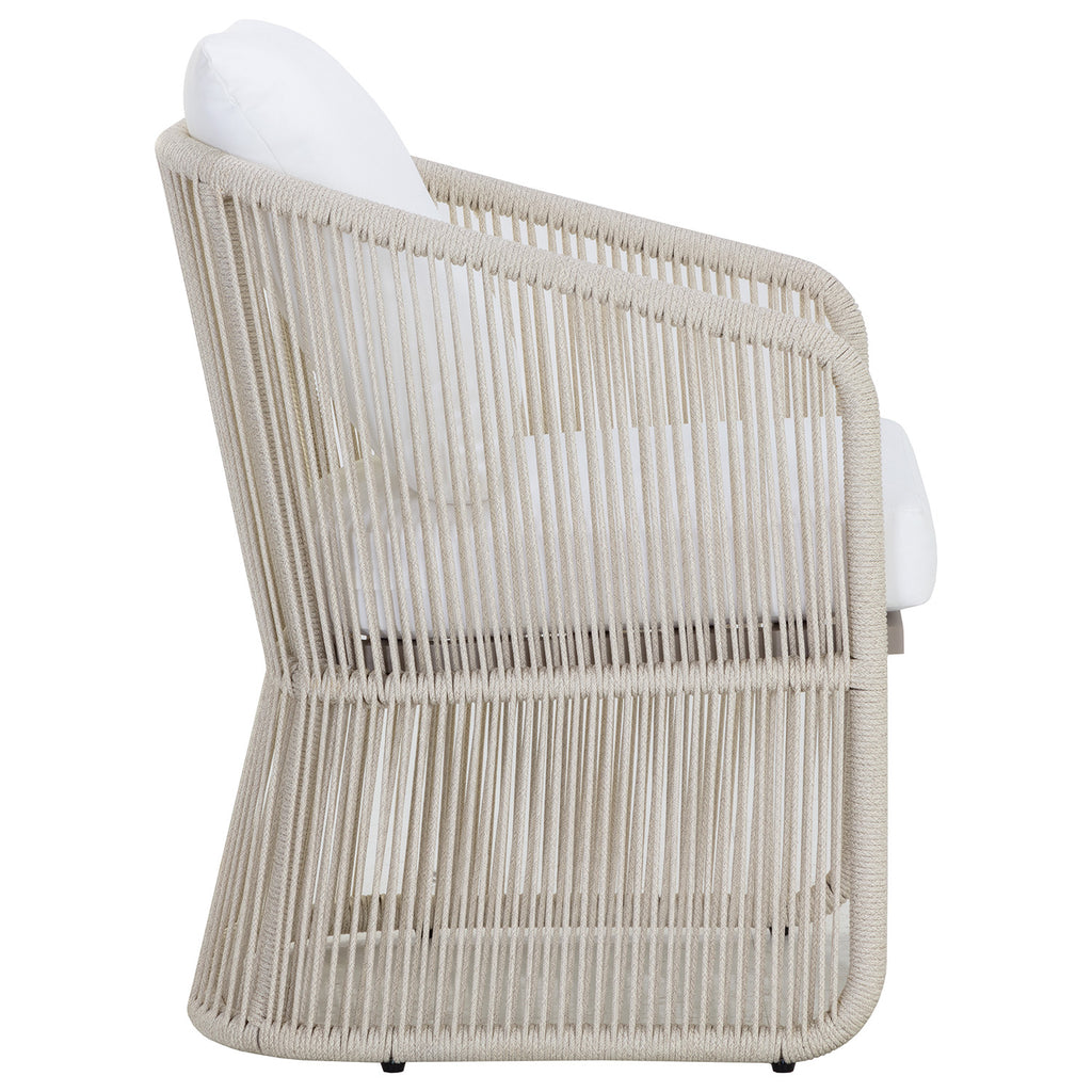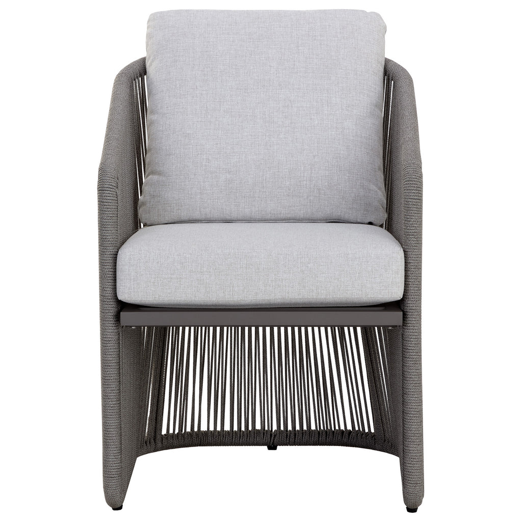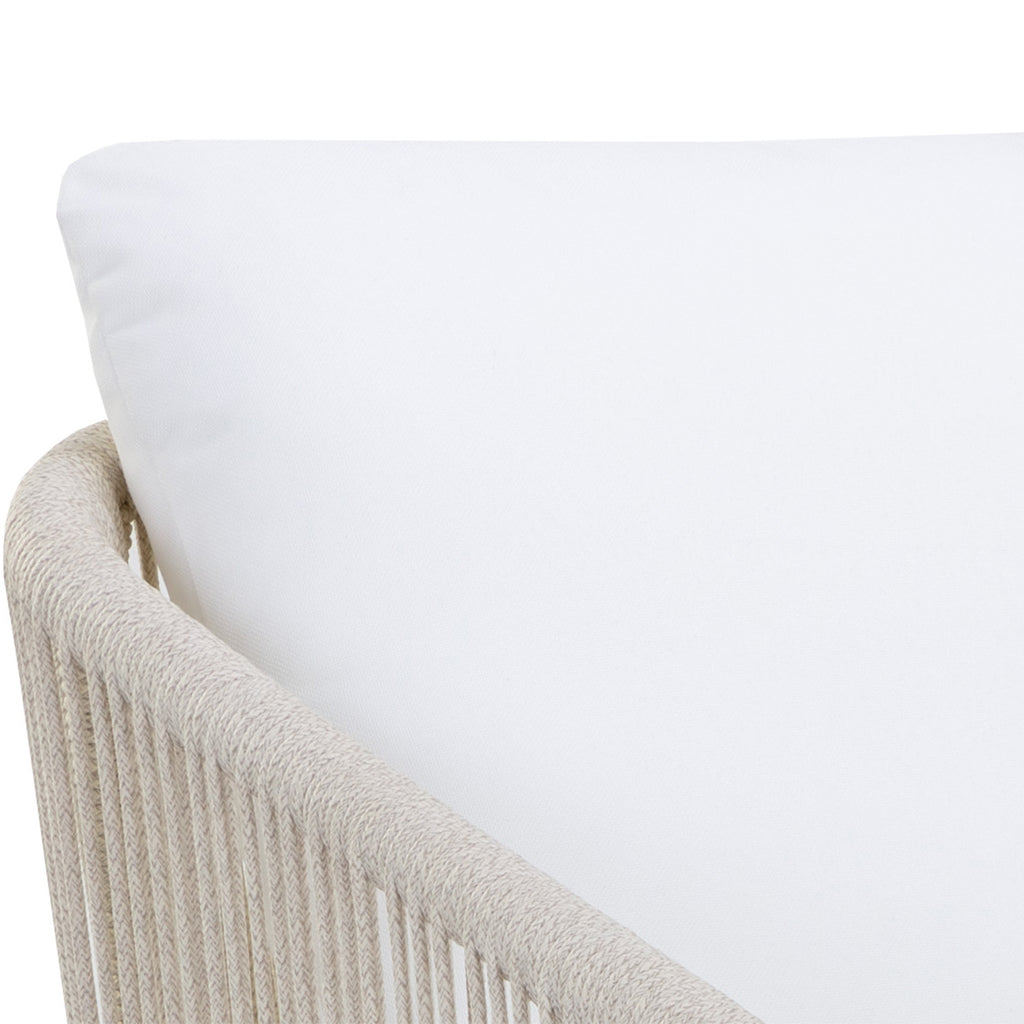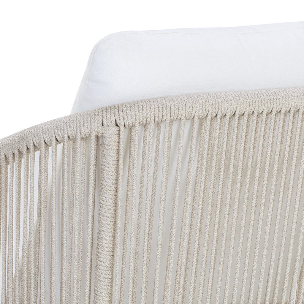Introduce refined modern style outside with the impressive Allariz Dining Armchair. Upholstered in stinson white fabric with a powder coated greige aluminum frame. Completed with cream rope weaving on the seat exterior.