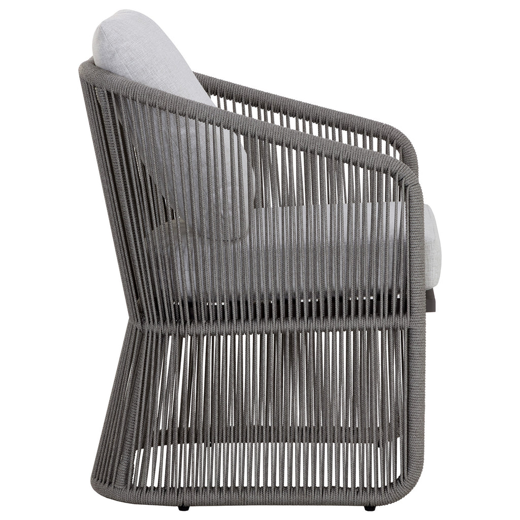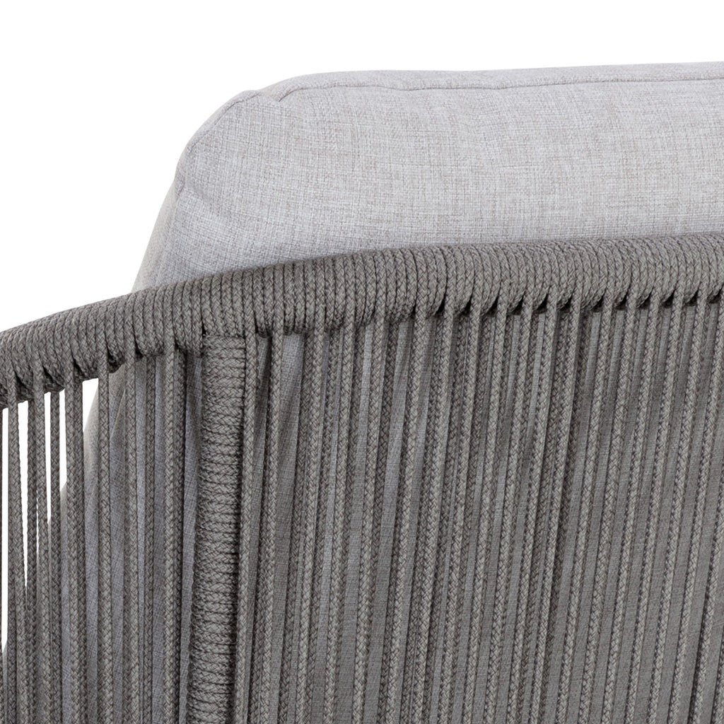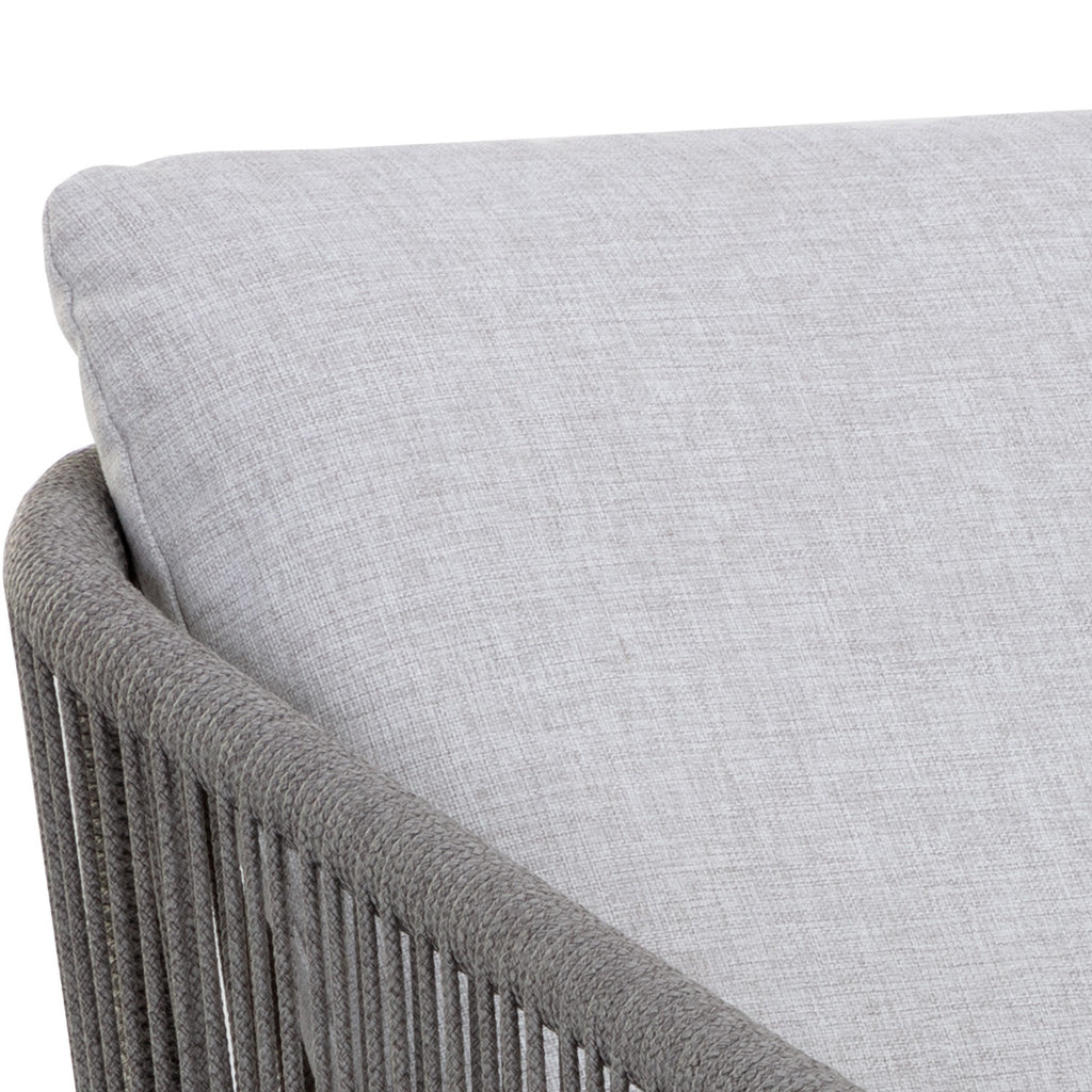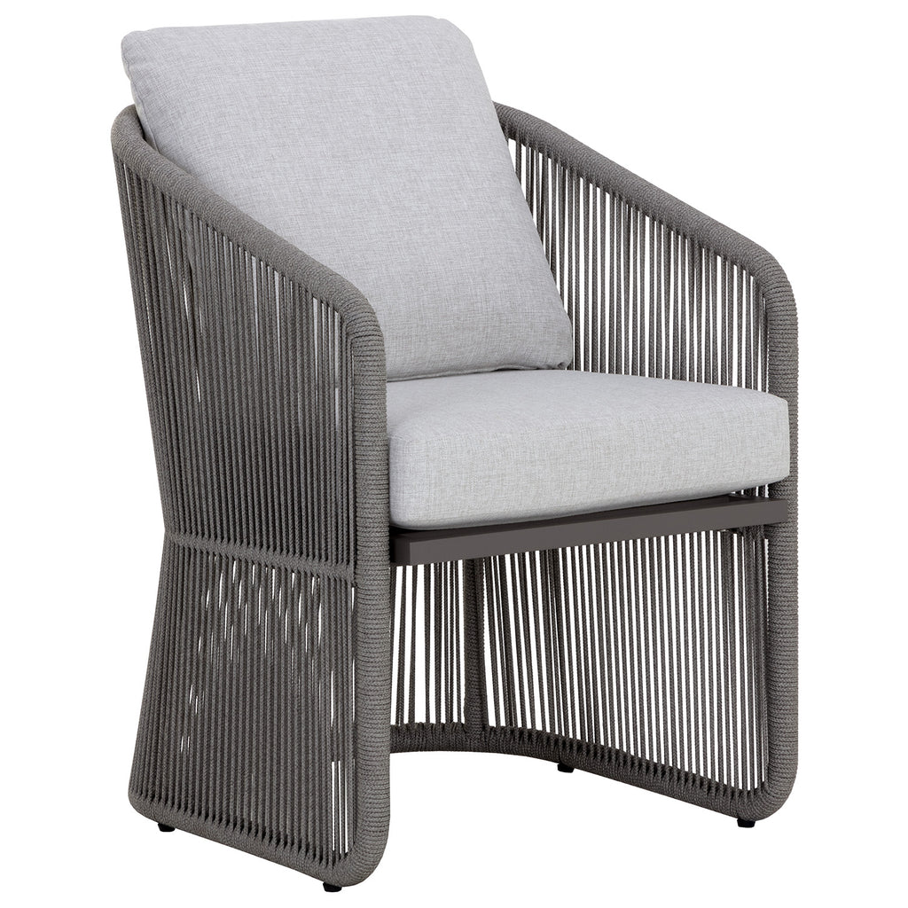 Introduce refined modern style outside with the impressive Allariz Dining Armchair. Upholstered in stinson white fabric with a powder coated greige aluminum frame. Completed with cream rope weaving on the seat exterior.