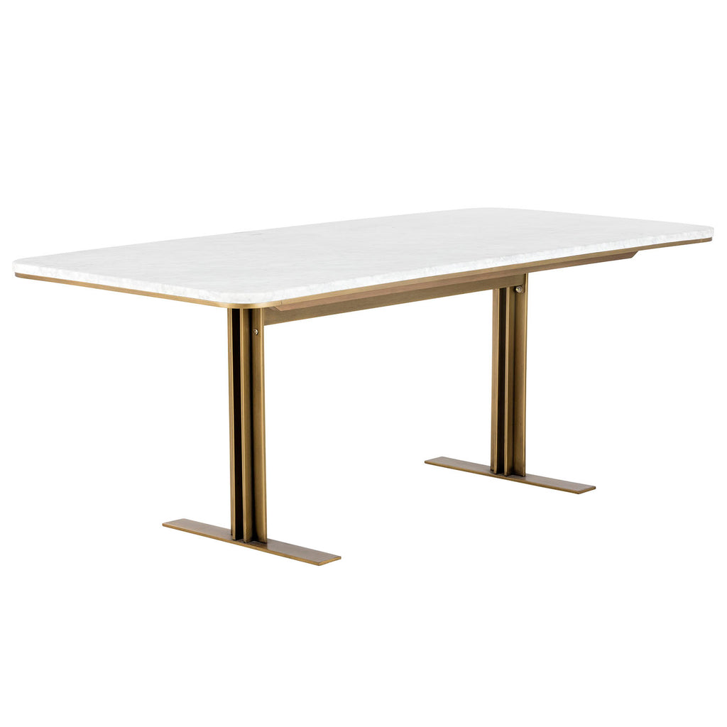 This intriguing dining table will bring art deco styling to dining spaces. Crafted with a beautiful white marble top featuring rounded edges and a contemporary antique brass t-frame base. Seats up to six. As marble is a natural material, unique veining, pitting, fissures, micro-cracks and colour variations are all characteristics that add to the uniqueness and beauty of each piece.