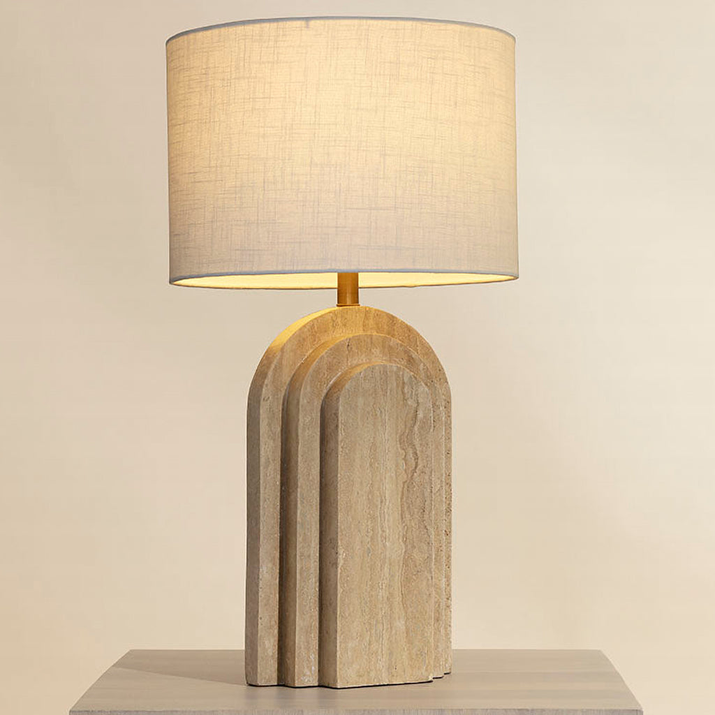 The balanced proportions of the Ancona Table Lamp lend an impression of visual harmony. Handcrafted from natural travertine, graduated tiers of smooth curves and clean lines create a memorable geometric base complemented by a cream linen shade.