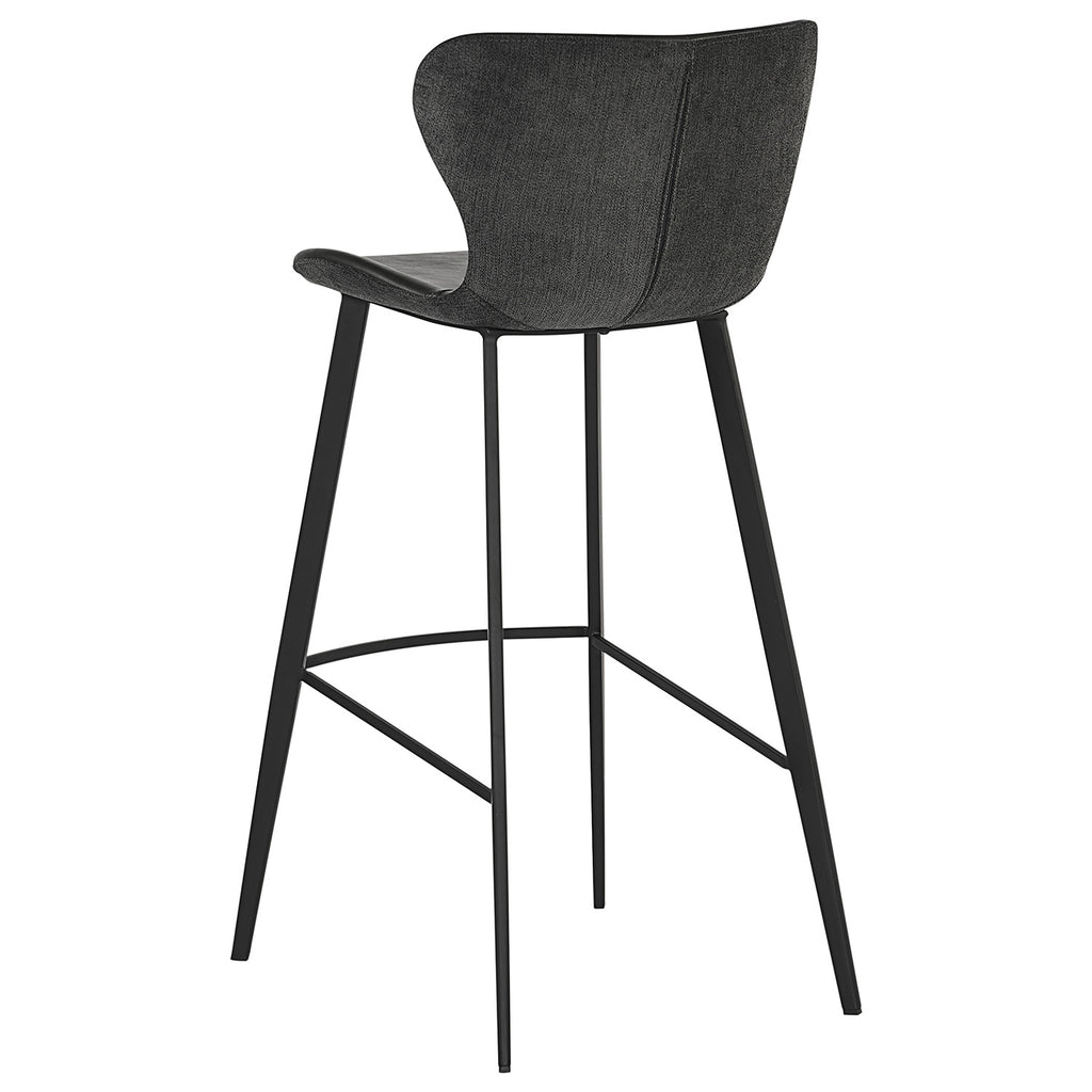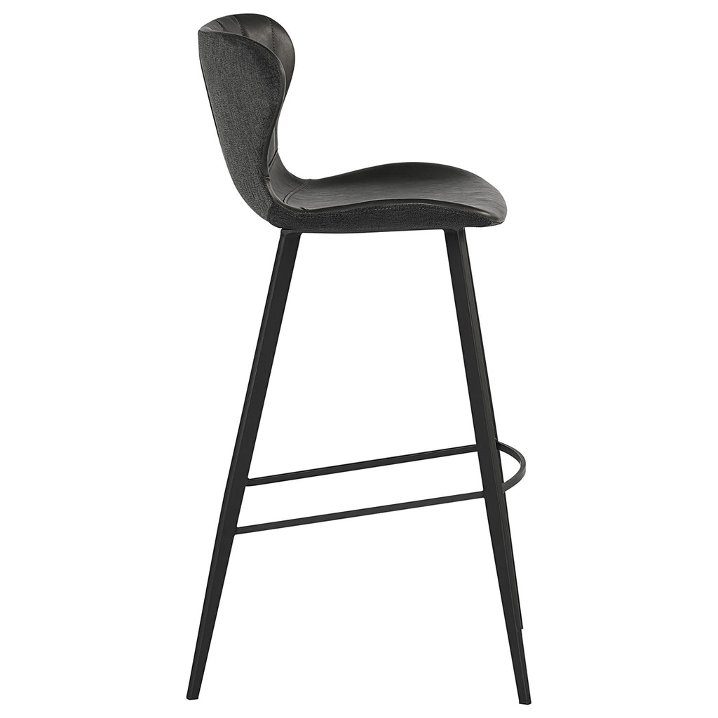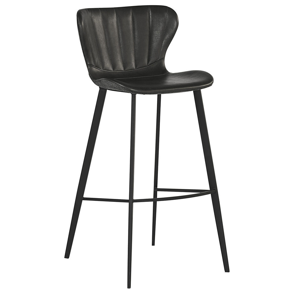 A compact barstool designed with a modern, feminine style. Features clamshell style tufting on the seatback. Stocked in bravo cognac faux leather with a november gray fabric exterior. Finished with black steel legs. A stylish seating option for dining spaces of all sizes.