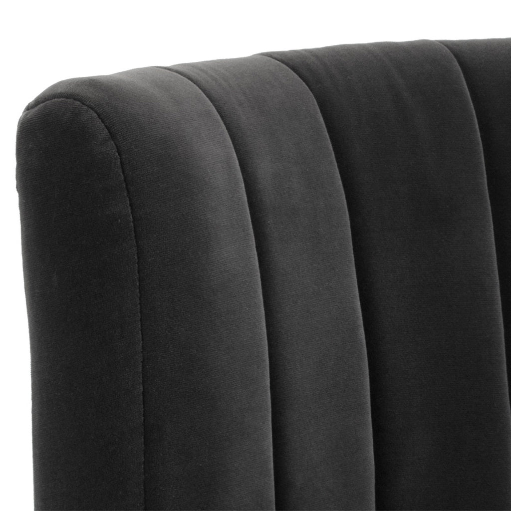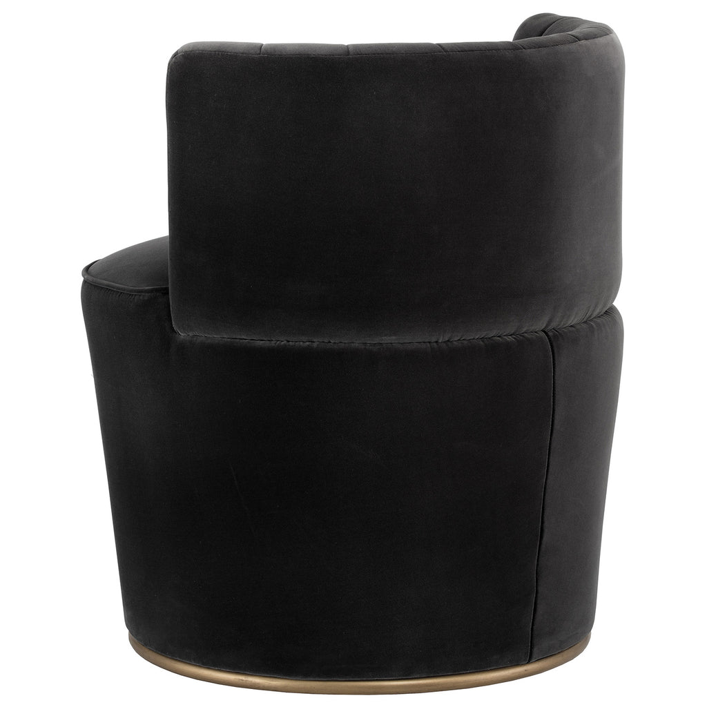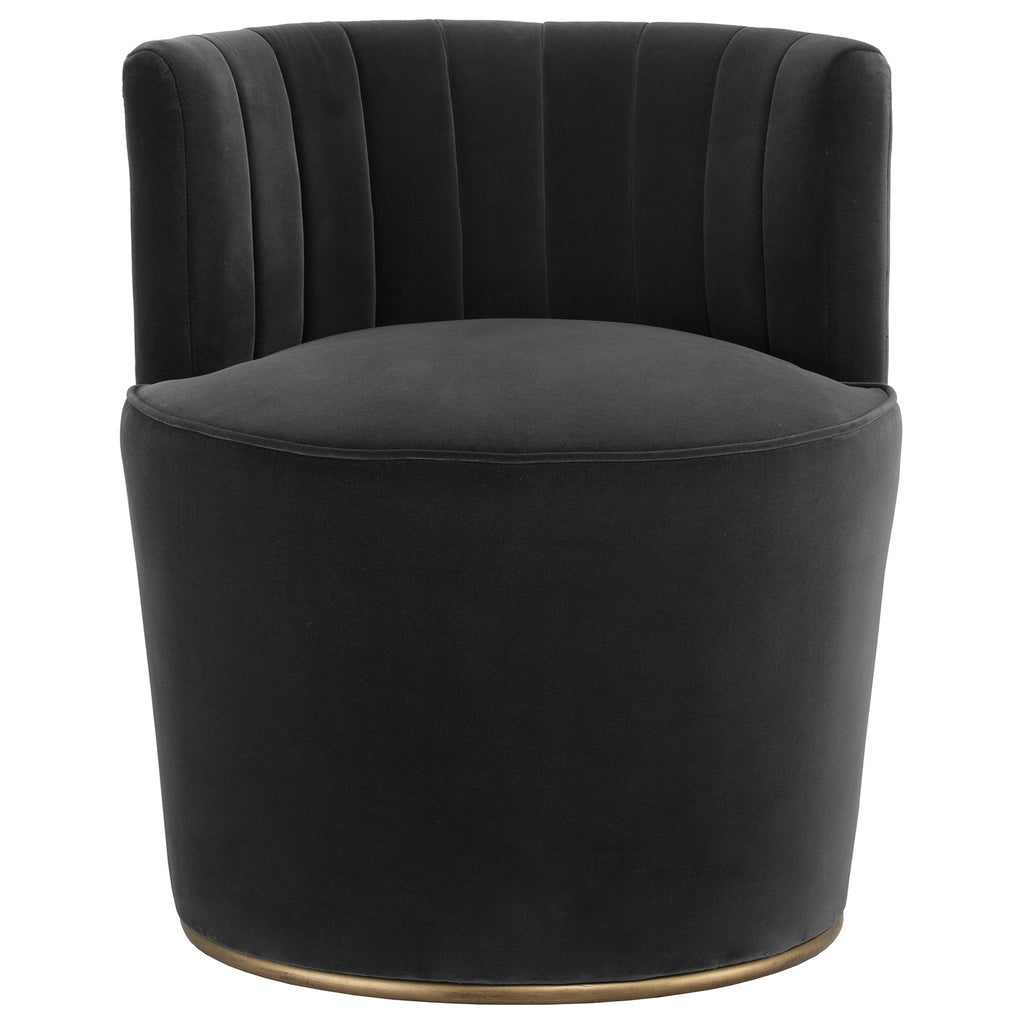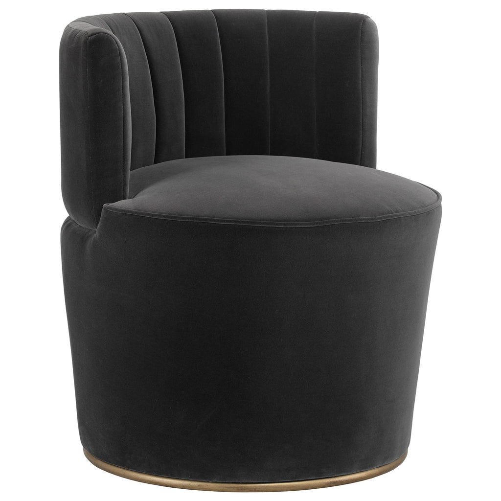 This alluring chair from features a curved seatback with channel tufting, and a comfortable rounded seat. Stocked in a shadow grey fabric with an antique brass frame. A beautiful addition to contract and residential lounge and living spaces.