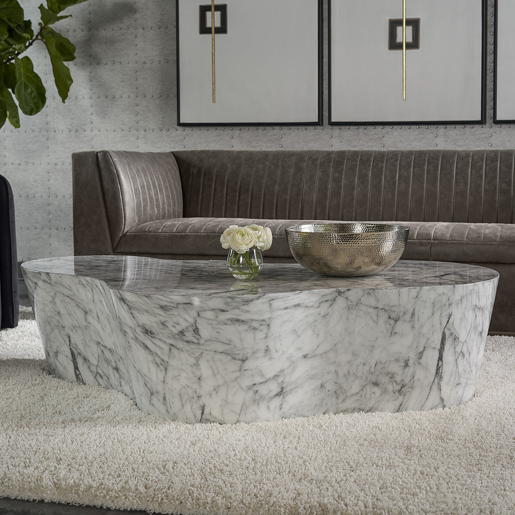 A contemporary and alluring coffee table. Sculpted from concrete and overlaid with a marble-look finish. The shapely design is eye-catching and unique for placement in residential and contract settings.