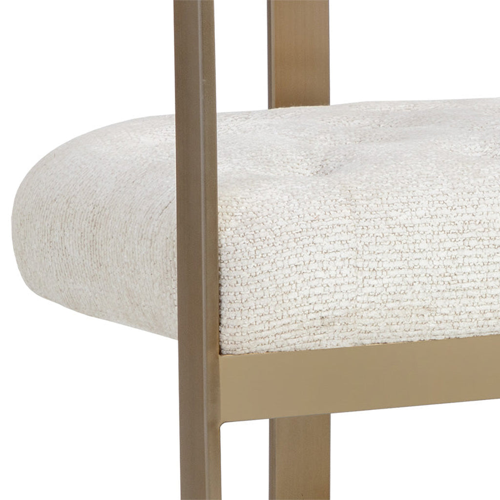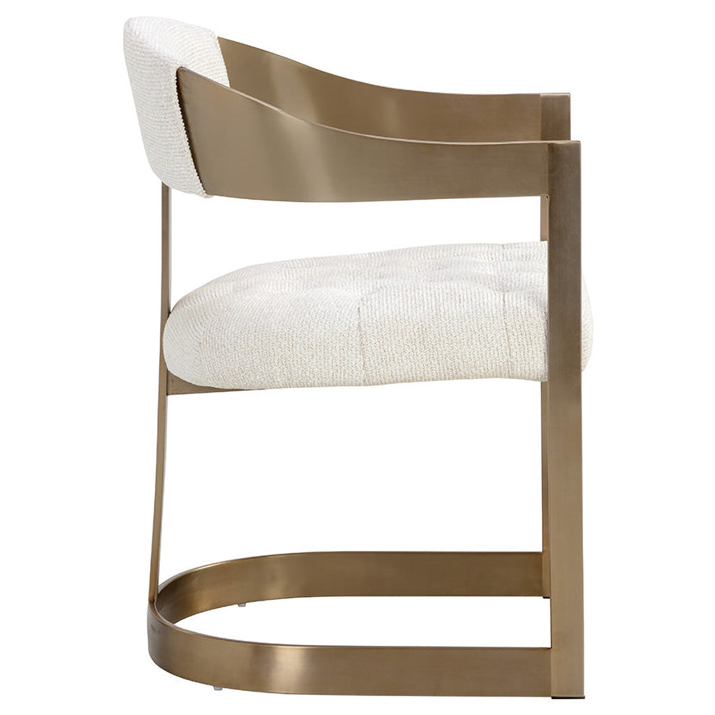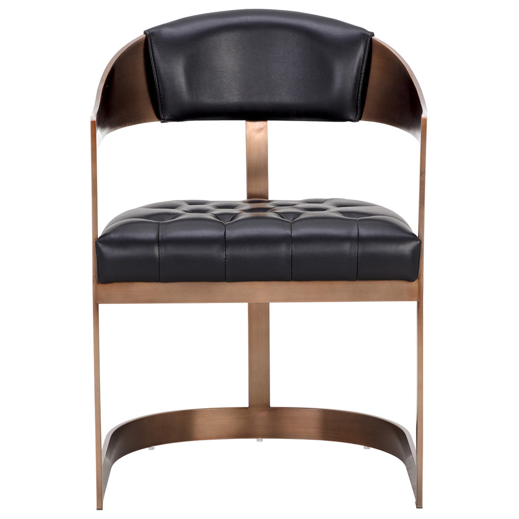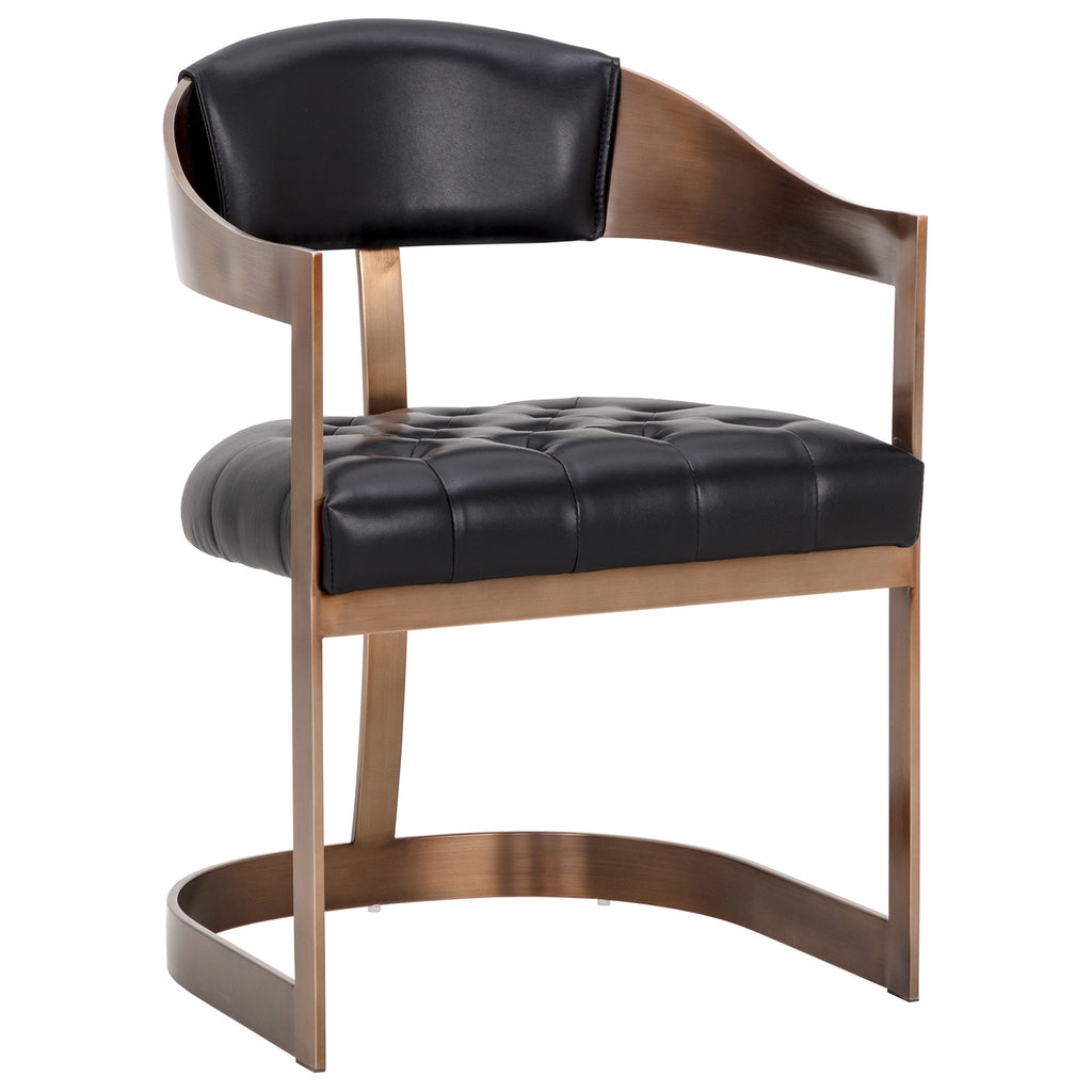 This ultra contemporary dining chair features a T-shaped back, tapered arms and an antique brass crown base. Stocked in cantina black bonded leather. Perfectly suited for various dining, kitchen and bar spaces of all sizes in either commerical or residential settings.