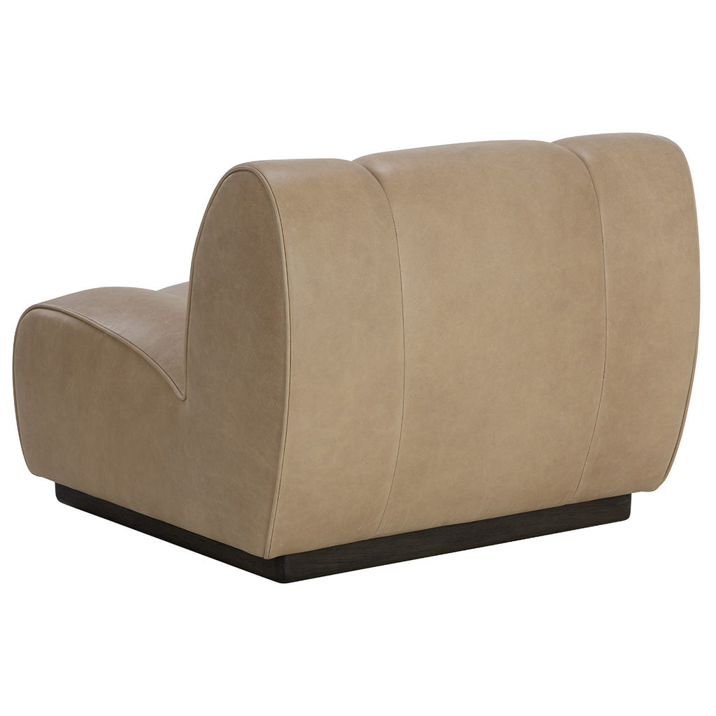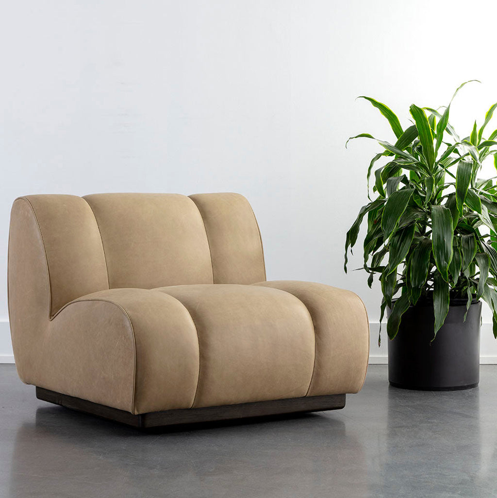 The elegant proportions and plush seating of the Blaise Swivel Lounge Chair invite you to indulge in luxurious comfort. Fully upholstered in our sahara sand aniline leather with a contrasting dark brown rubberwood base for a handsome addition to any space. Handle with Care: This design has been crafted with 100% leather. Leather is a natural material; as such, colour variations, markings, wrinkles, grooves and light scratches are acceptable and appreciated characteristics. No two pieces are alike. Visit our Product Care page for more information on how to ensure the lasting beauty of this piece. As wood is an organic, porous material, these pieces will contain natural variation of texture and may also exhibit fine indentations and cracks. Wood pieces will also display a disparity of colour and grain, and visible knots and burls that add to the character of each piece.