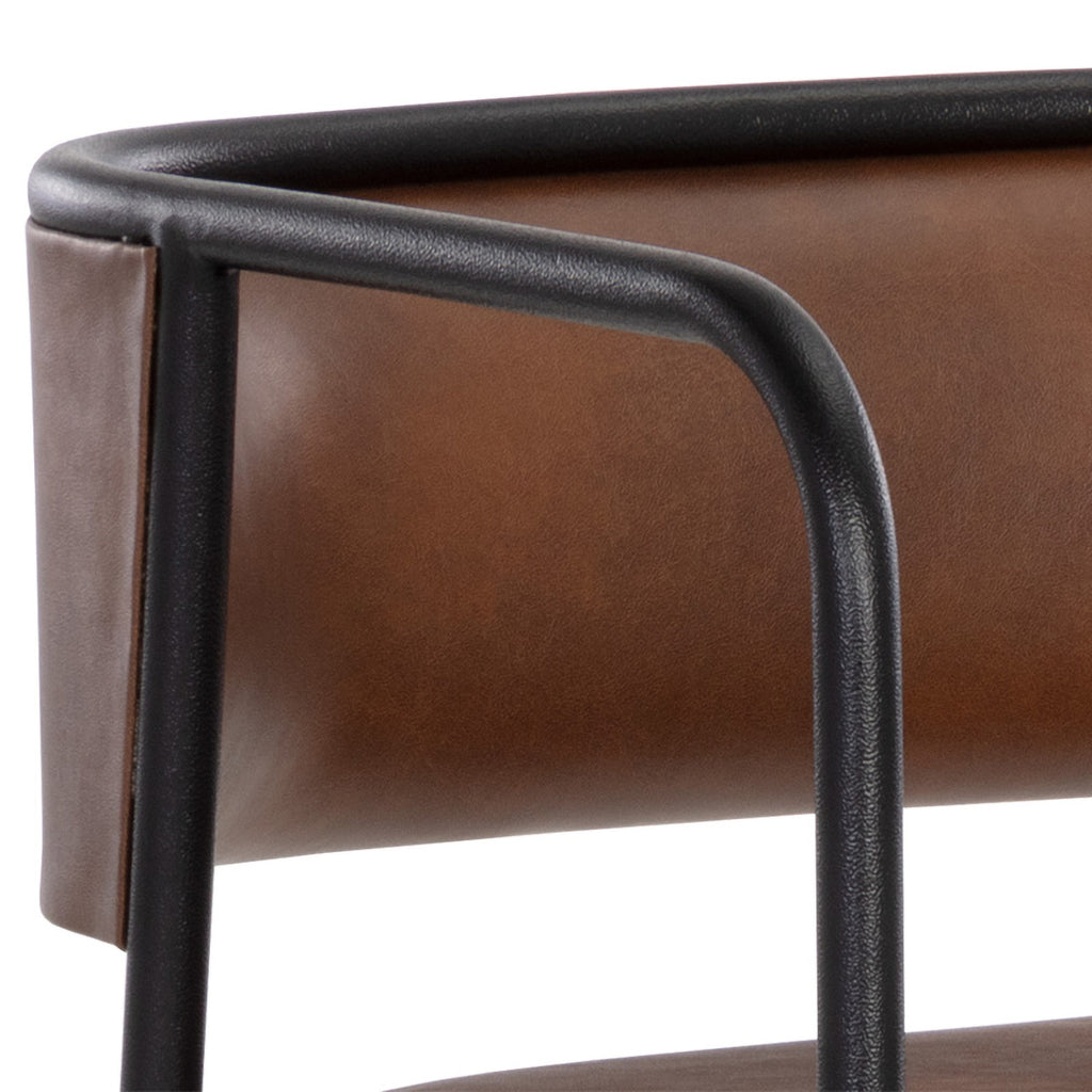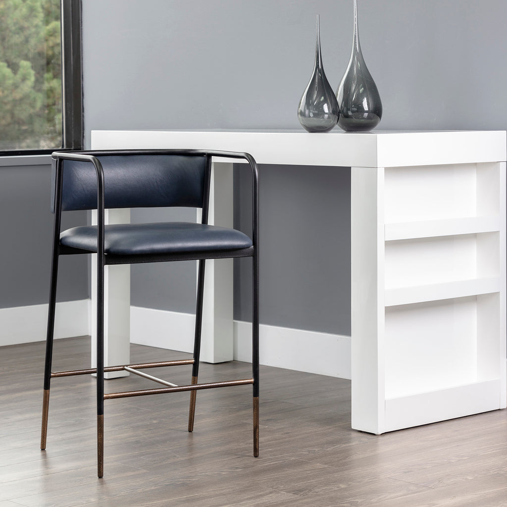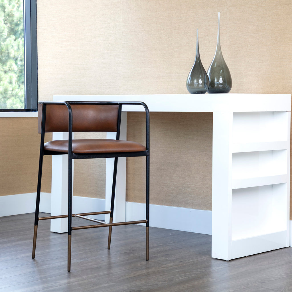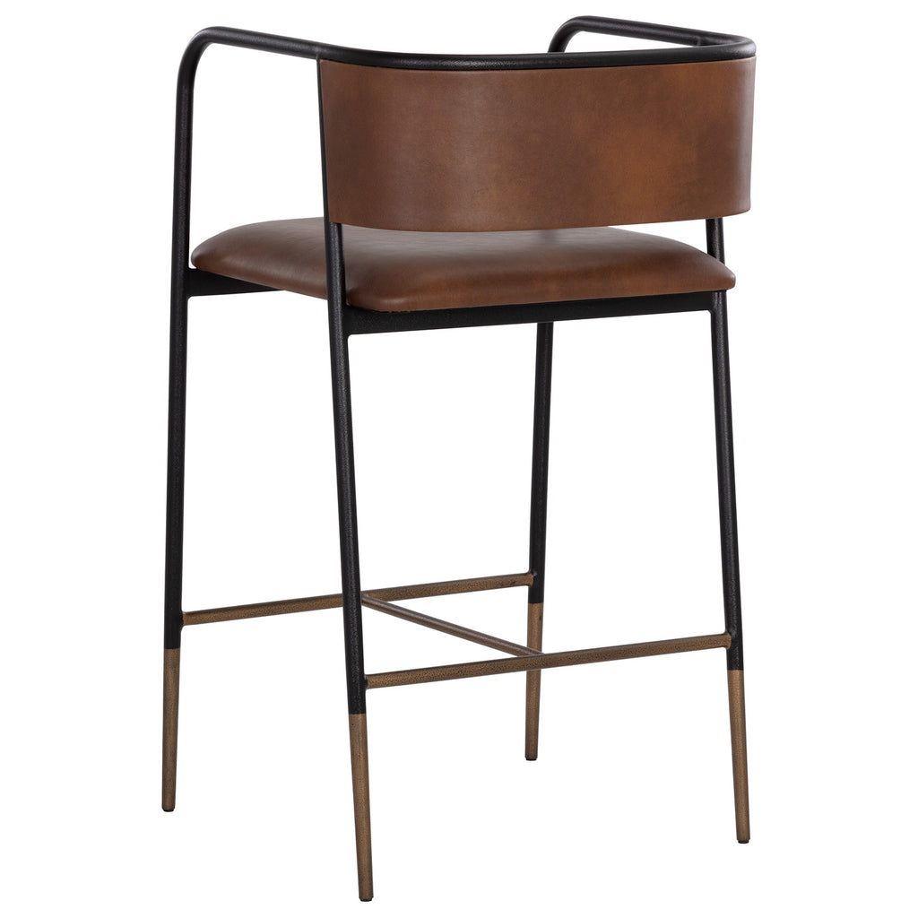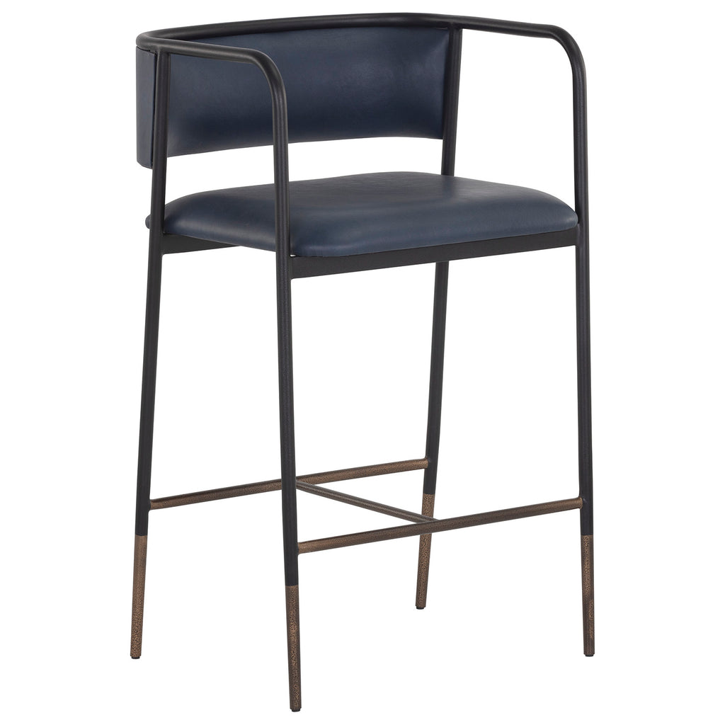 Simplicity is key with this effortlessly elegant counter stool that features a curved backrest. Stocked in bravo admiral and cognac faux leathers, and completed with a black metal frame and legs with antique brass foot caps.