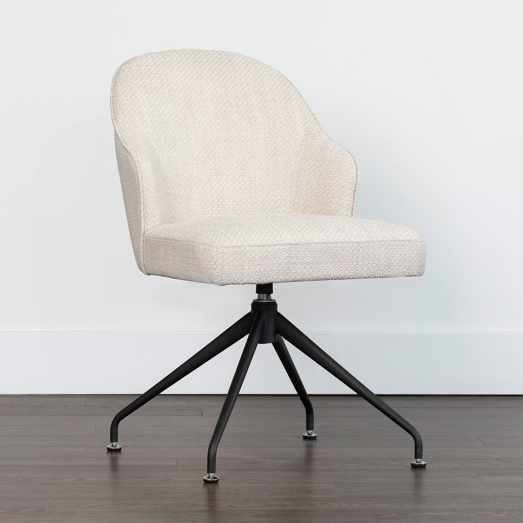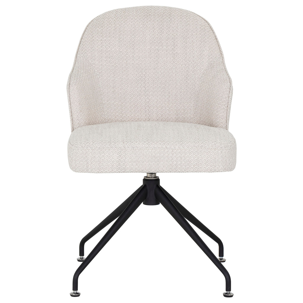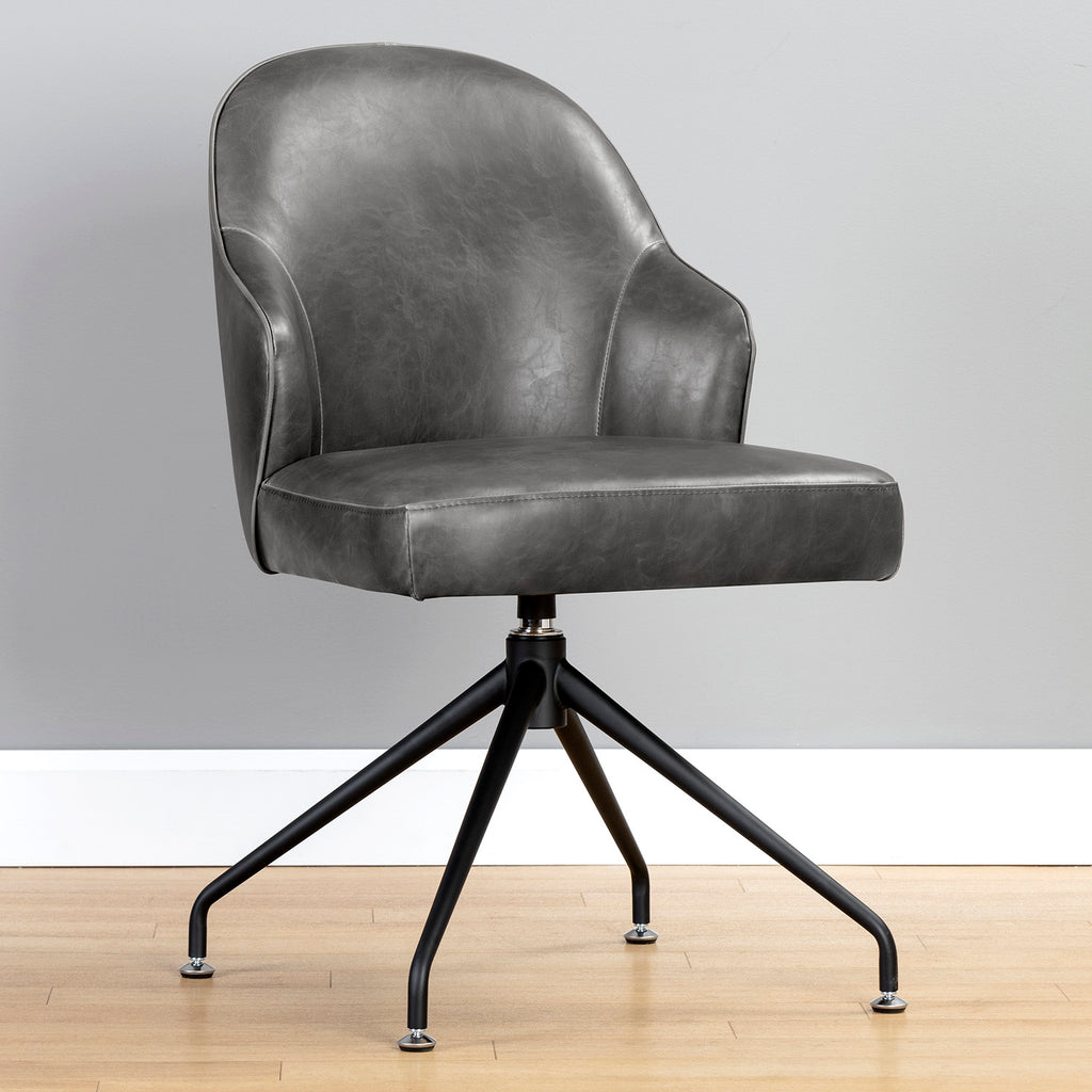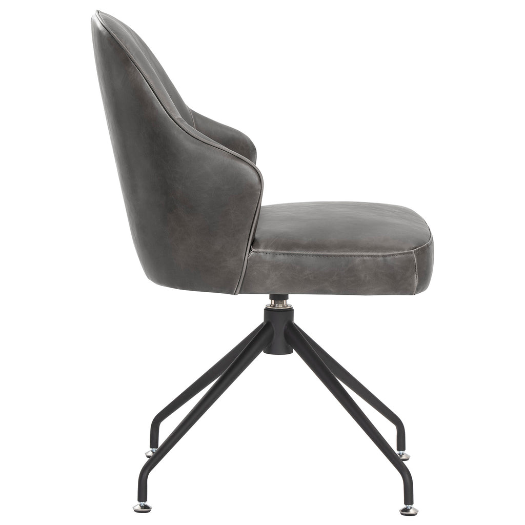 A handsome swivel dining chair is designed for transitional and modern spaces. Features a curved seatback in performance fabric or fux leather with a black iron base. Performance fabric is moisture repellent, durable and easy to clean.