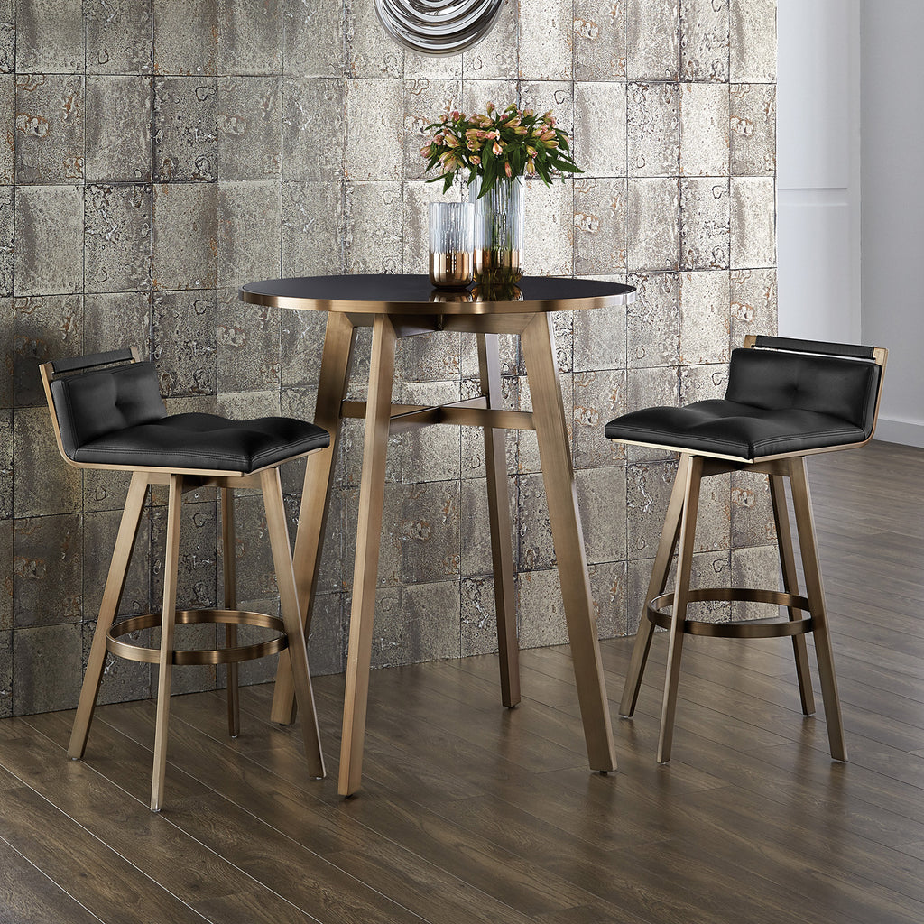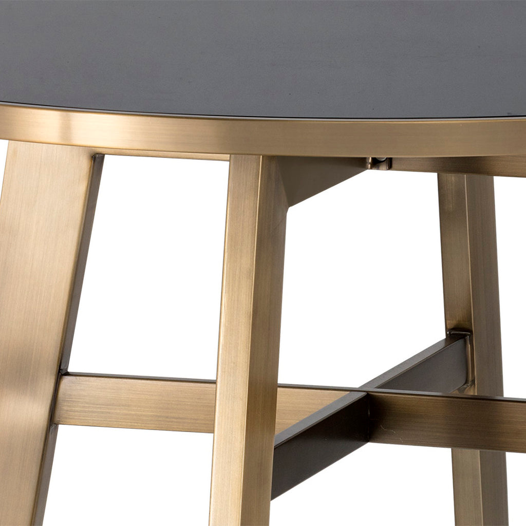 A stylish and sturdy bar table featuring an Art Deco inspired brushed antique brass frame with a tempered black glass top. A stunning addition to residential and commercial spaces.