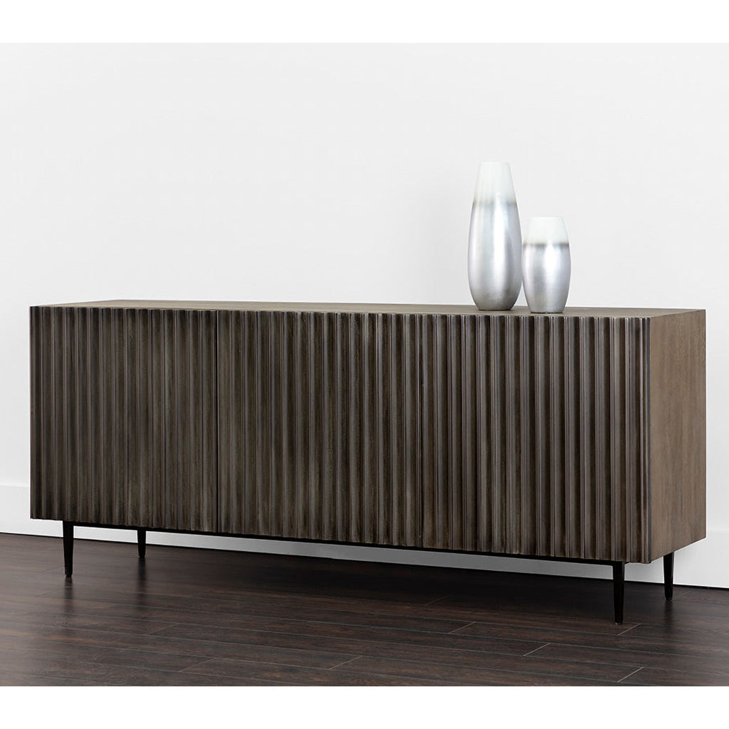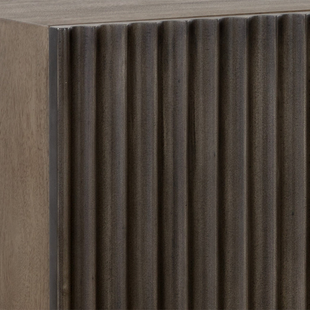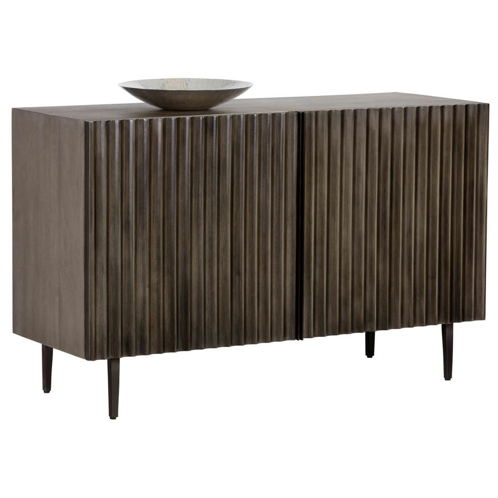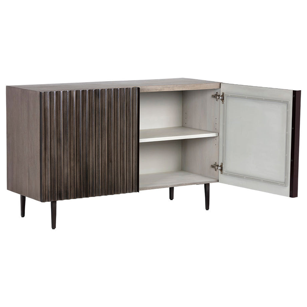 This bold sideboard will command attention through dining, living and lounge spaces. Features a grey mango wood frame with dramatic sculpted details on the face of the two cabinets. Steel legs complete the urban and contemporary look.
