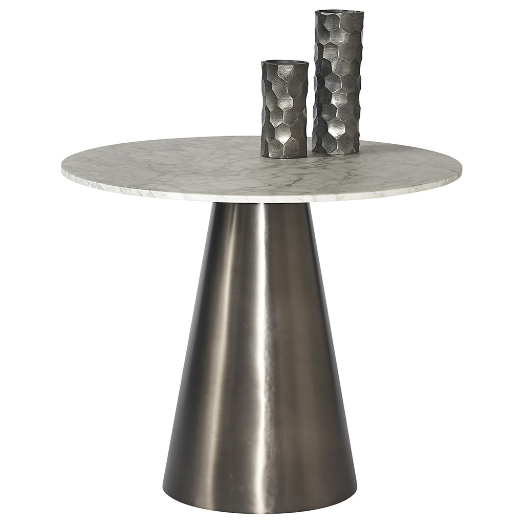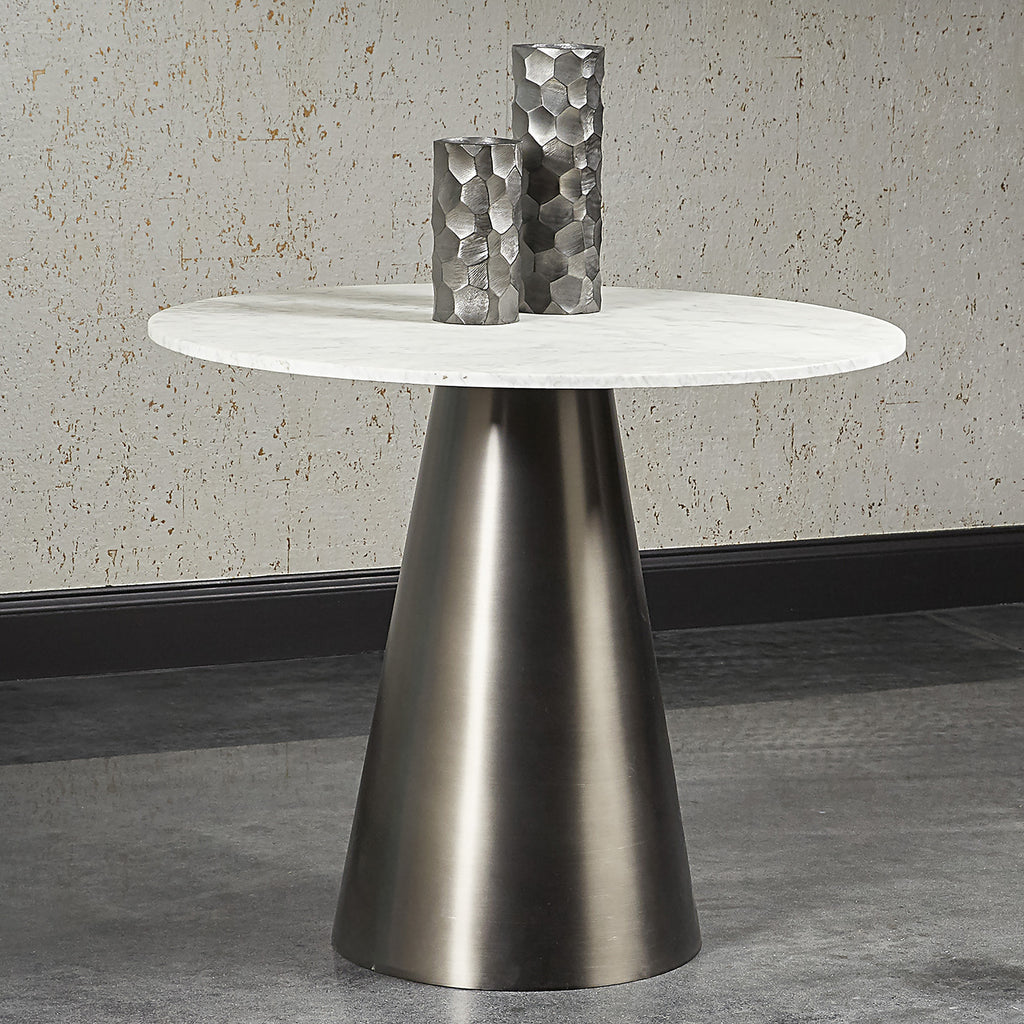 An absolutely stunning tapered bistro table. Crafted with a brushed gold or gunmetal finished base and a stunning matte white marble top to elevate any contemporary dining or lounge space.