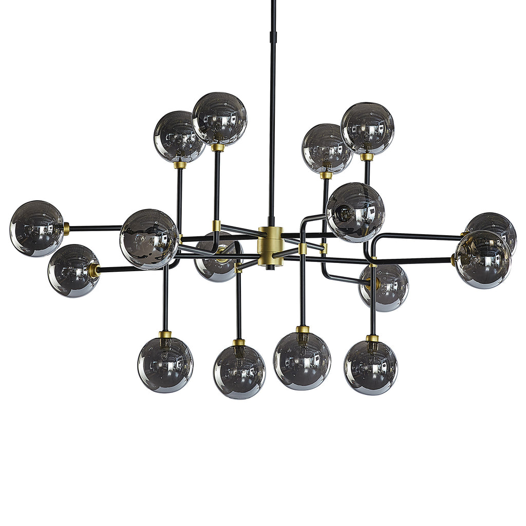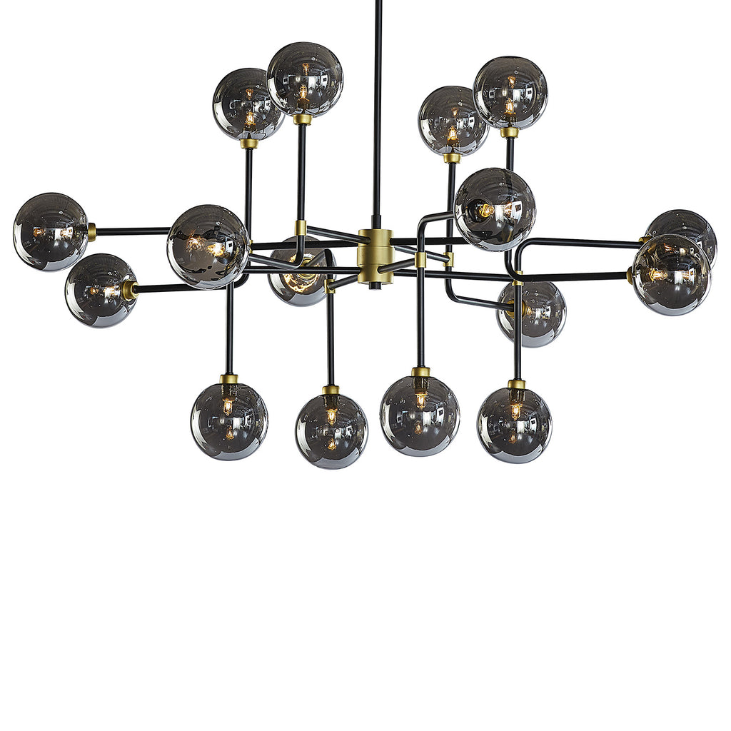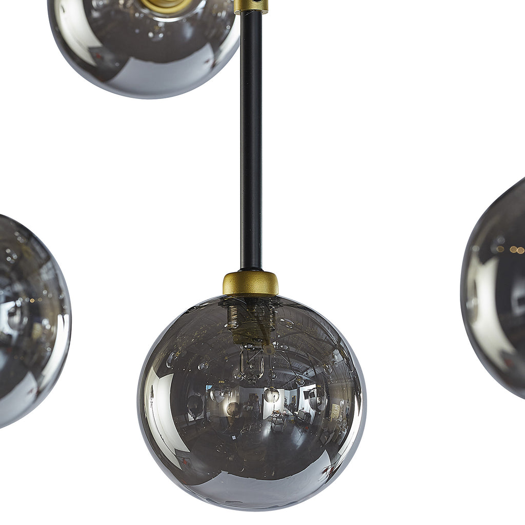 This modern ceiling light will create an alluring environment in living, lounge and dining spaces. Features black iron rods with gold hardware with smoke grey glass. Install multiples for a dramatic look.