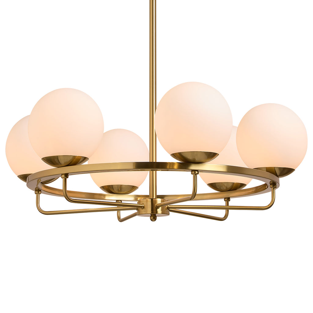 Elevate any space with this modern chandelier that is guaranteed to add brightness in a stylish manner. Features six white frosted glass shades in a metal wheel frame with a brass finish.
