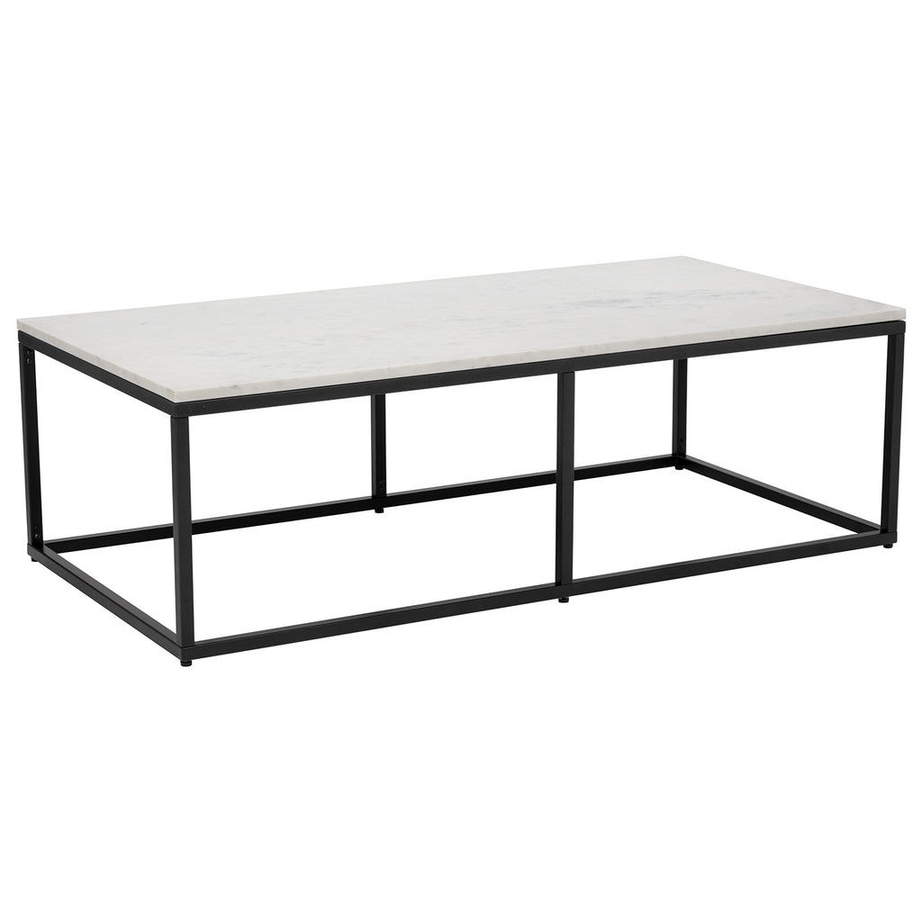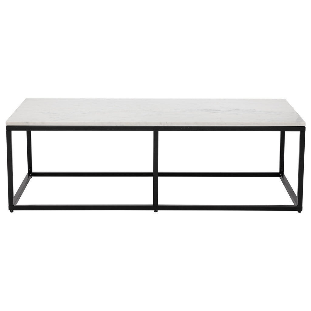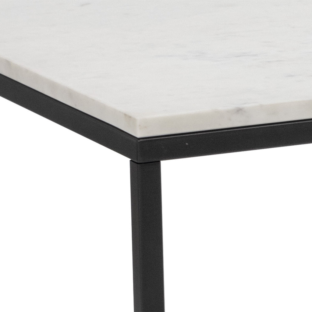 With an understated design, this modern coffee table is made distinct by clean lines. Features a white polished natural marble table top with a matte black powder coated steel base. Coordinating console and end tables also available. As marble is a natural material, unique veining, pitting, fissures, micro-cracks and colour variations are all characteristics that add to the uniqueness and beauty of each piece.