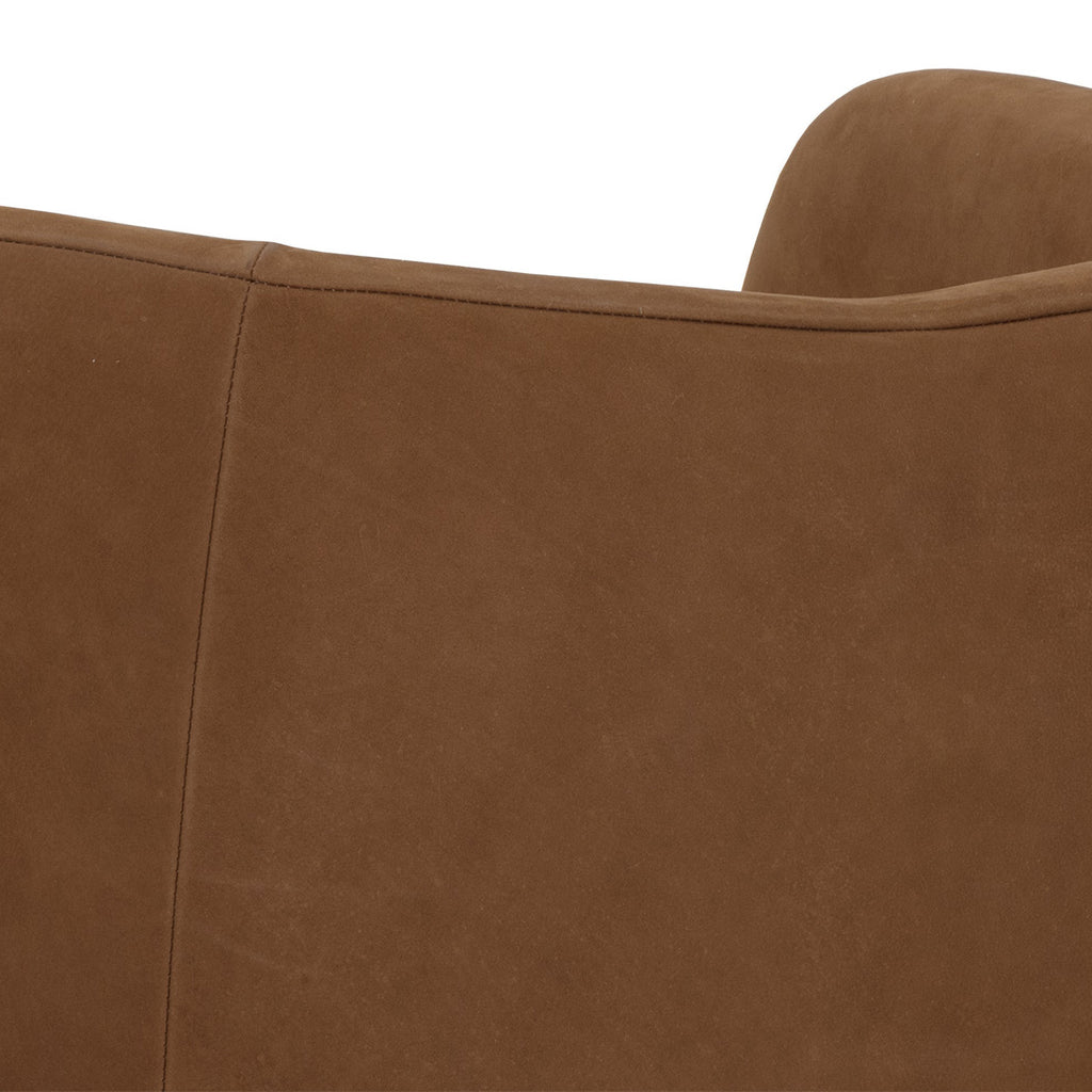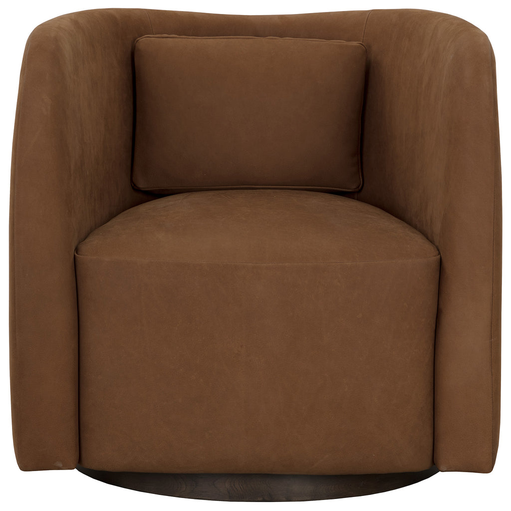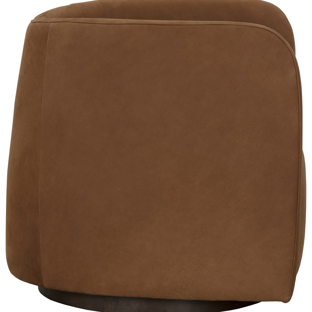 Experience ultimate comfort with the luxurious Emilie Swivel Lounge Chair. Features a well-defined rounded profile fully upholstered in nubuck caramel leather. A brown oak wood swivel base completes the look.