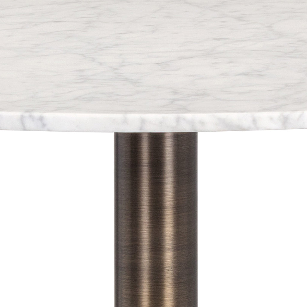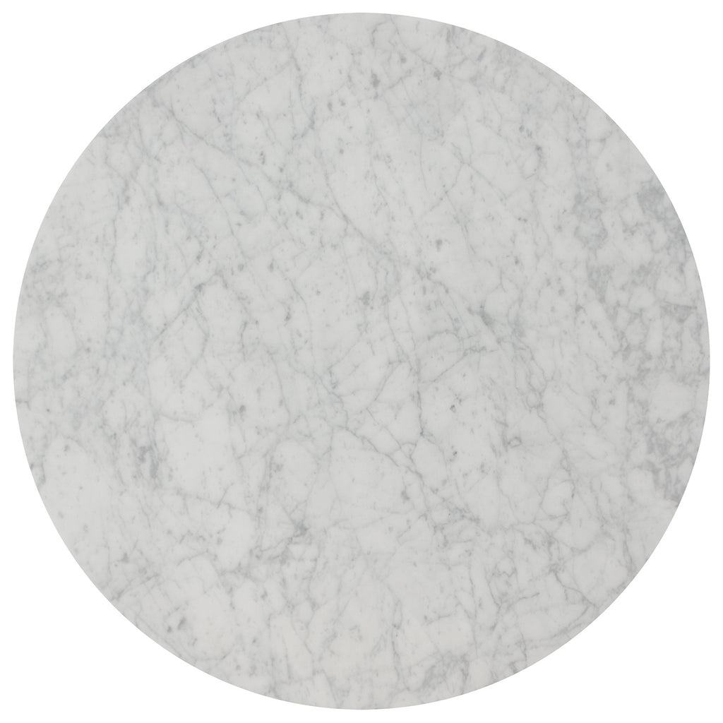 An Art Deco inspired round counter table, featuring a solid carrara marble top with an antique gold steel base. Perfect for bars, lounges and restaurants.
