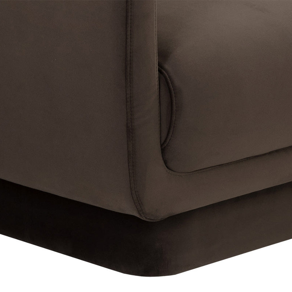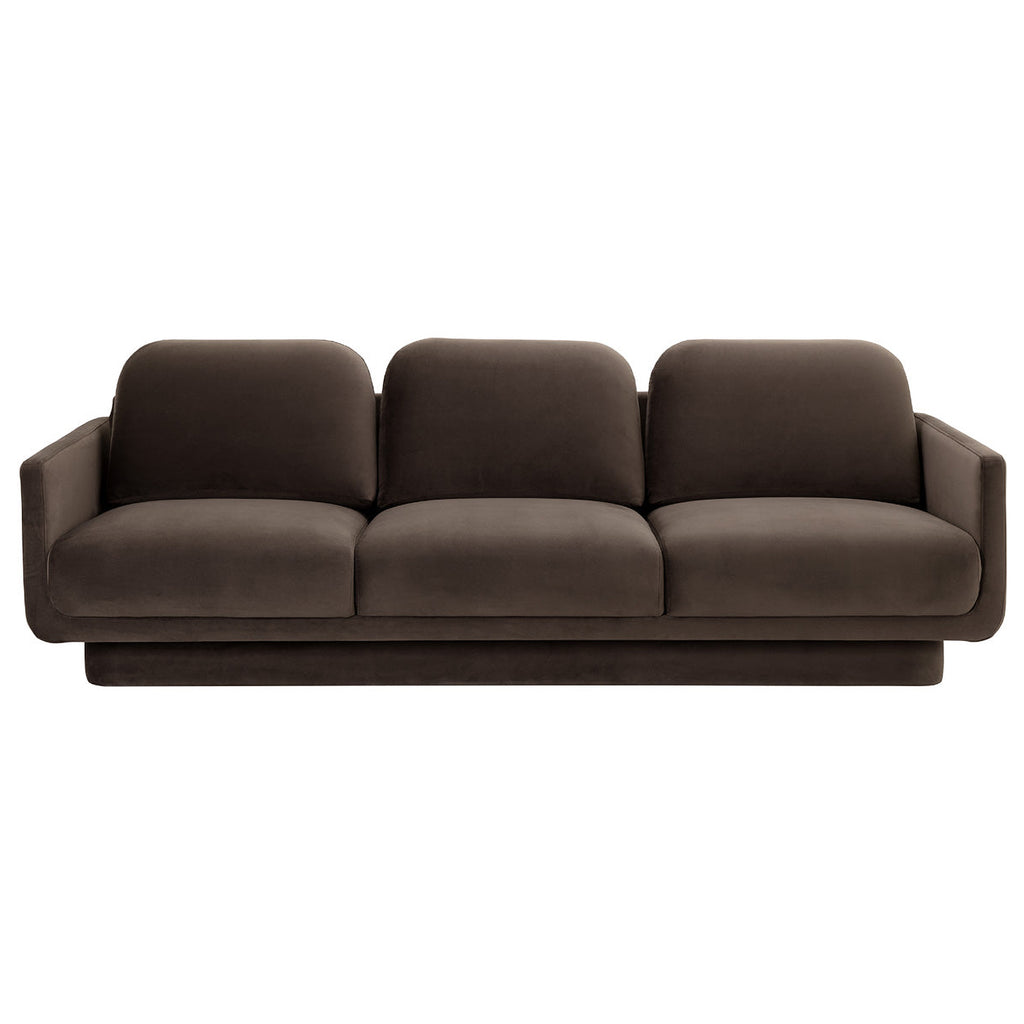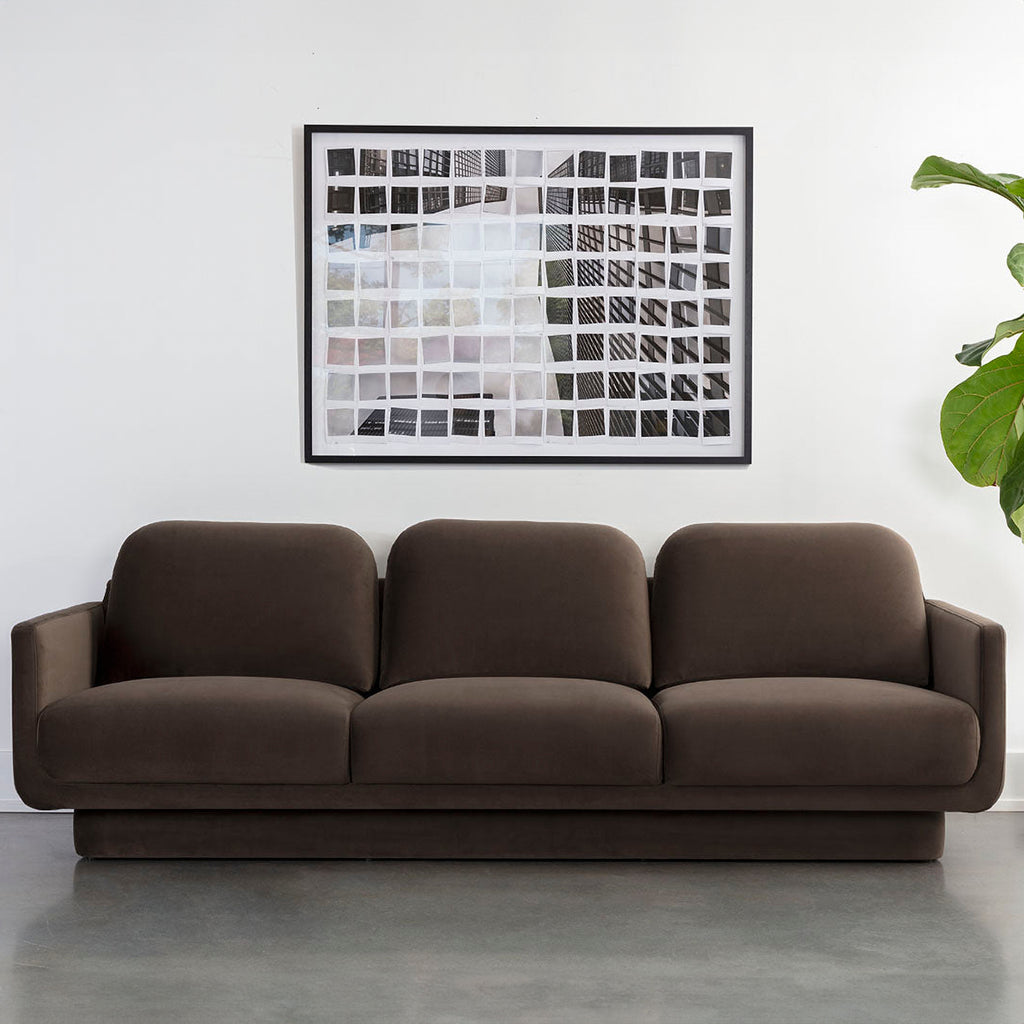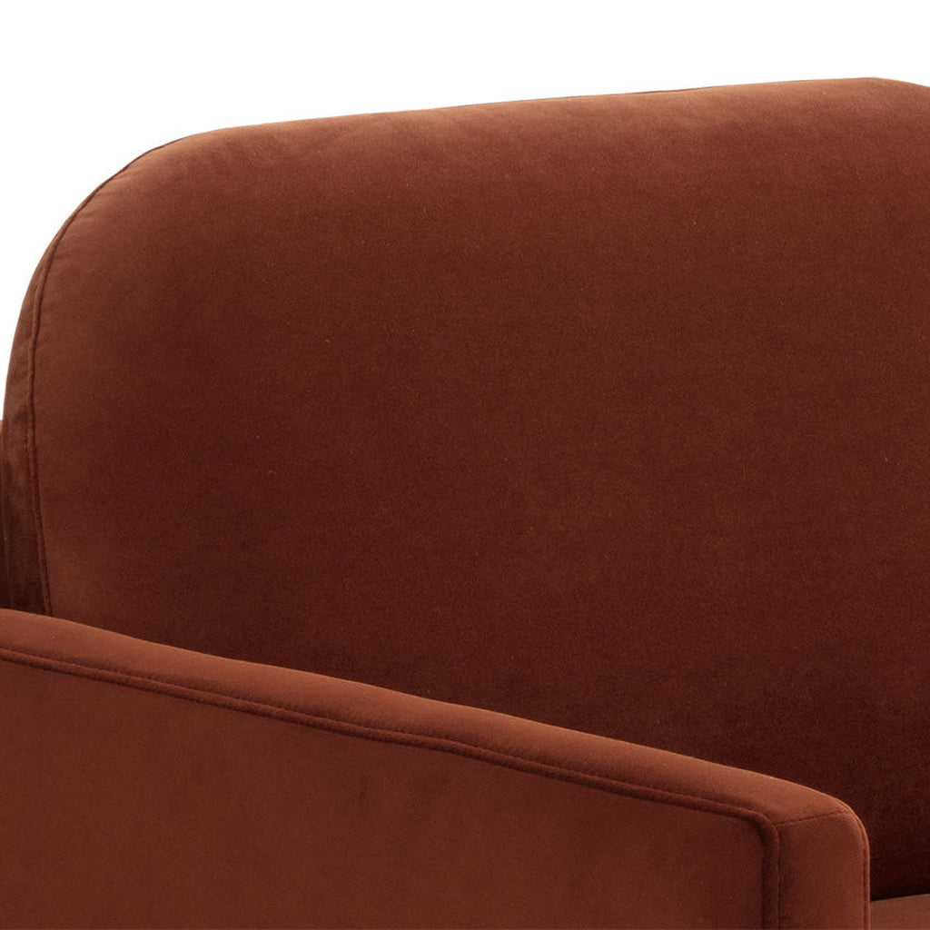 The Everton Sofa exudes classic comfort. Featuring a low profile with loose back cushions and rounded edges for a retro feel. This sofa is fully upholstered in smooth meg dark brown or rust fabric for an inviting design that will captivate in any setting.