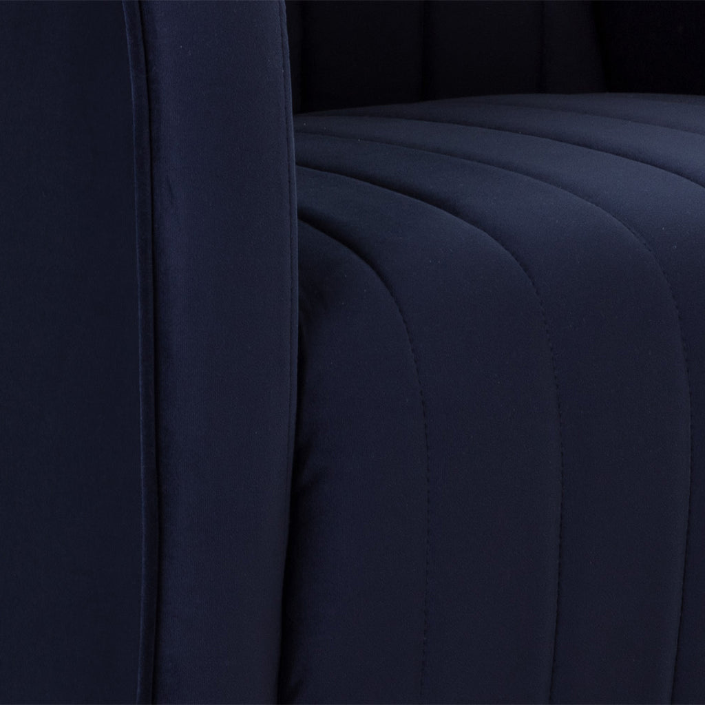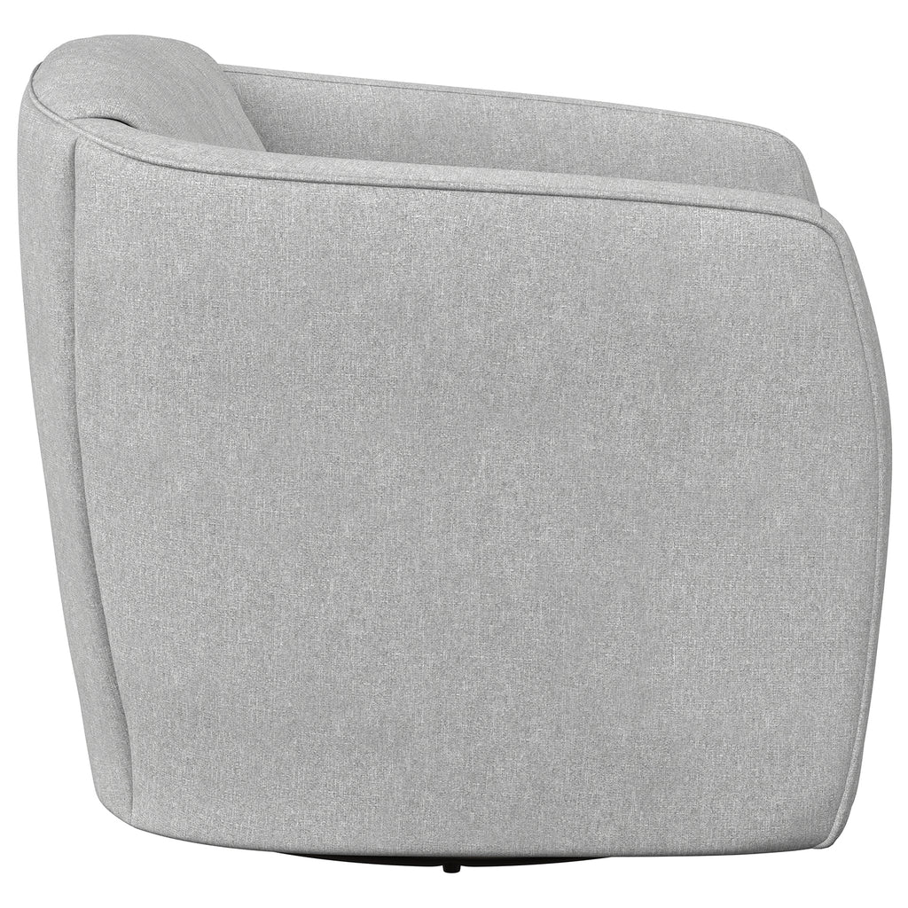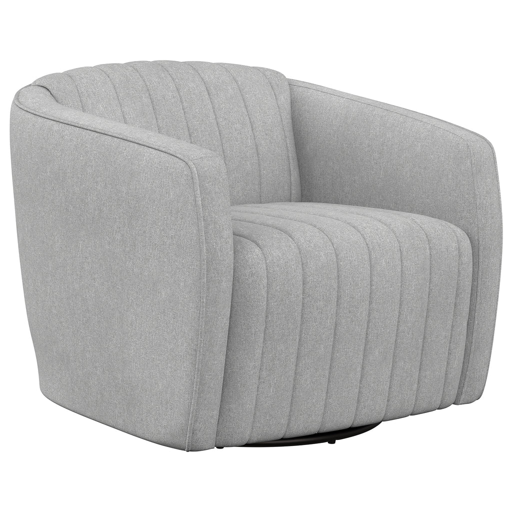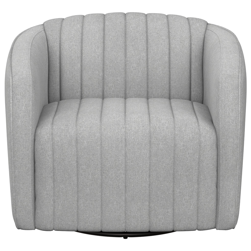 This modern swivel lounge chair boasts a timeless silhouette that is both stylish and comfortable. Features vertical channel tufting on the interior and a black powder coated steel base.