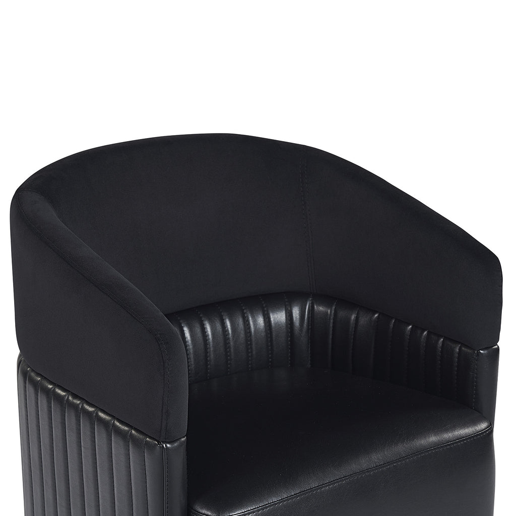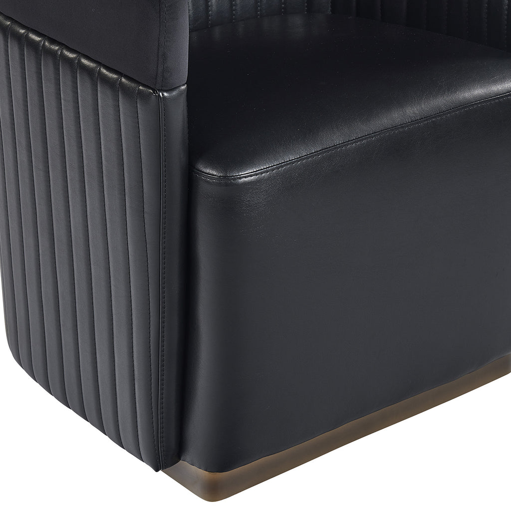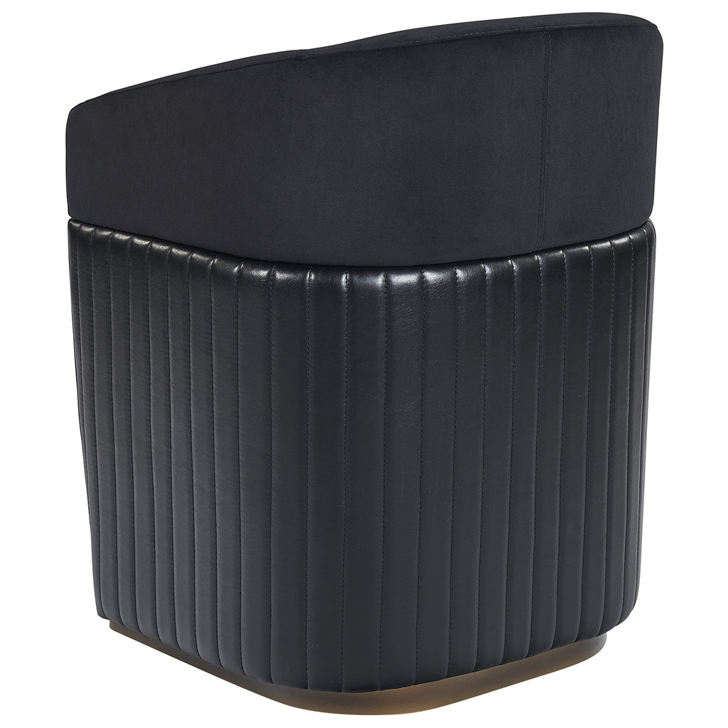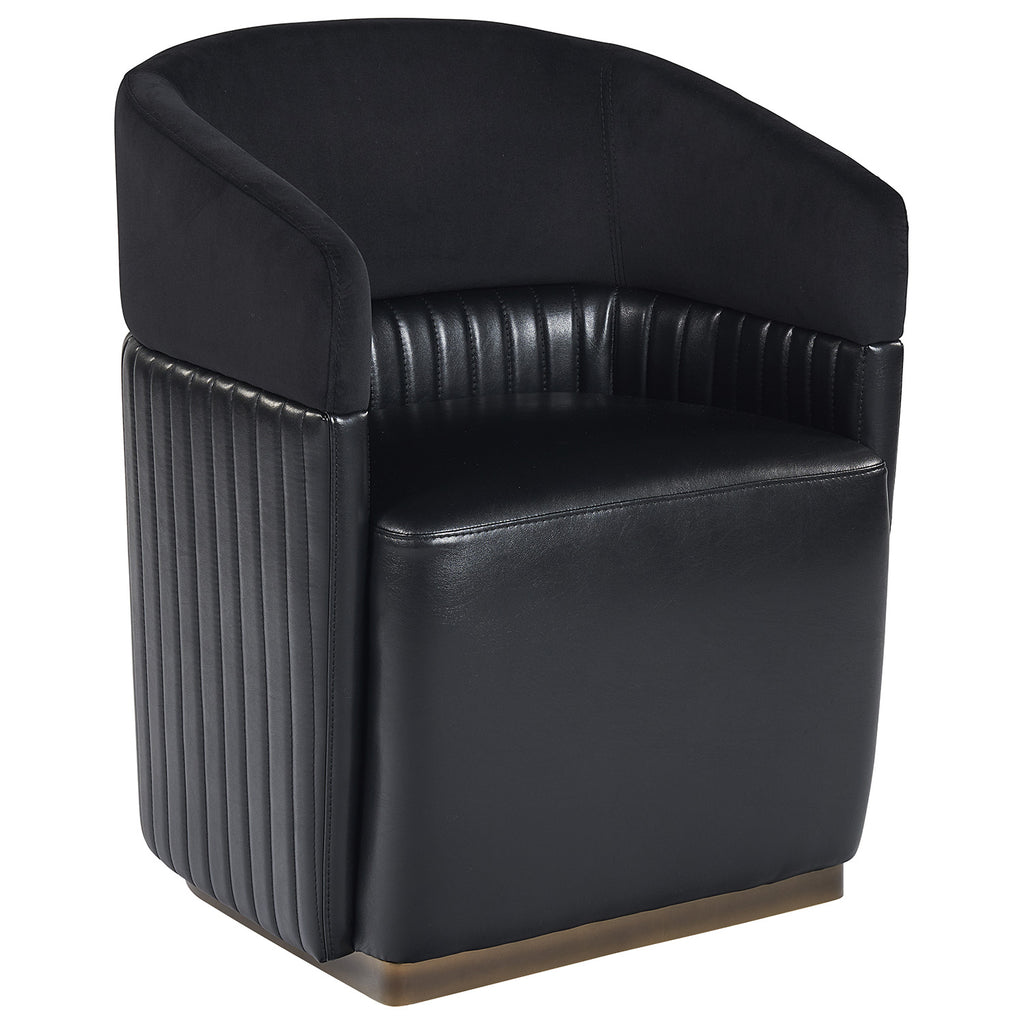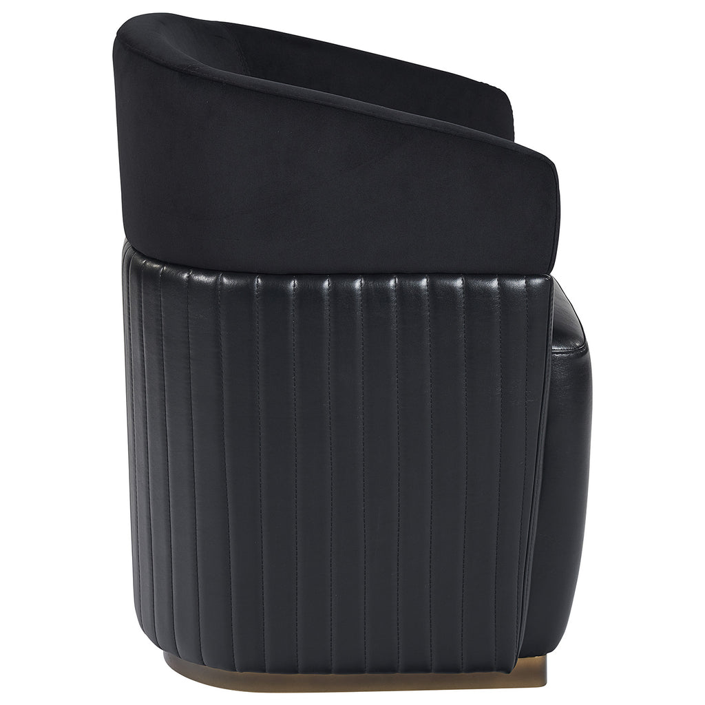 Guests will be intrigued by the unique design details found on this wheeled lounge chair. Designed with contemporary styling, this chair features a channel tufted seatback in abbington black fabric and cantina black bonded leather with a brass frame. es and light scratches are acceptable and appreciated characteristics. No two pieces are alike.
