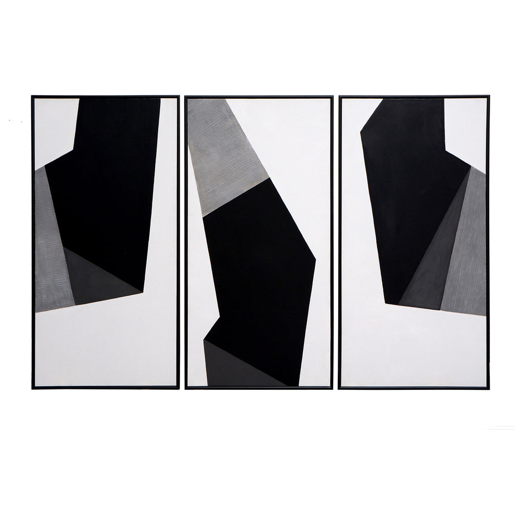 This triptych creates a lively, playful scene with black and gray geometric patterns. Perfect for contemporary spaces. Features black finished wood floater frames.