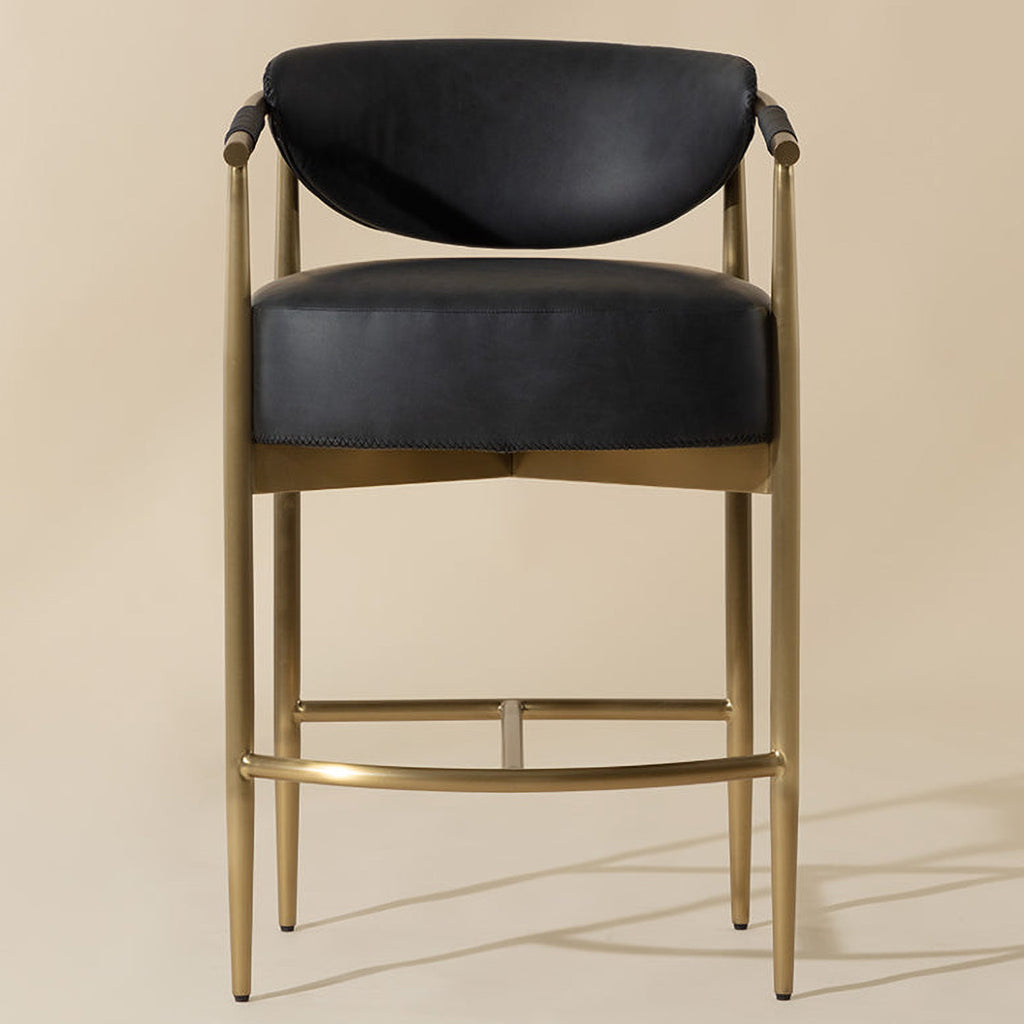 Every detail that makes up the handsome Heloise counter stool is designed with purpose. Milliken cognac or Cantina Black faux leather upholstery and rope detailing is paired with powder-coated gold stainless steel for optimal style and comfort. Visible stitching on the seat and backrest accentuates the chair's smooth contours. This elegant counter stool will perfectly complement any dining space. Handle With Care: This design has been crafted with faux leather. Faux leather is manufactured to reflect the natural characteristics of leather; as such, color variations, markings, wrinkles, grooves, and light scratches are appreciated characteristics. No two pieces will be alike. Visit our Product Care page for more information on how to ensure the lasting beauty of this piece.