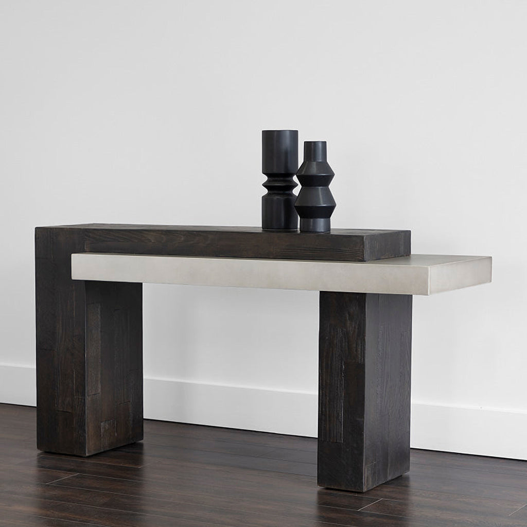 With an eye-catching design, this striking console table exudes an impressive contemporary style. Features a base crafted from light brown or dark brown concrete with a fascinating timber effect. Completed with an accenting summer sand concrete slab.