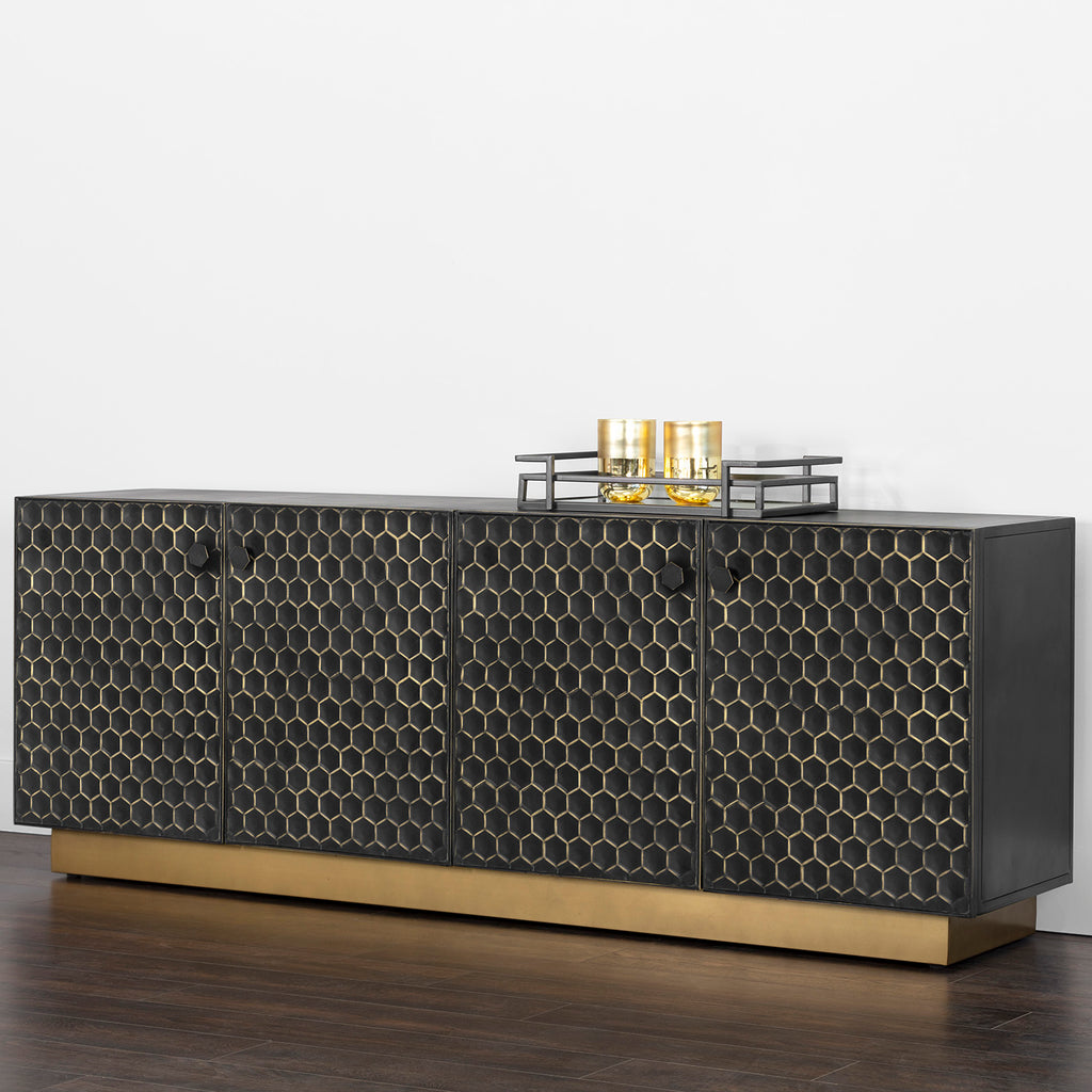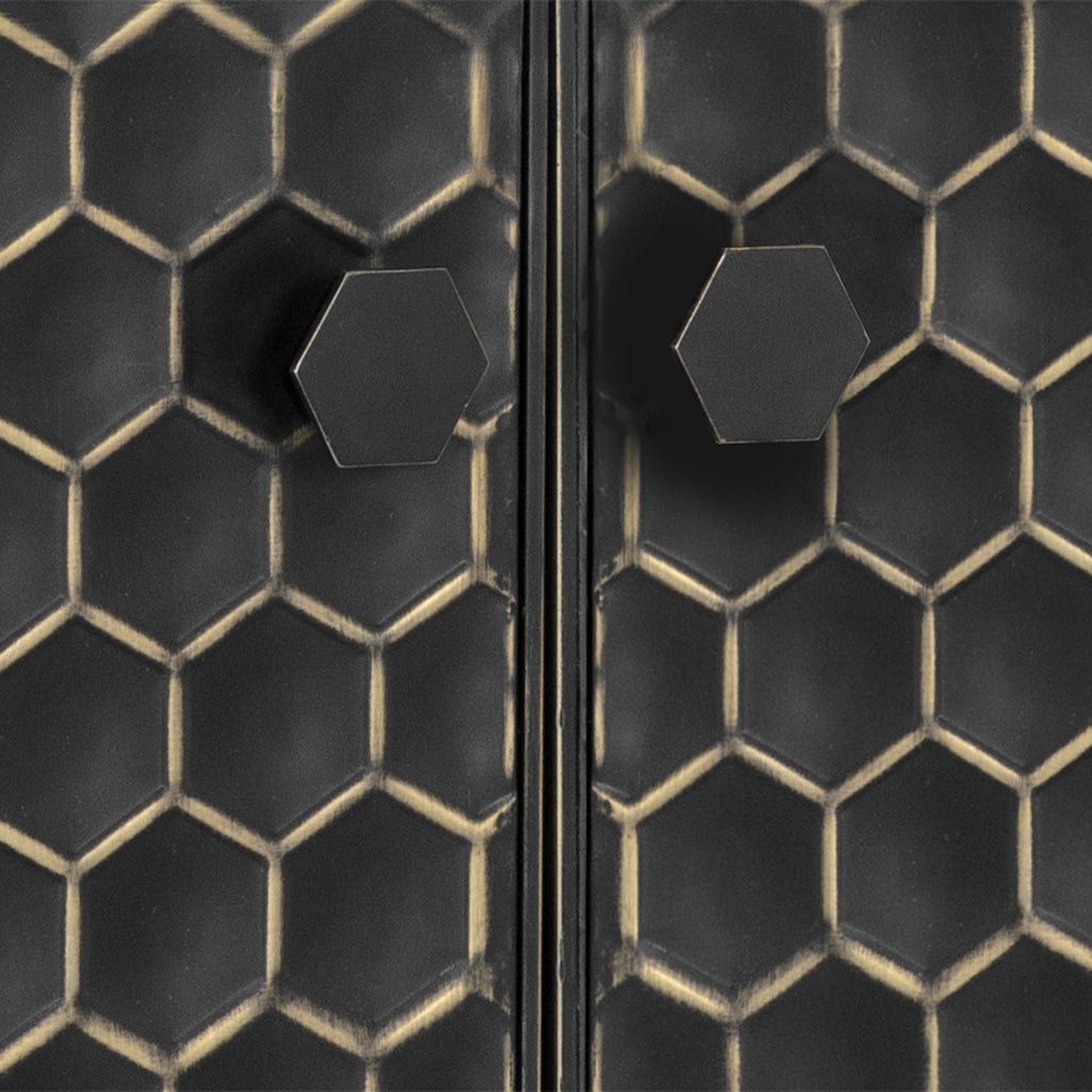 Crafted by local artisans, this bold sideboard features an eye-catching honeycomb pattern. The black iron cabinets are hand painted in a brass finish with varying pressure and strokes to bring unique dimension to each piece.