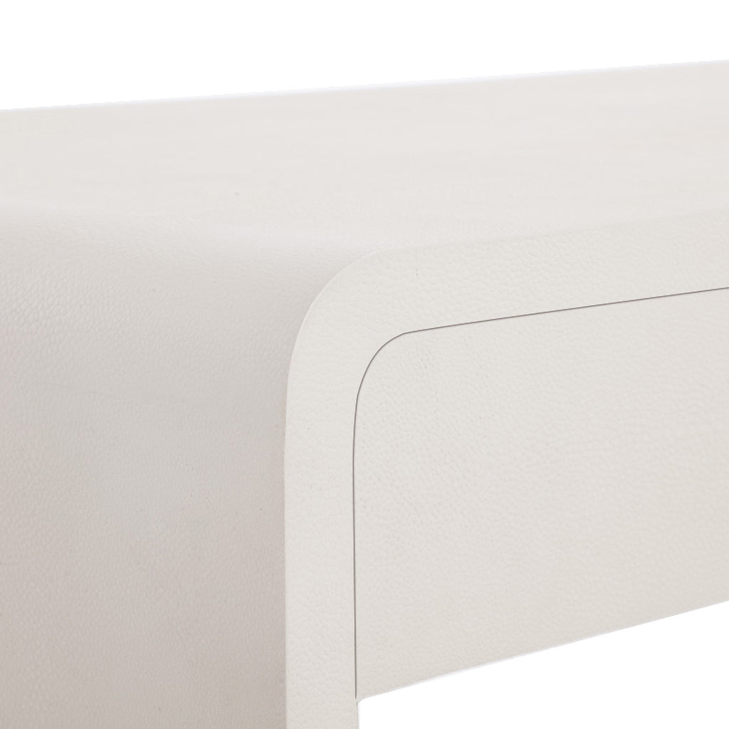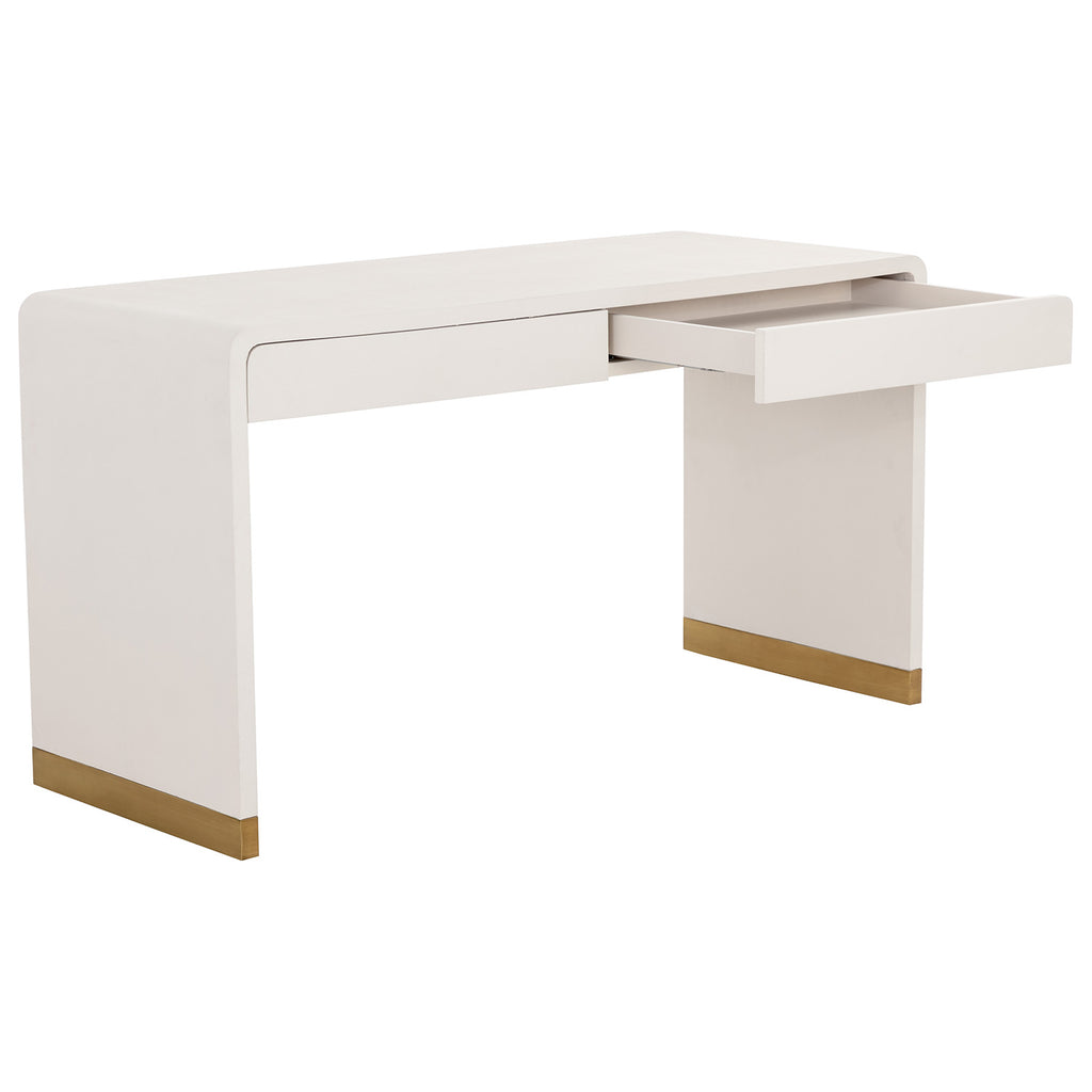 Reinvigorate any workspace with this contemporary desk that features a sleek, curved design. Crafted from a wooden base with an oyster shagreen bonded leather finish. Features two drawers and completed with an accenting antique brass iron base.