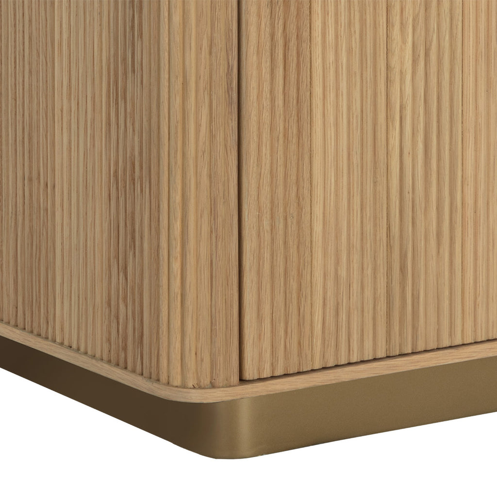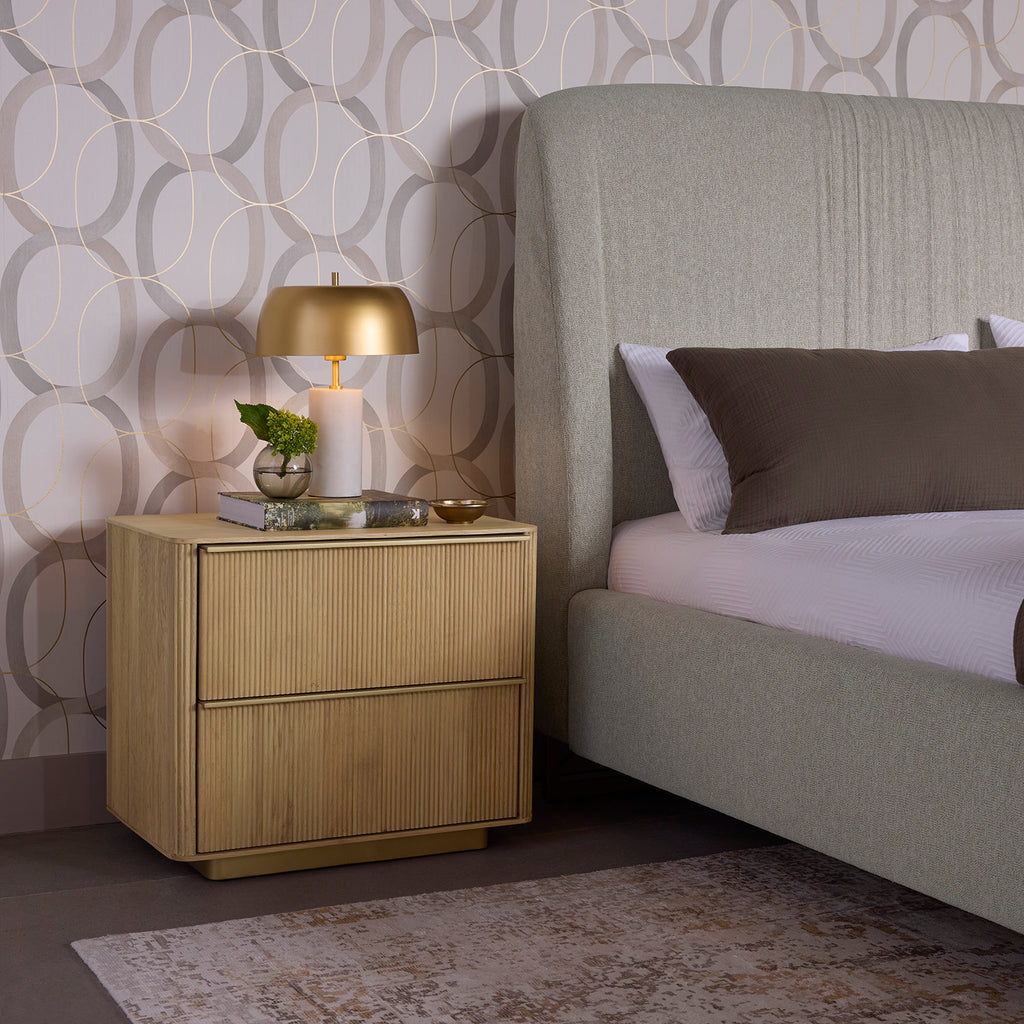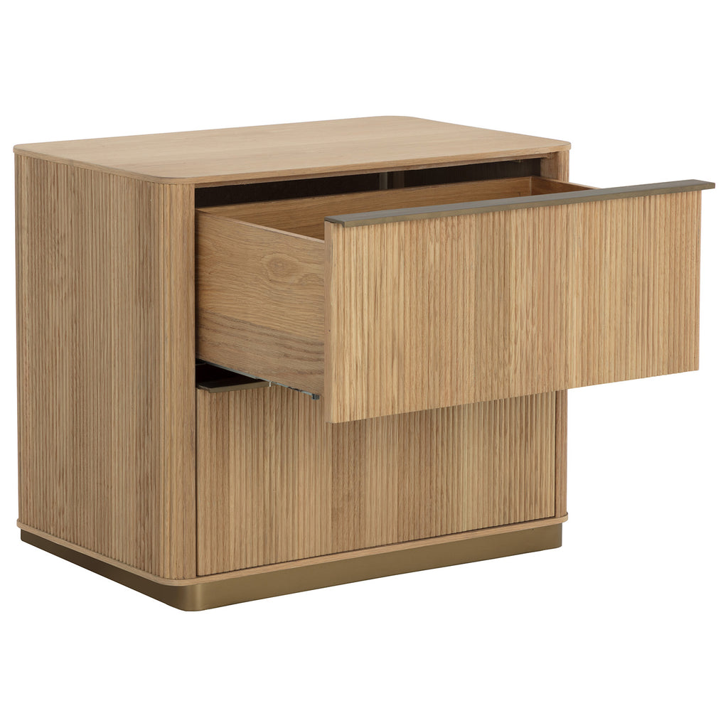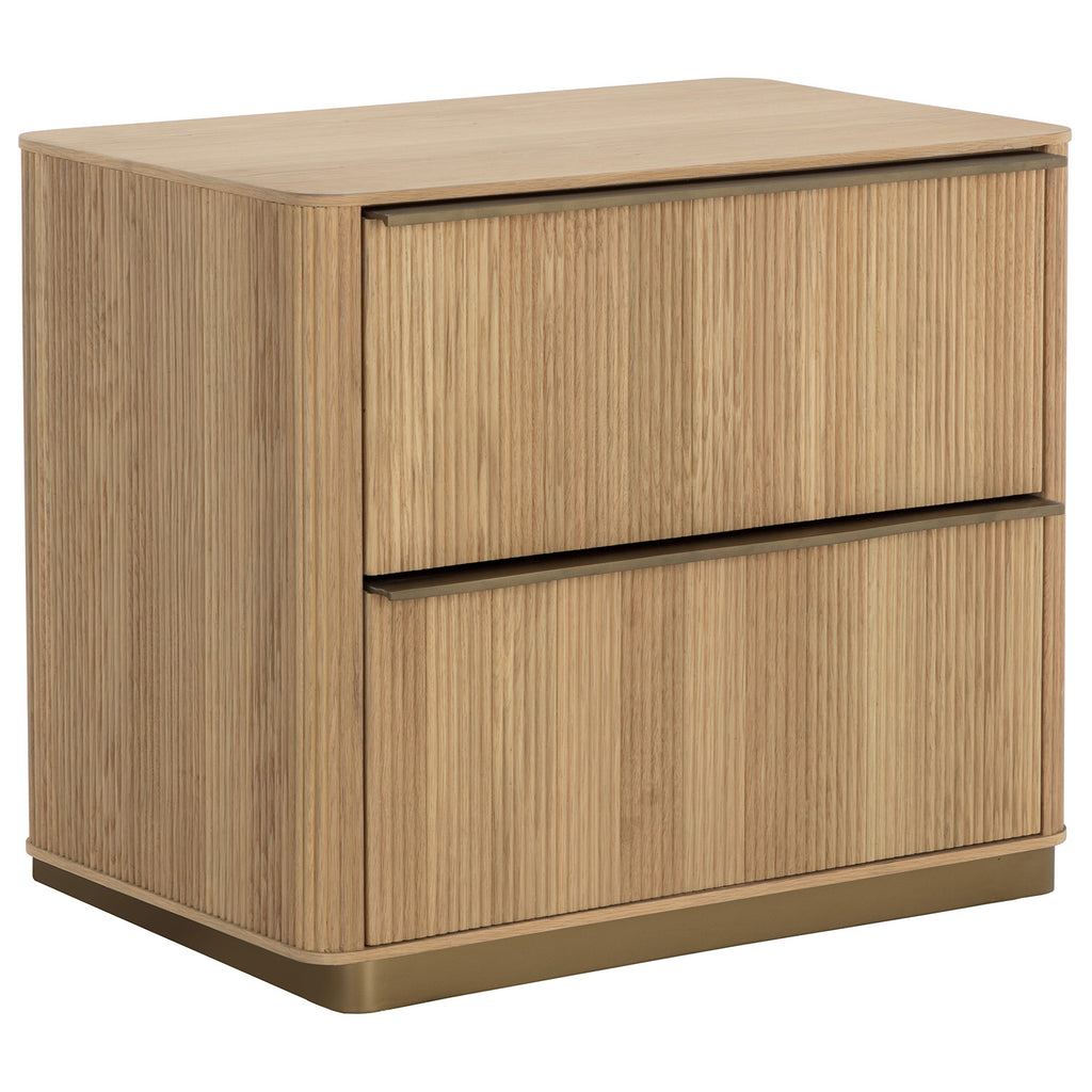 The Kalla Nightstand brings form and function to life. Crafted with a rustic oak veneer with vertical reeding. A gold steel base finishes the look.