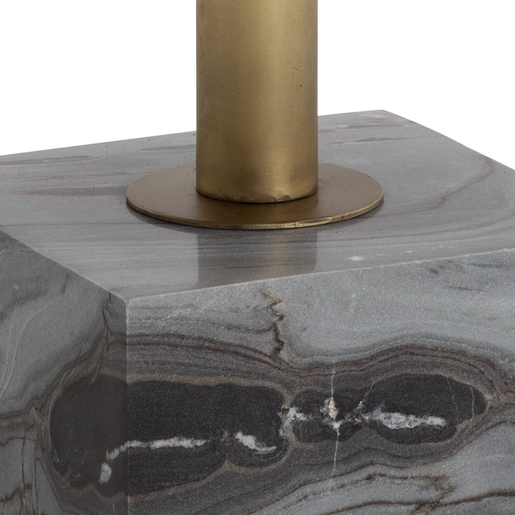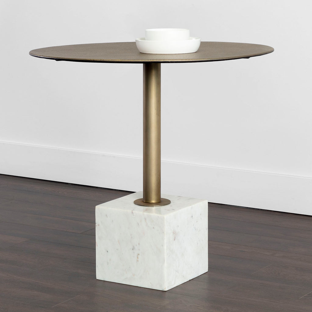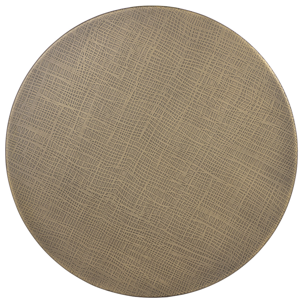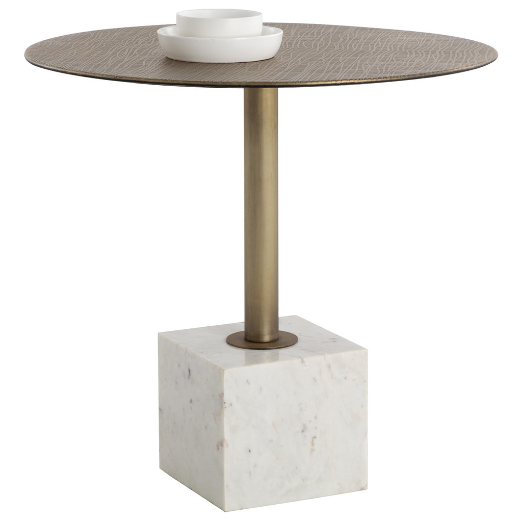 Add a touch of opulence to any space with this spectacular bistro table. Features a brushed antique brass frame with mesh patterning on the tabletop. Completed with a marble block base.