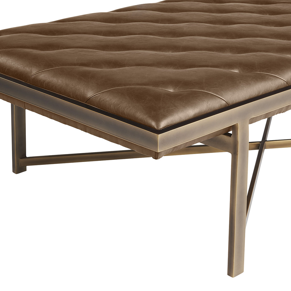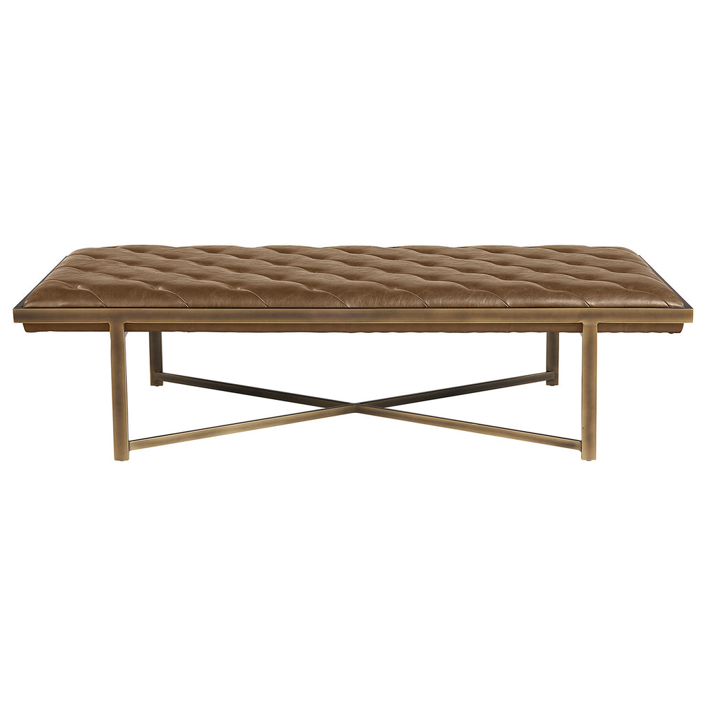 This large bench exudes opulent transitional style. Features diagonal tufting with an exposed x-base frame. Stocked in vintage black faux leather with an antique brass frame. Can be used as a daybed, coffee table or as extra seating in residential and commercial spaces.