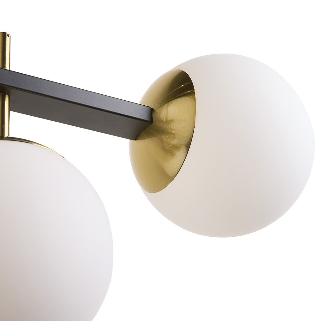 With a clean design that puts mesmerizing lines in focus, this modern chandelier is effortlessly stylish. Features five white frosted glass shades with a matte black metal frame. Accenting gold plates complete the look.