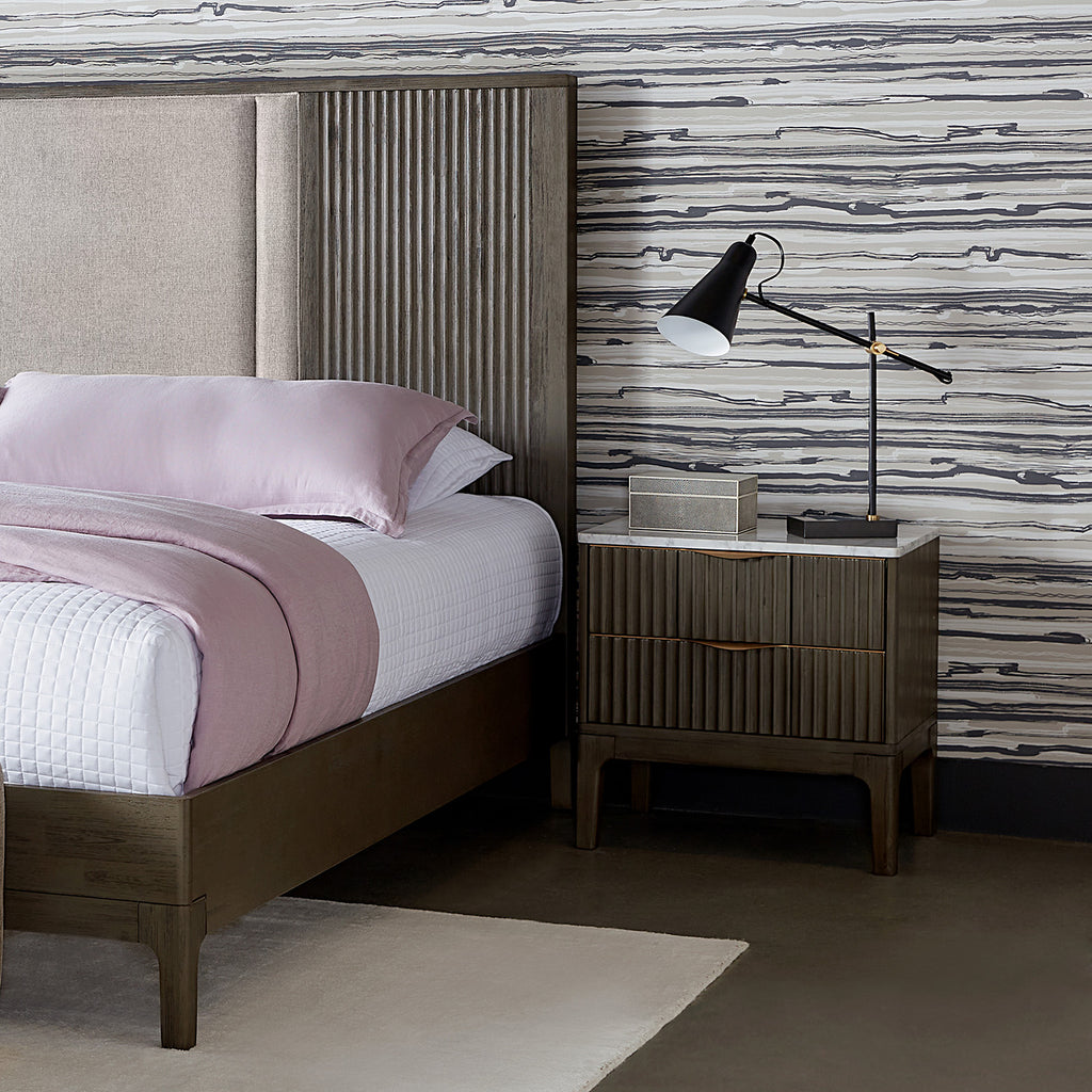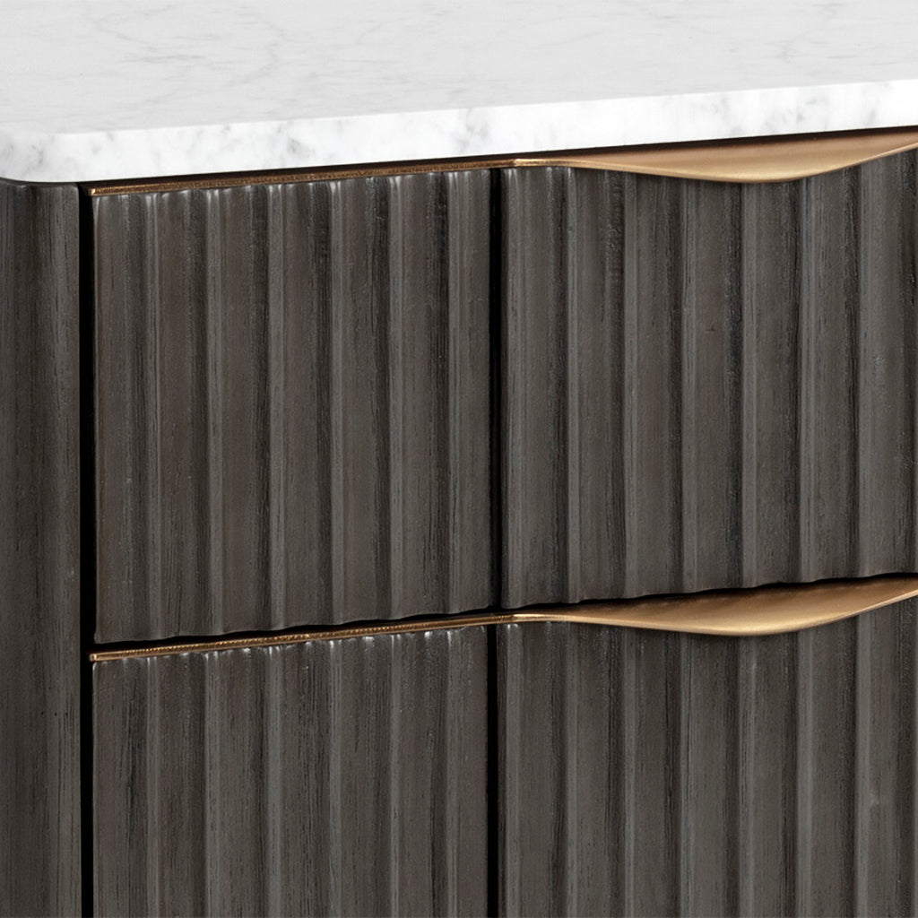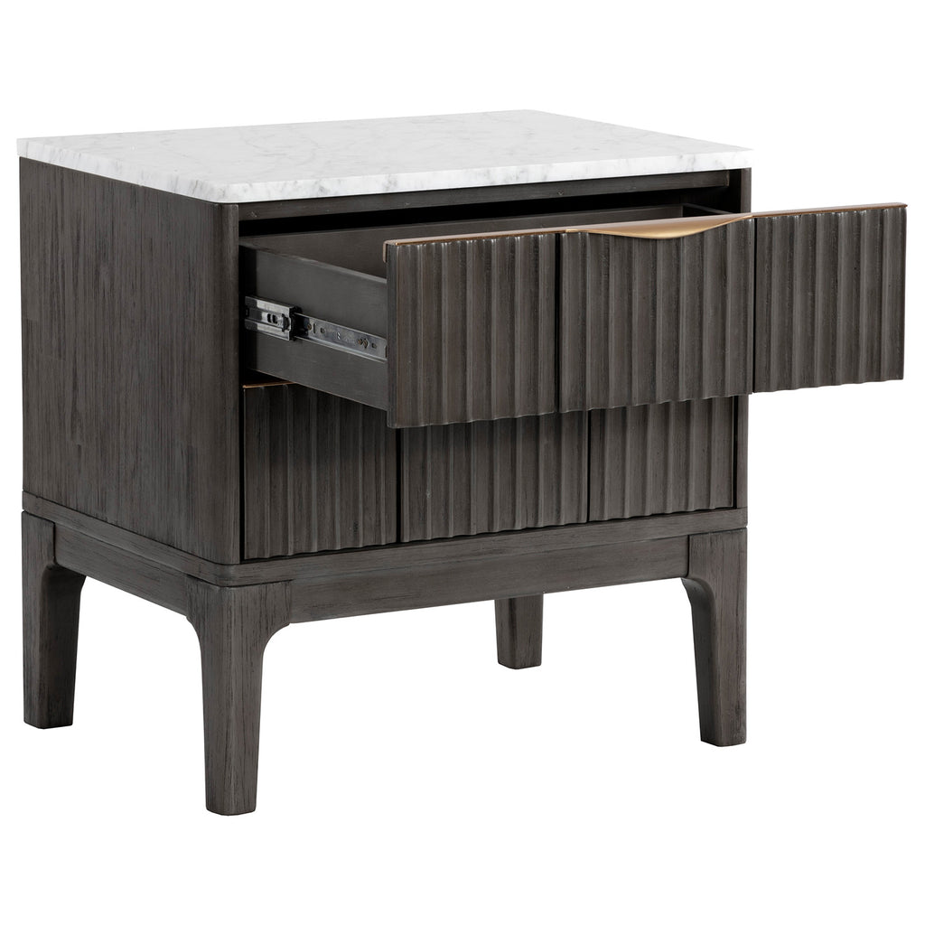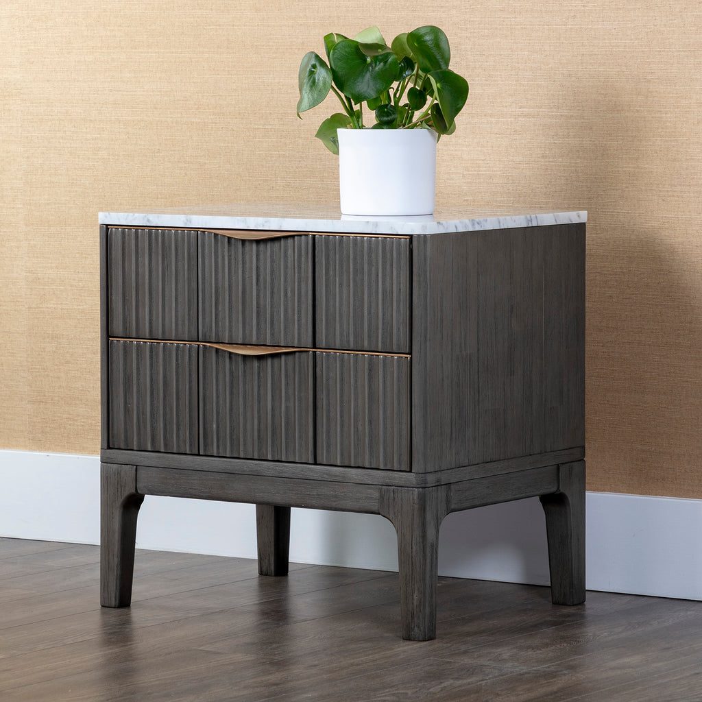 A sculpted two drawer nightstand with a sleek modern appeal. Features a white marble top paired with a sturdy acacia wood base in a brushed grey finish. Completed with brushed metal handles.