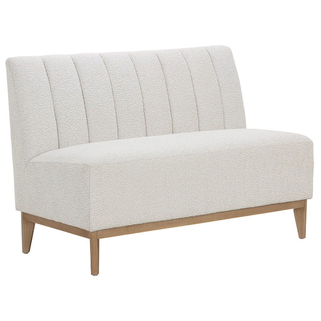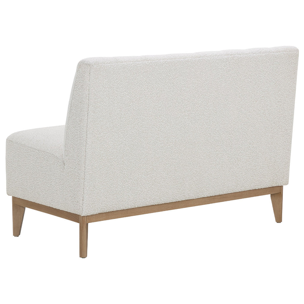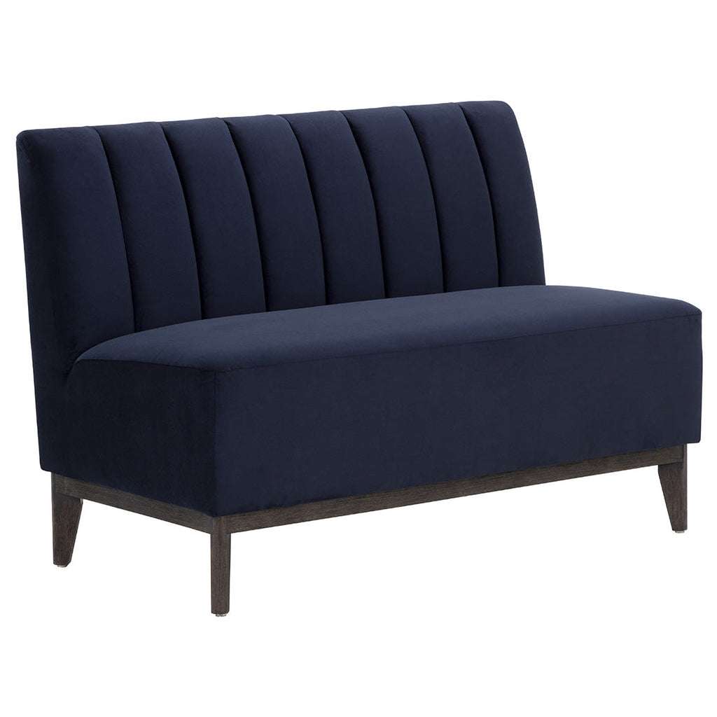Elegantly designed, the Kosovo Banquette exudes luxe comfort. Upholstered in abbington navy fabric with vertical tufting or copenhagen white boucle fabric, and completed with brown birch wood legs. As wood is an organic, porous material, these pieces will contain natural variation of texture and may also exhibit fine indentations and cracks. Wood pieces will also display a disparity of color and grain, and visible knots and burls that add to the character of each piece.