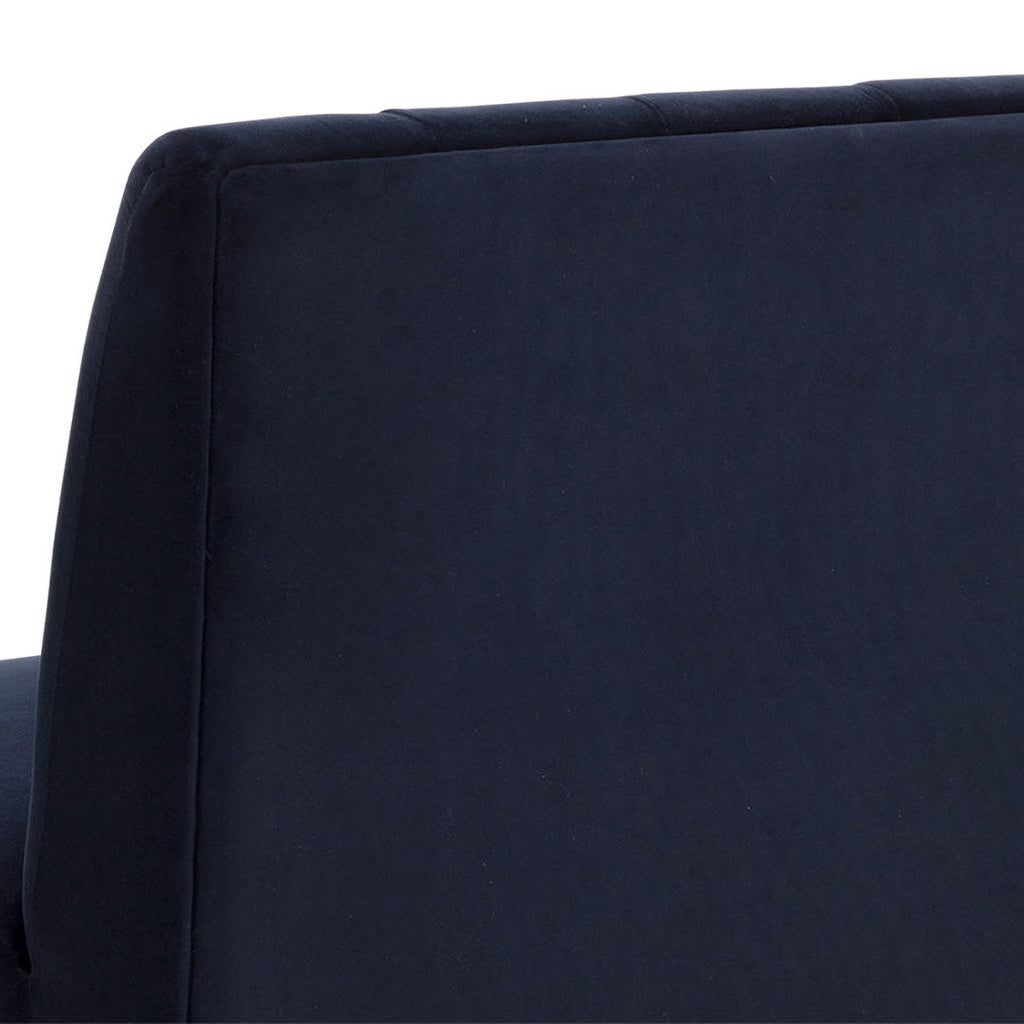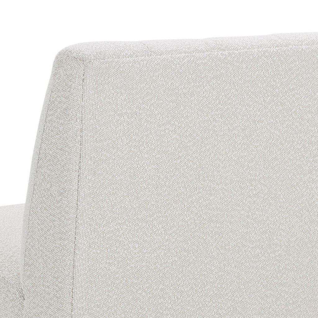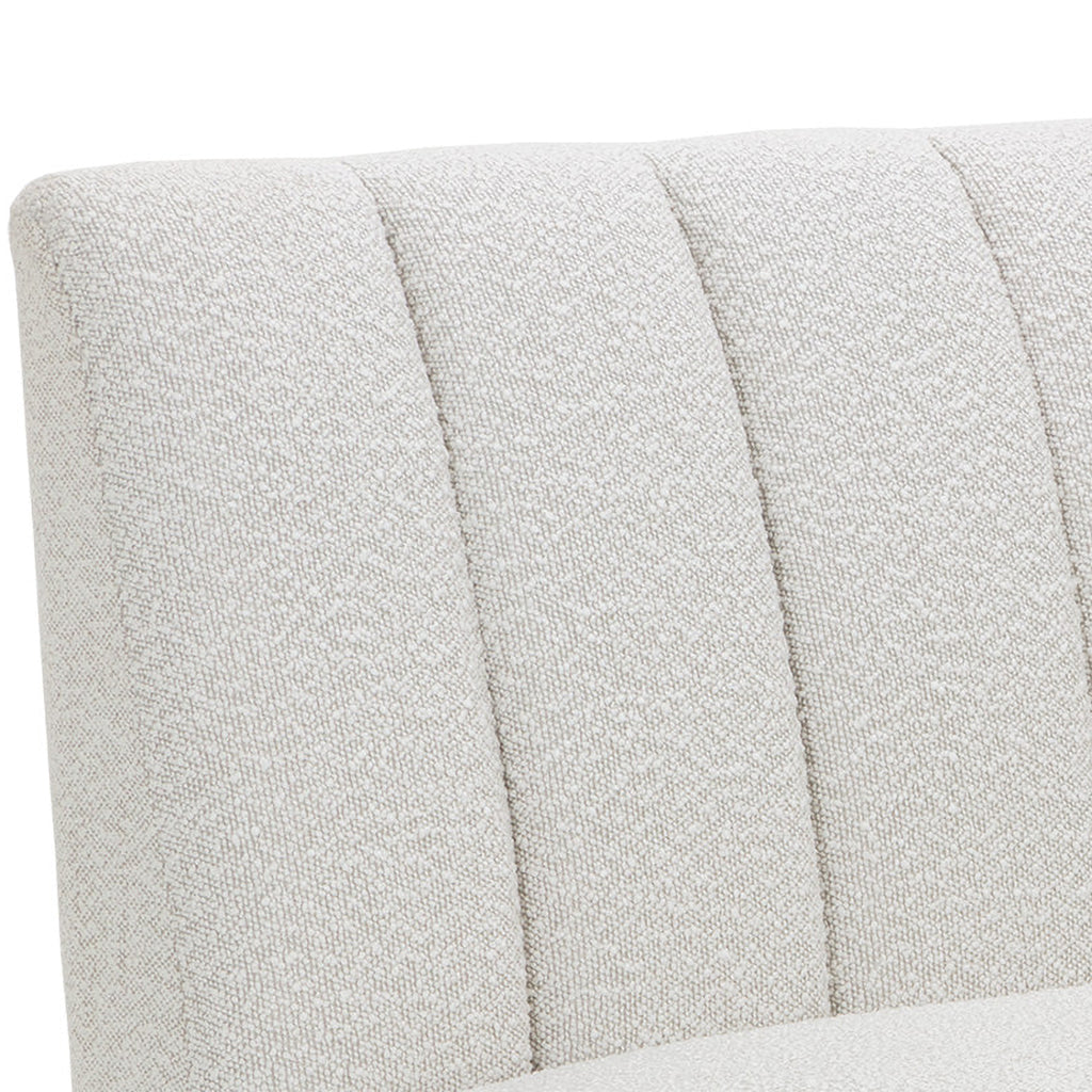 Elegantly designed, the Kosovo Banquette exudes luxe comfort. Upholstered in abbington navy fabric with vertical tufting or copenhagen white boucle fabric, and completed with brown birch wood legs. As wood is an organic, porous material, these pieces will contain natural variation of texture and may also exhibit fine indentations and cracks. Wood pieces will also display a disparity of color and grain, and visible knots and burls that add to the character of each piece.