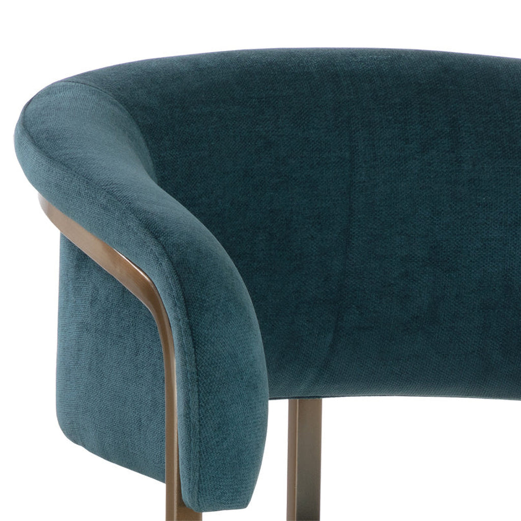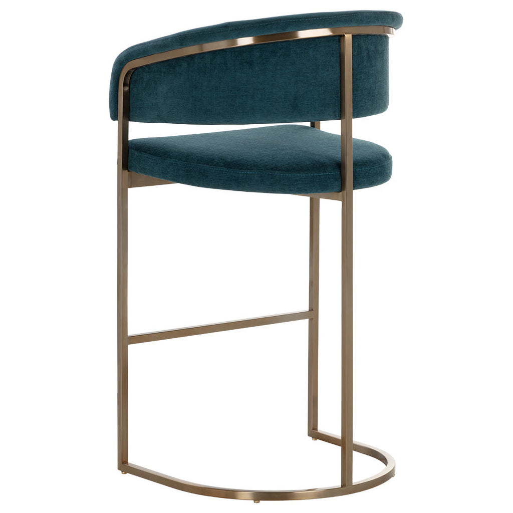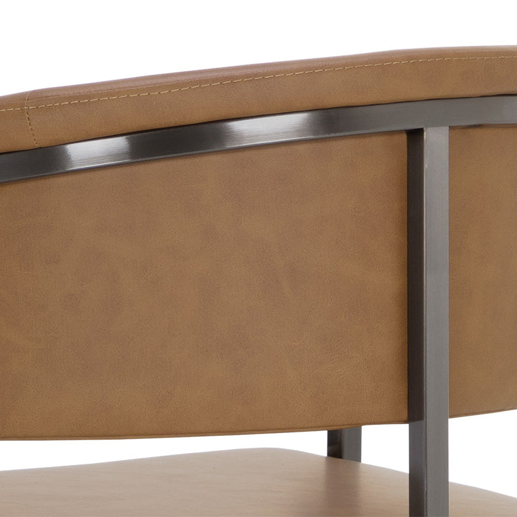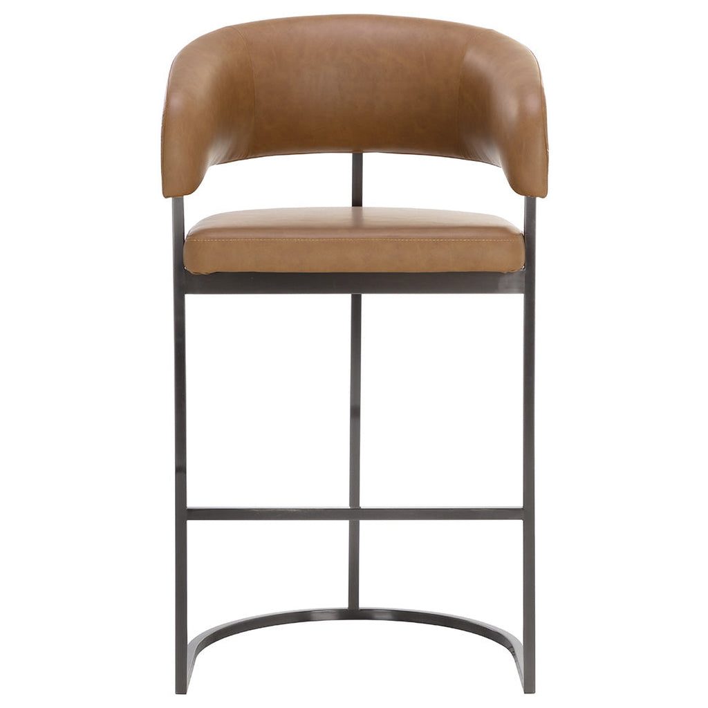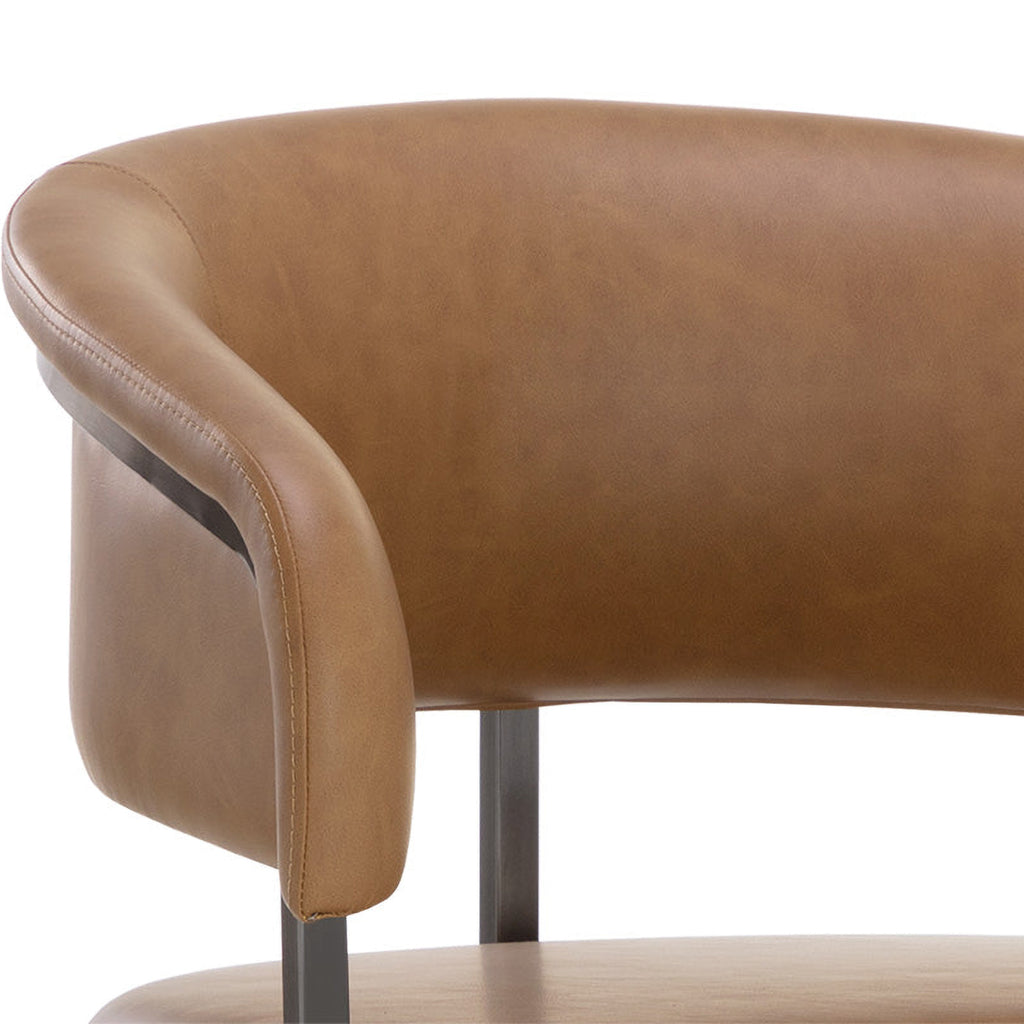 Uniting the beauty of sleek modern design with timeless elegance, the Marris Barstool is a great addition to any dining space. Stocked in smooth milliken cognac faux leather or Danny Teal fabric and completed with a cantilever frame in a gunmetal stainless steel finish. Handle With Care: This design has been crafted with faux leather. Faux leather is manufactured to reflect the natural characteristics of leather; as such, color variations, markings, wrinkles, grooves, and light scratches are appreciated characteristics. No two pieces will be alike. Visit our Product Care page for more information on how to ensure the lasting beauty of this piece.