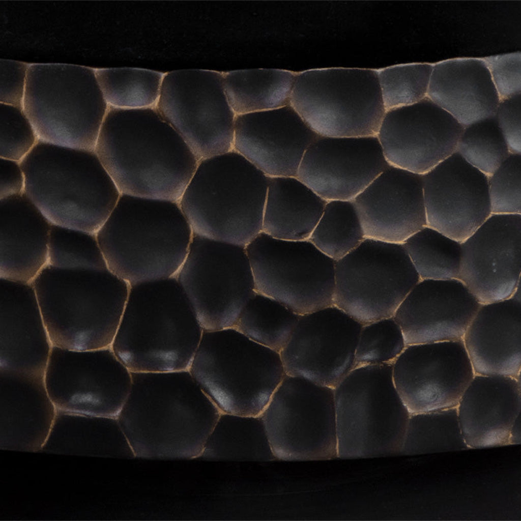 Accentuate any dining area with the stunning Mersin Dining Table. Constructed from black glass fibre-reinforced concrete, this piece has a remarkable hand-hammered design on the table top and base. Brass colored accents emphasize the textured look.