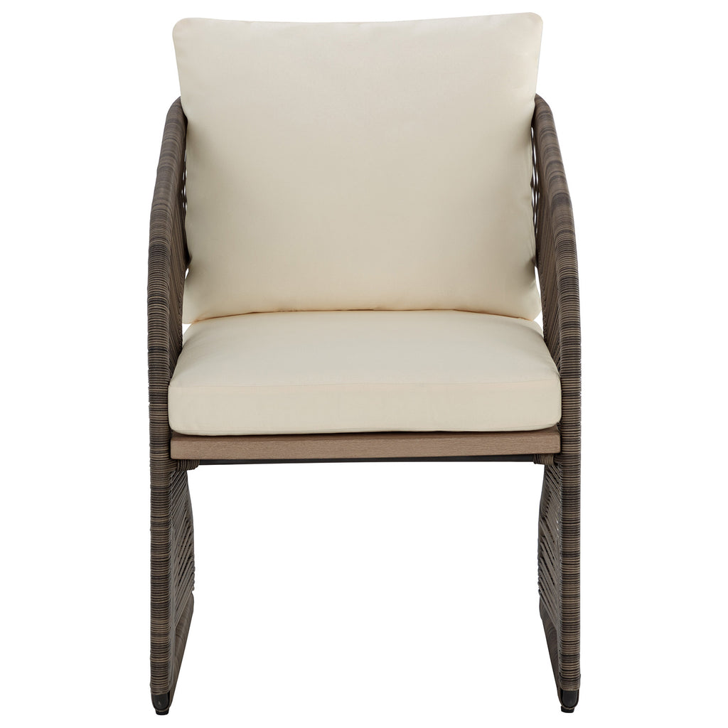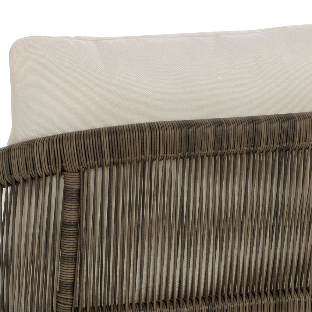 The Toulon Lounge Chair effortlessly combines sculptural shapes with an airy modern design. Featuring bold sweeping curves made from ore gray polyrod on a black aluminum frame. Comfortable cushioning upholstered in stinson cream fabric rests atop drift brown teak wood seat.