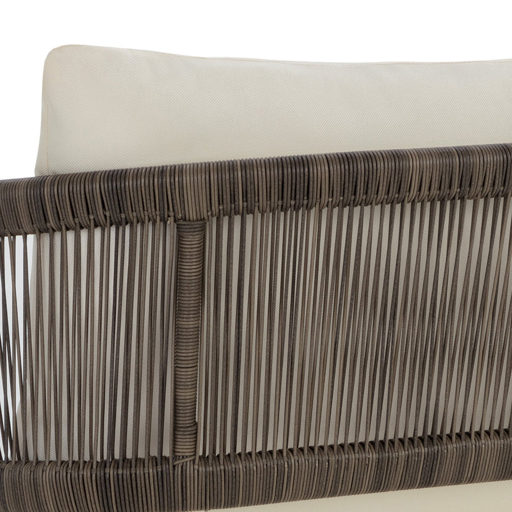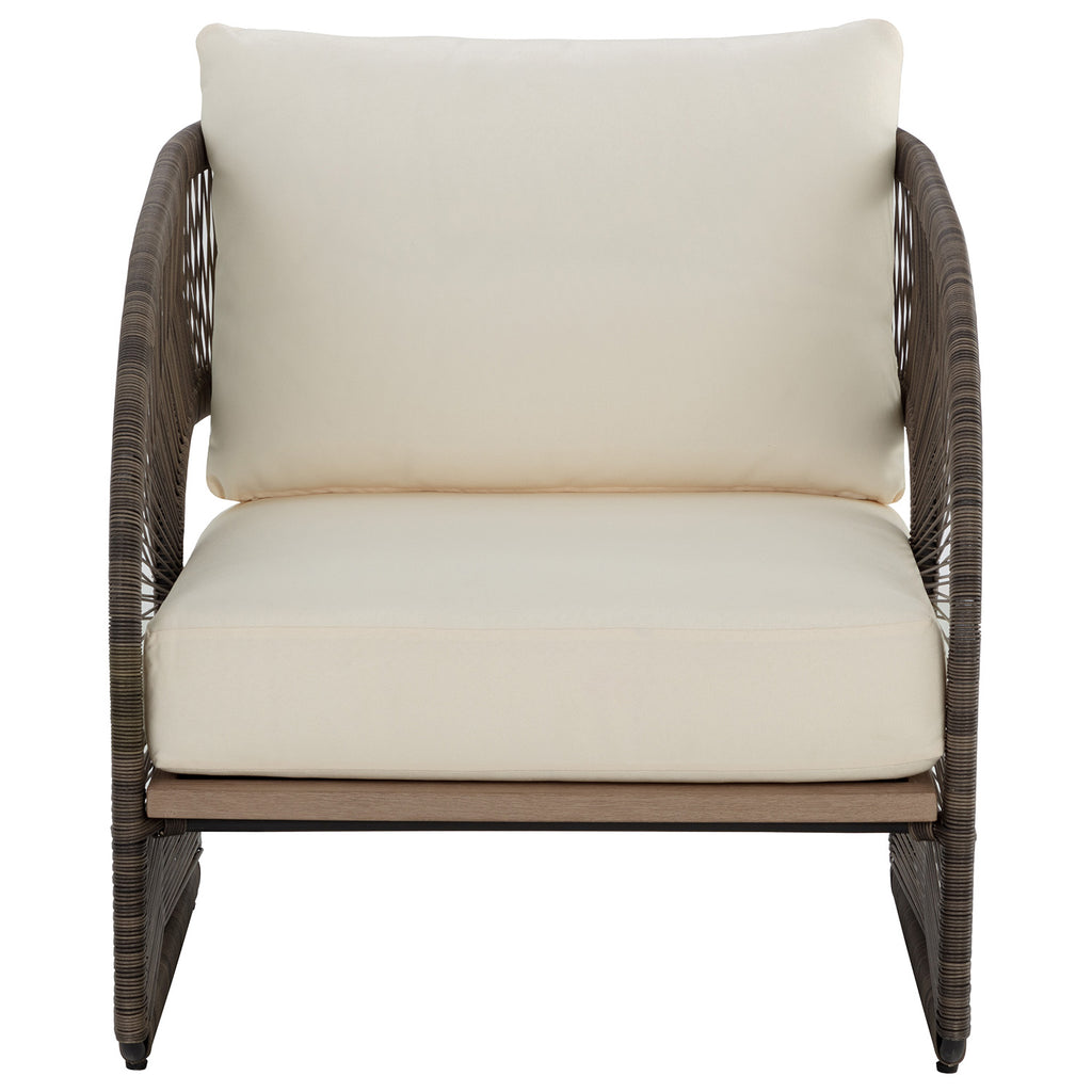 The Toulon Lounge Chair effortlessly combines sculptural shapes with an airy modern design. Featuring bold sweeping curves made from ore gray polyrod on a black aluminum frame. Comfortable cushioning upholstered in stinson cream fabric rests atop drift brown teak wood seat.