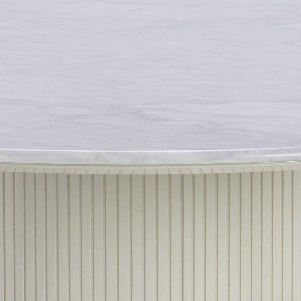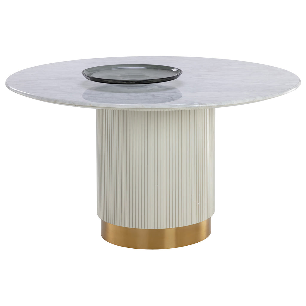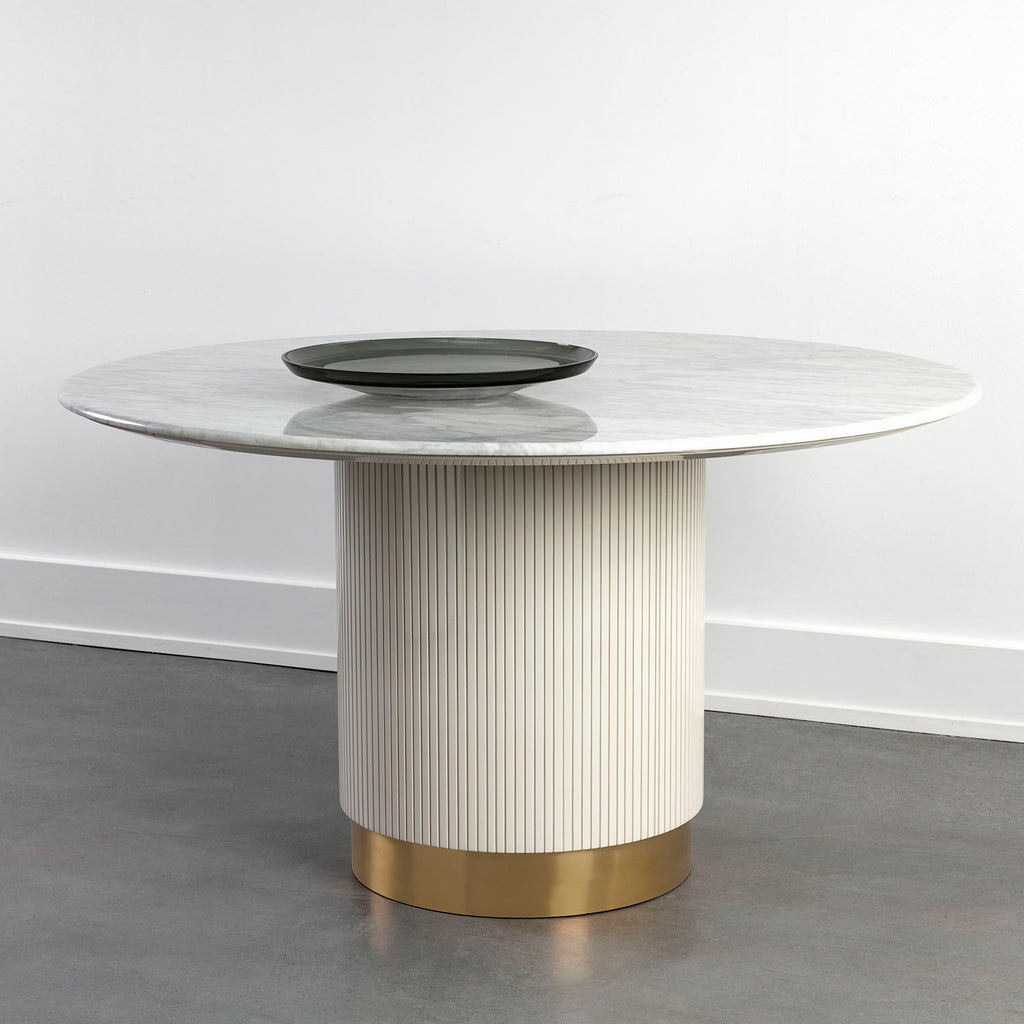 The Paloma Dining Table brings a sculptural spirit to any dining space. The smooth white marble tabletop contrasts with a textured high gloss cream base that features intricate vertical reeding. A gold stainless inlay at the bottom creates added definition. Coordinating lift-top coffee table and sideboard also available.