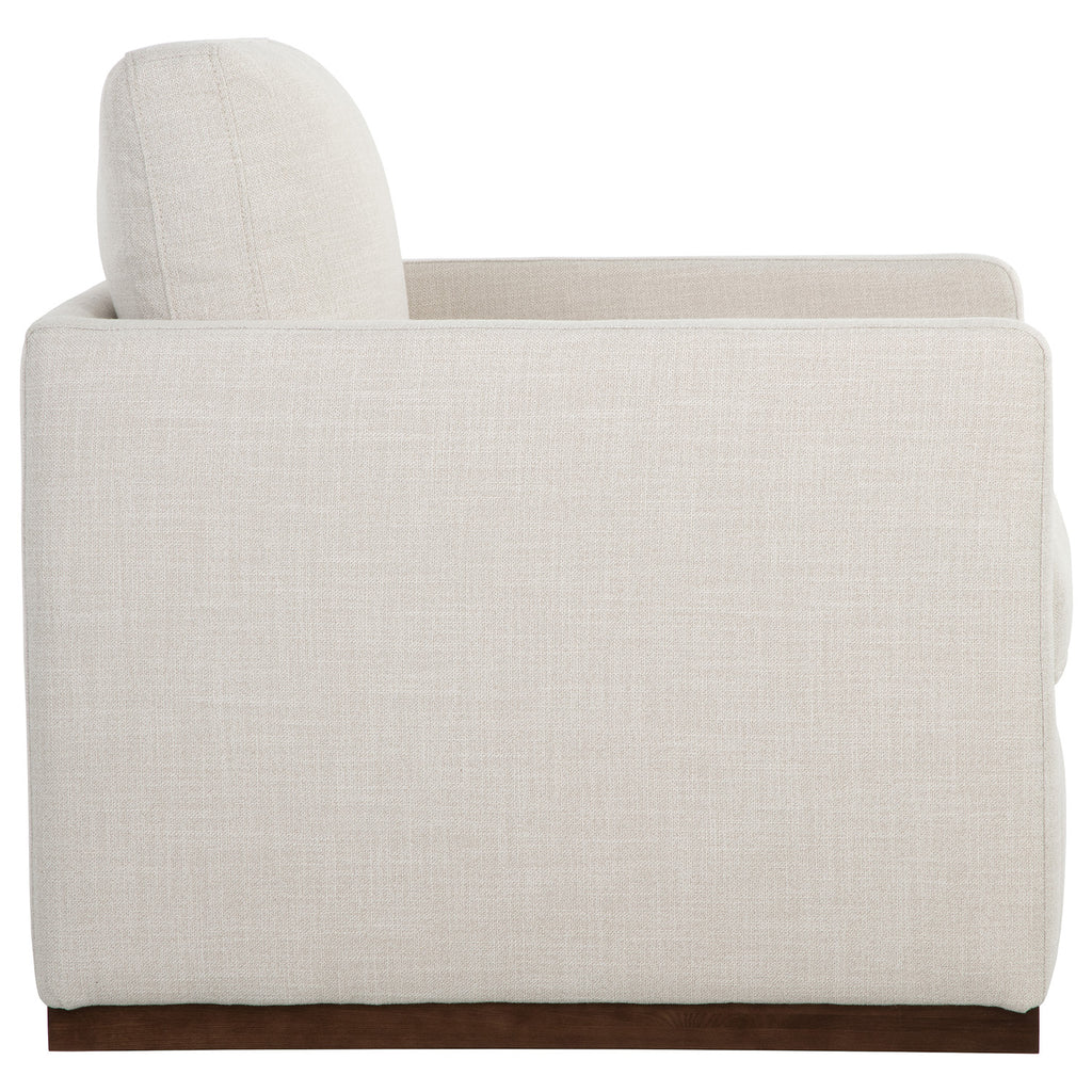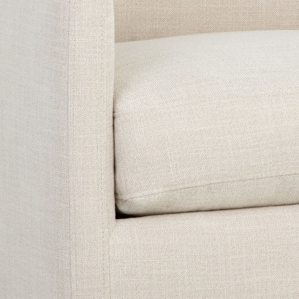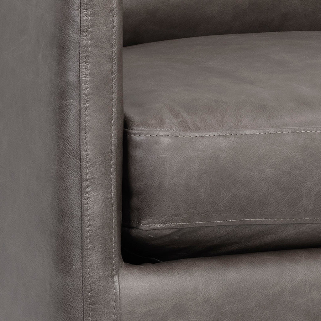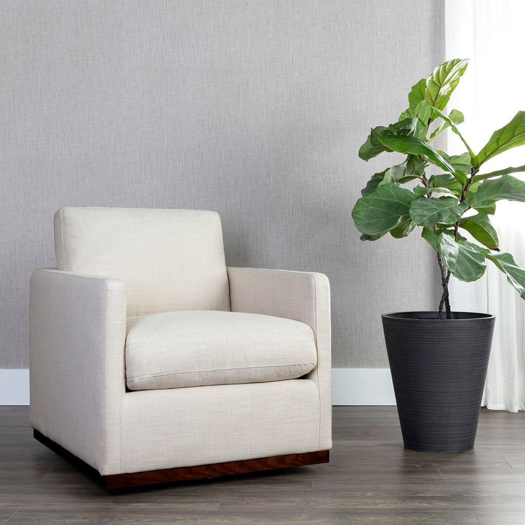 A robust swivel lounge chair. The modern design features a streamlined silhouette with track arms. Stocked in effie linen fabric or marseille concrete and camel leather.