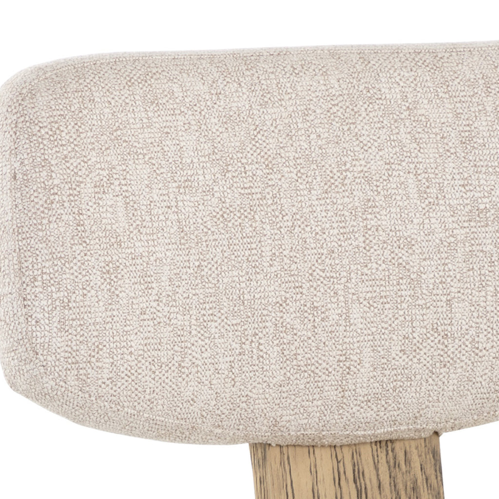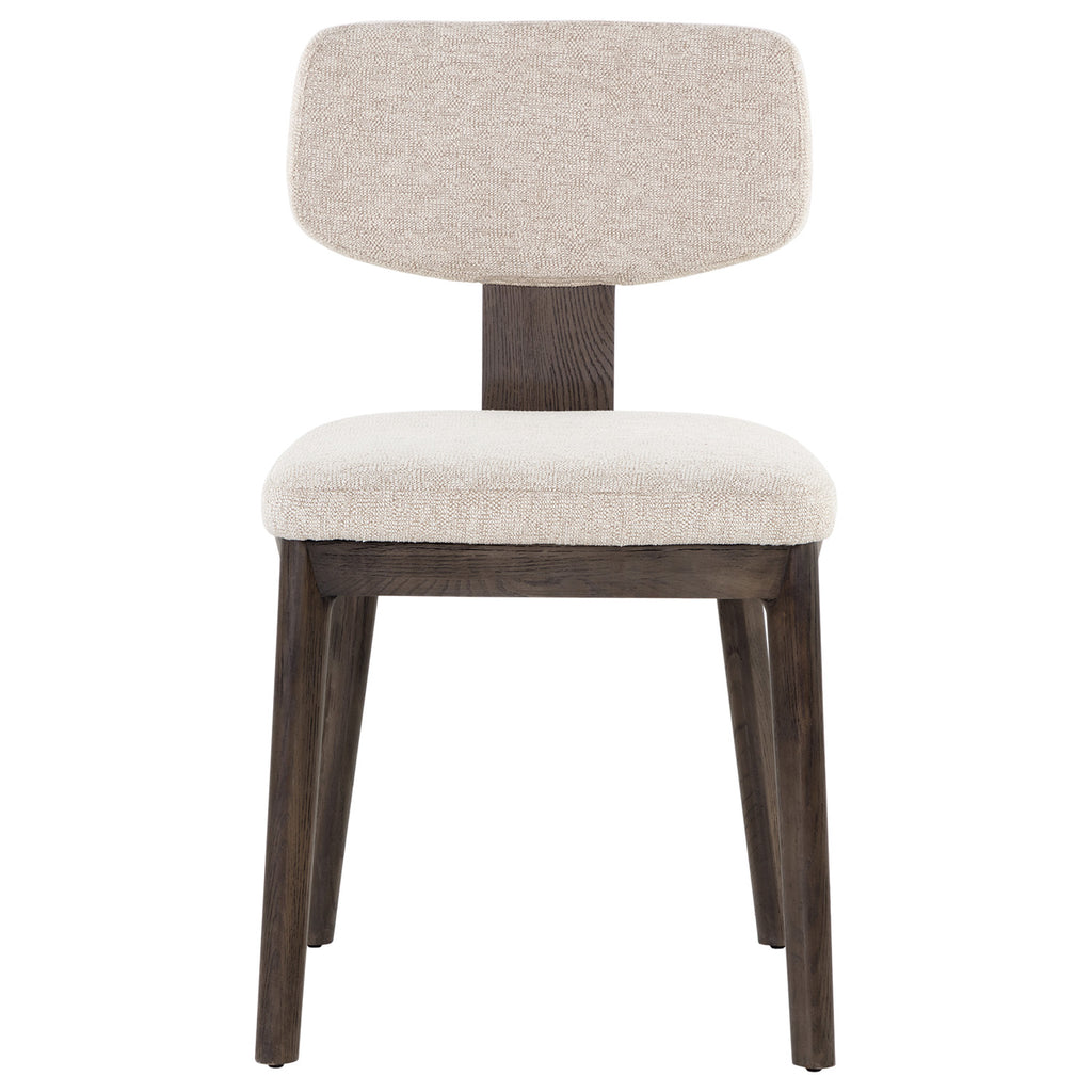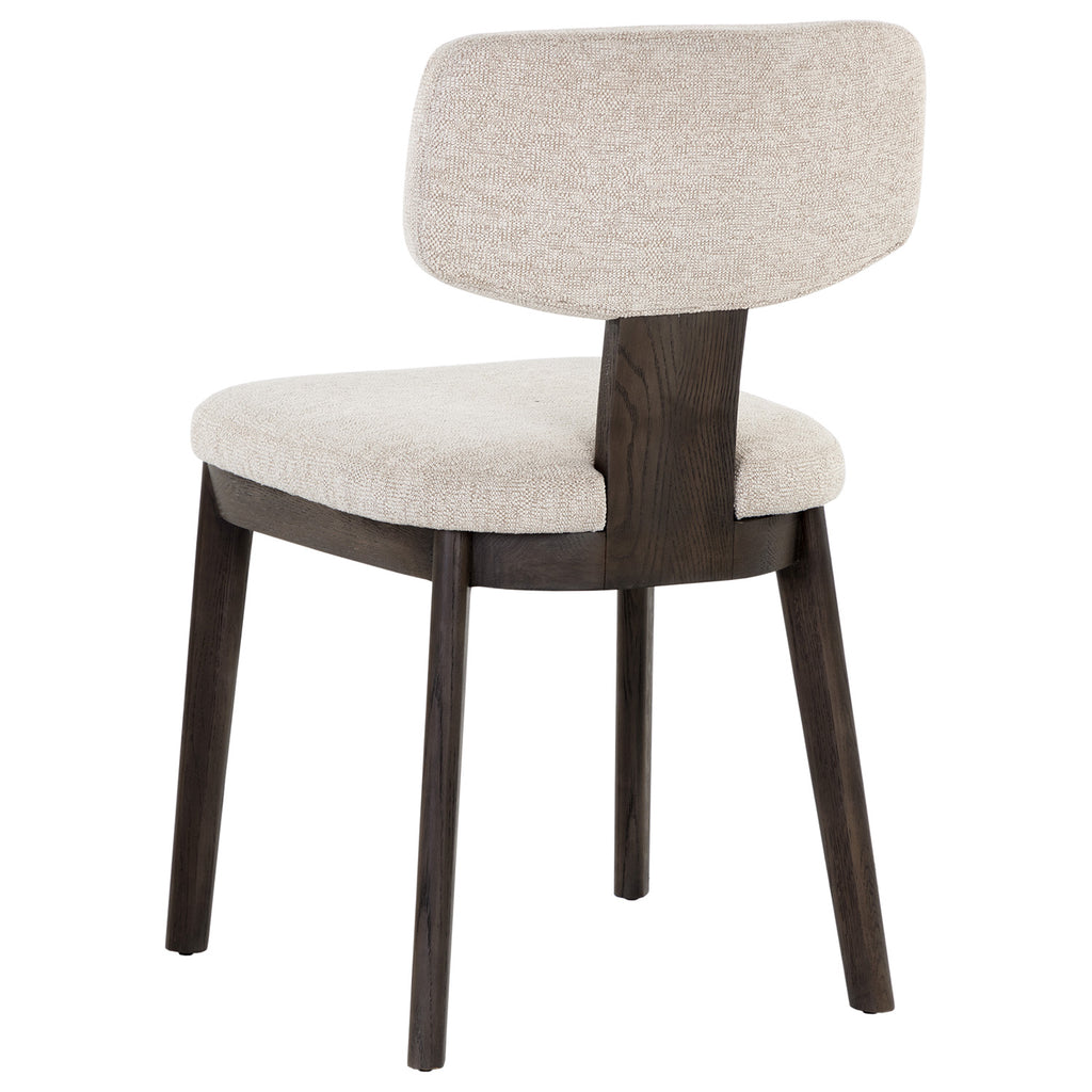Designed with timeless appeal, this mid-century modern dining chair is a great addition to any dining space. Upholstered in dove cream fabric with a solid dark brown oak wood frame. Also available in a weathered oak frame.