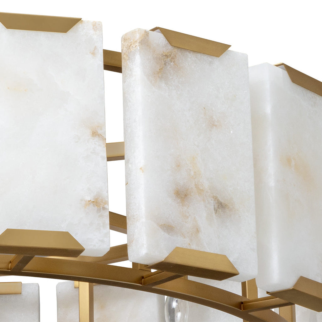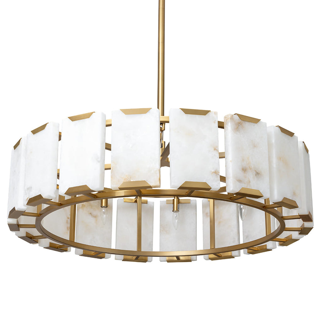 The Rovira Chandelier is an artful examination of the beauty of natural stone. Thick, hand carved panels of alabaster imported from Spain are held between a brushed gold iron circular frame for a dazzling design. The translucent nature of alabaster allows light to flow through, emitting a soft ambient glow. When lit, this design truly comes to life. As alabaster is a natural material, unique veining and color variations are all characteristics that add to the uniqueness and beauty of each piece.