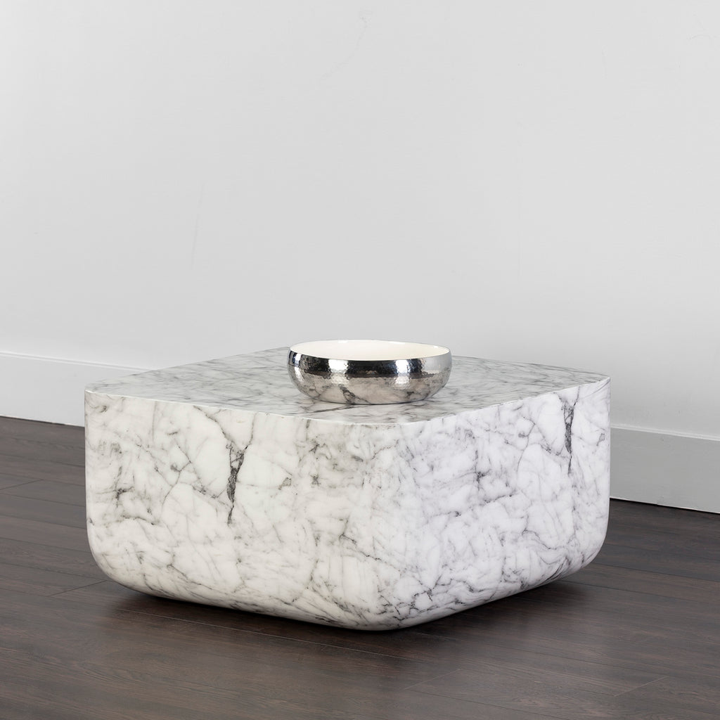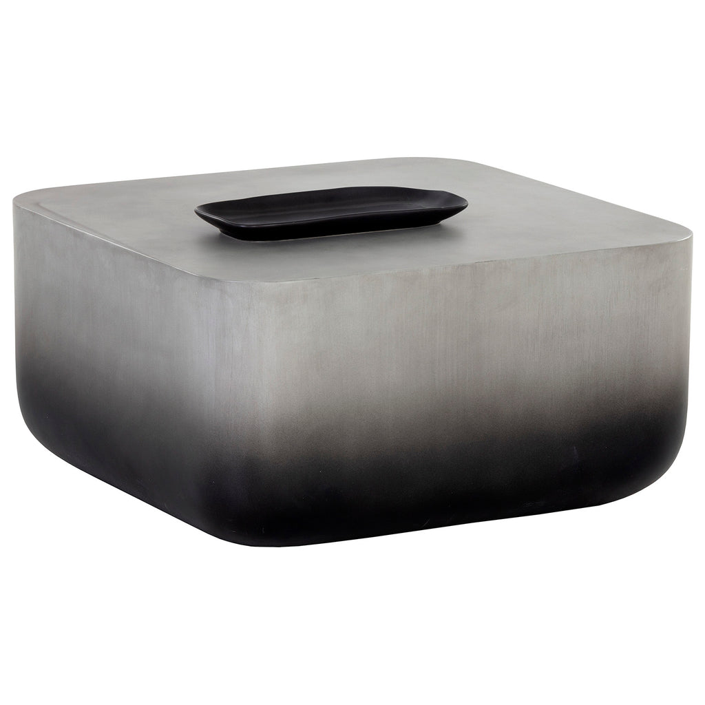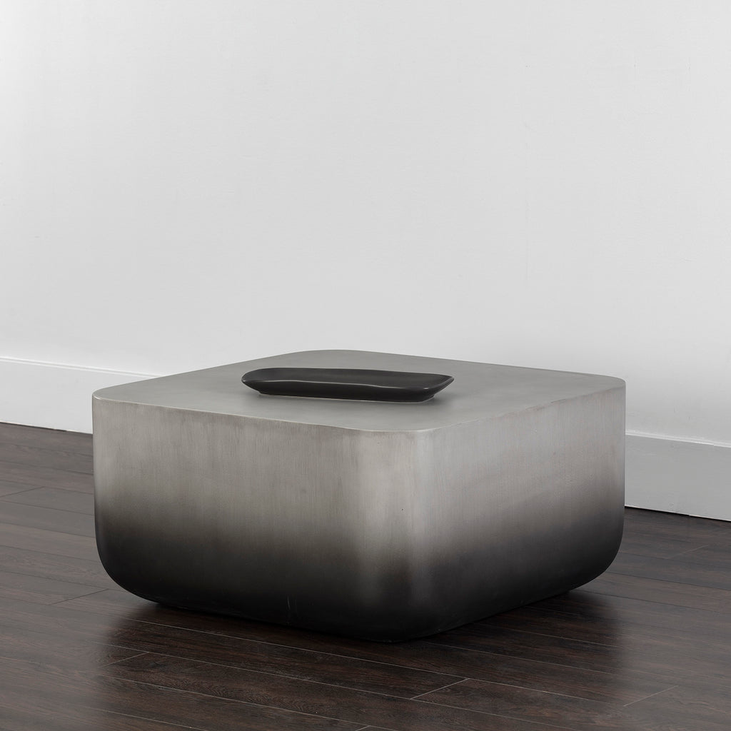 A bold and contemporary coffee table. Sculpted from concrete featuring a black ombre finish. The rounded square design is eye-catching and unique for placement in residential and contract settings.