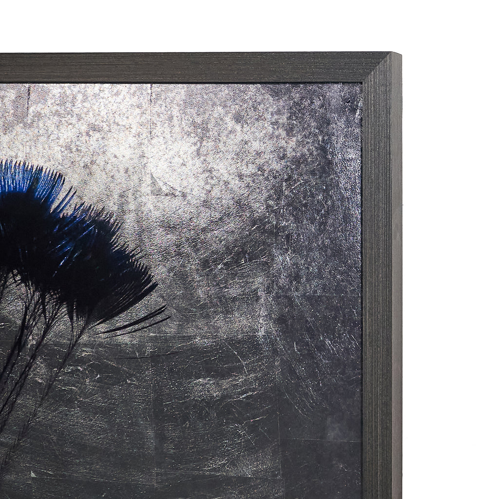 This glamorous print from our Luxe Art collection is a bold portrait of a peacock and its vibrant blue crown of feathers, symbolizing pride and nature's beauty. A labour intensive process begins with reverse printing on acrylic. Silver leaf is then slowly applied by hand for a reflective, shimmering look. Finished with a charcoal wood floater frame.