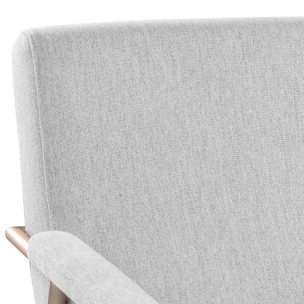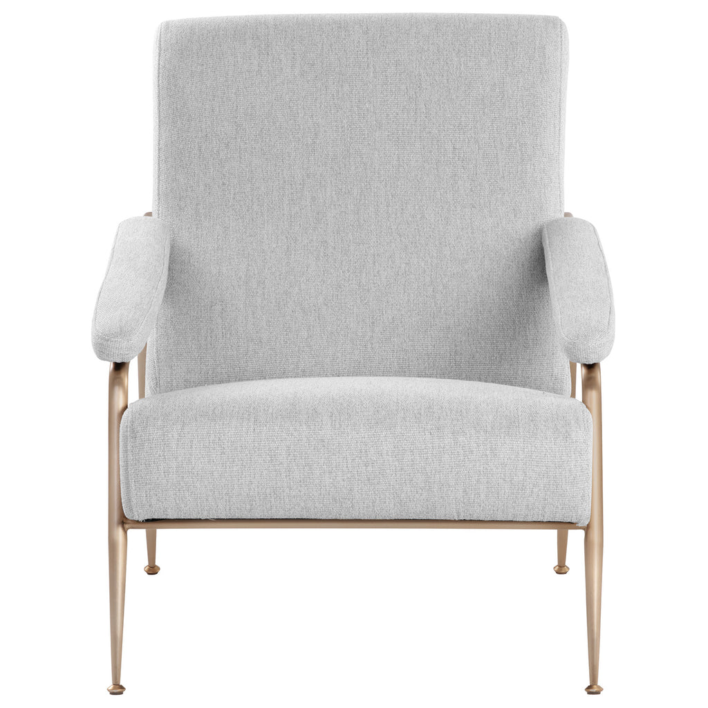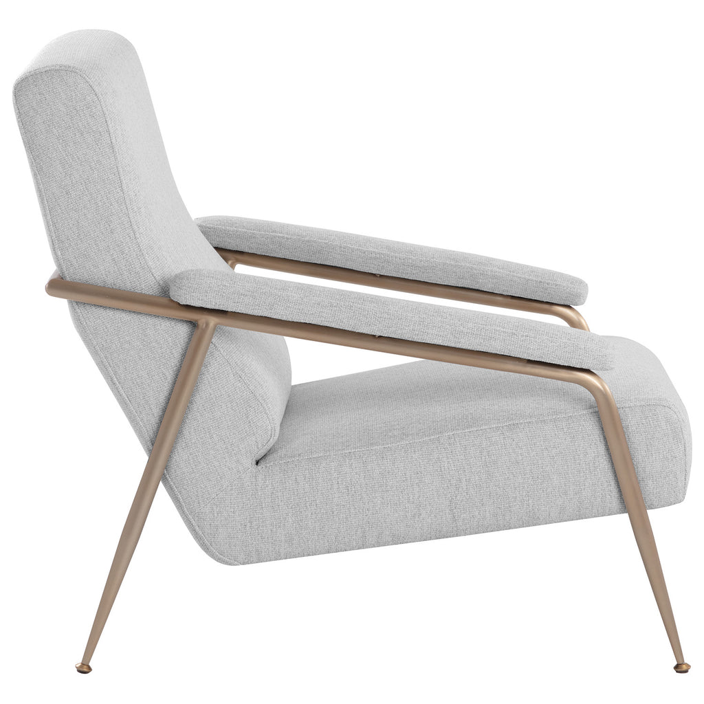 A mid-century lounge chair that features a beautiful design defined by clean lines. Upholstered in abbington navy fabric with a stainless steel frame in an antique brass finish.