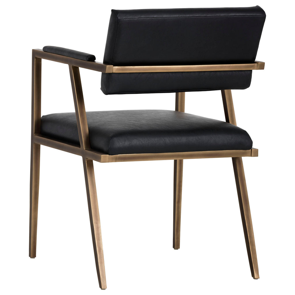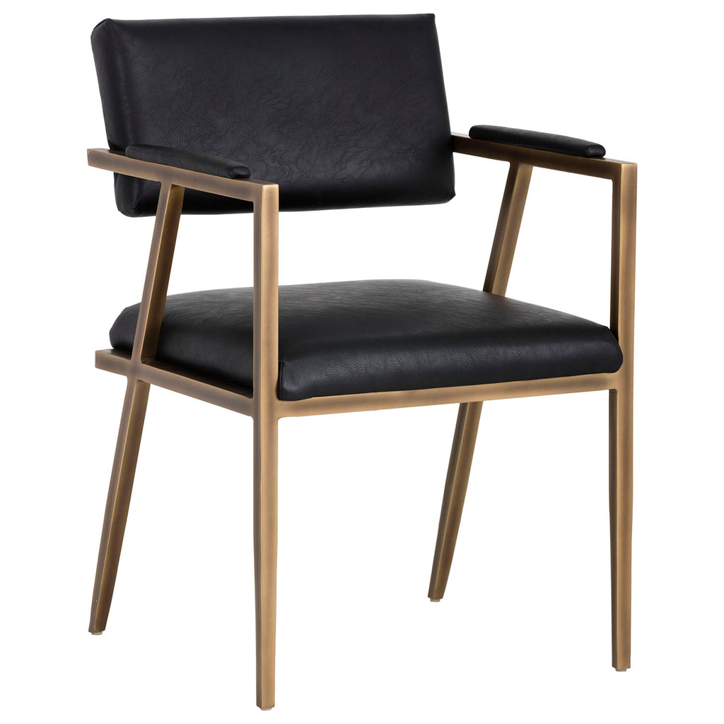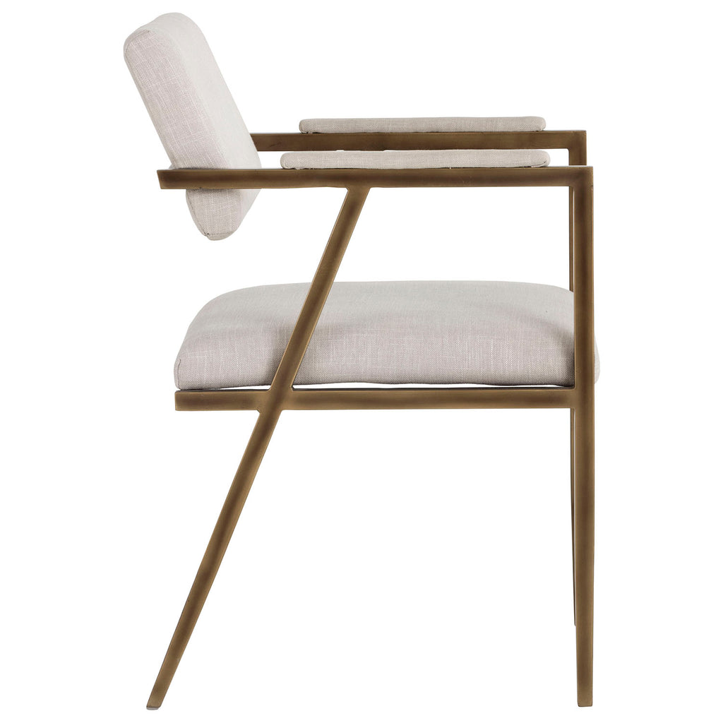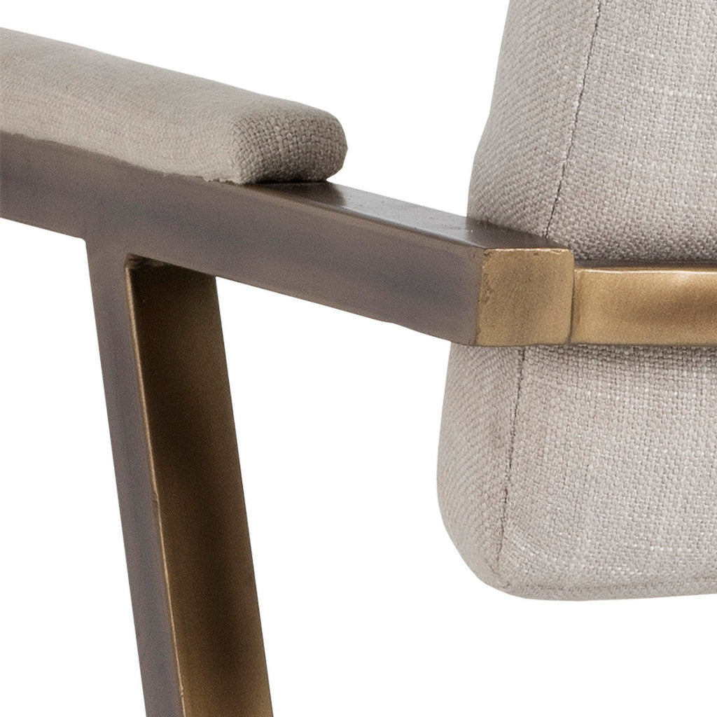 Industrial meets transitional elegance in this armchair. Reminiscent of mid-century modern styling with a rustic bronze steel frame and beige linen fabric on the seat and seat back. Can be used in both dining and living spaces.
