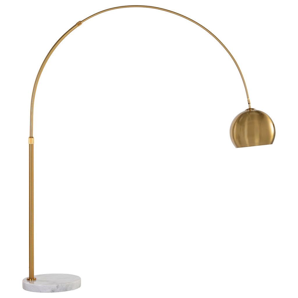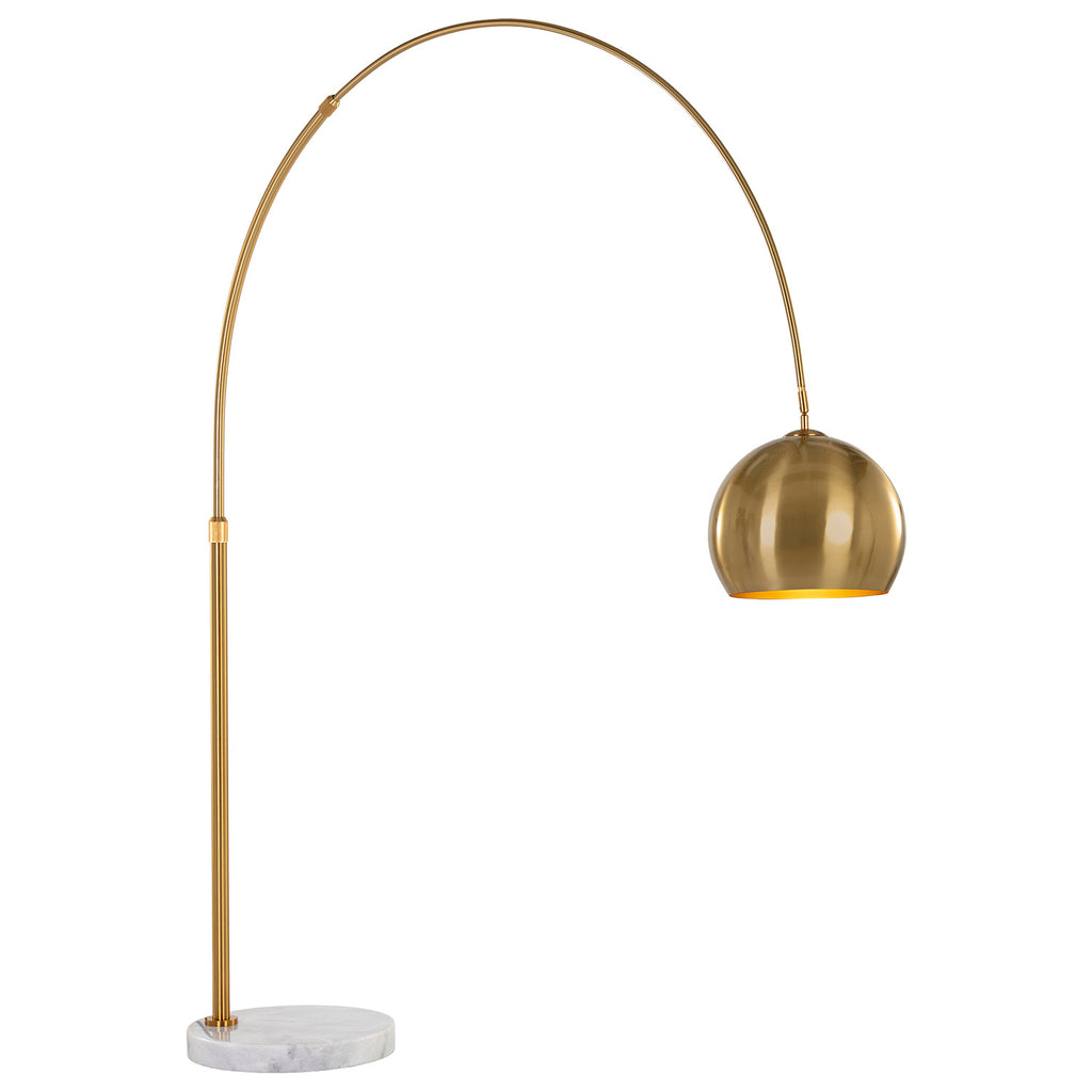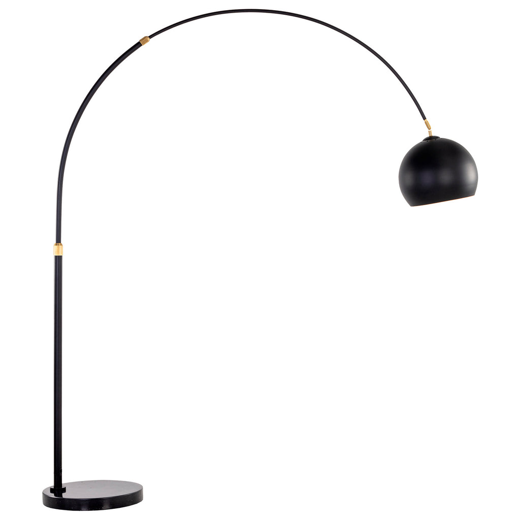 With a sweeping arc, this bold lamp will define living, lounge and office spaces with style. Features a globe shade in brass or black iron with a marble base.