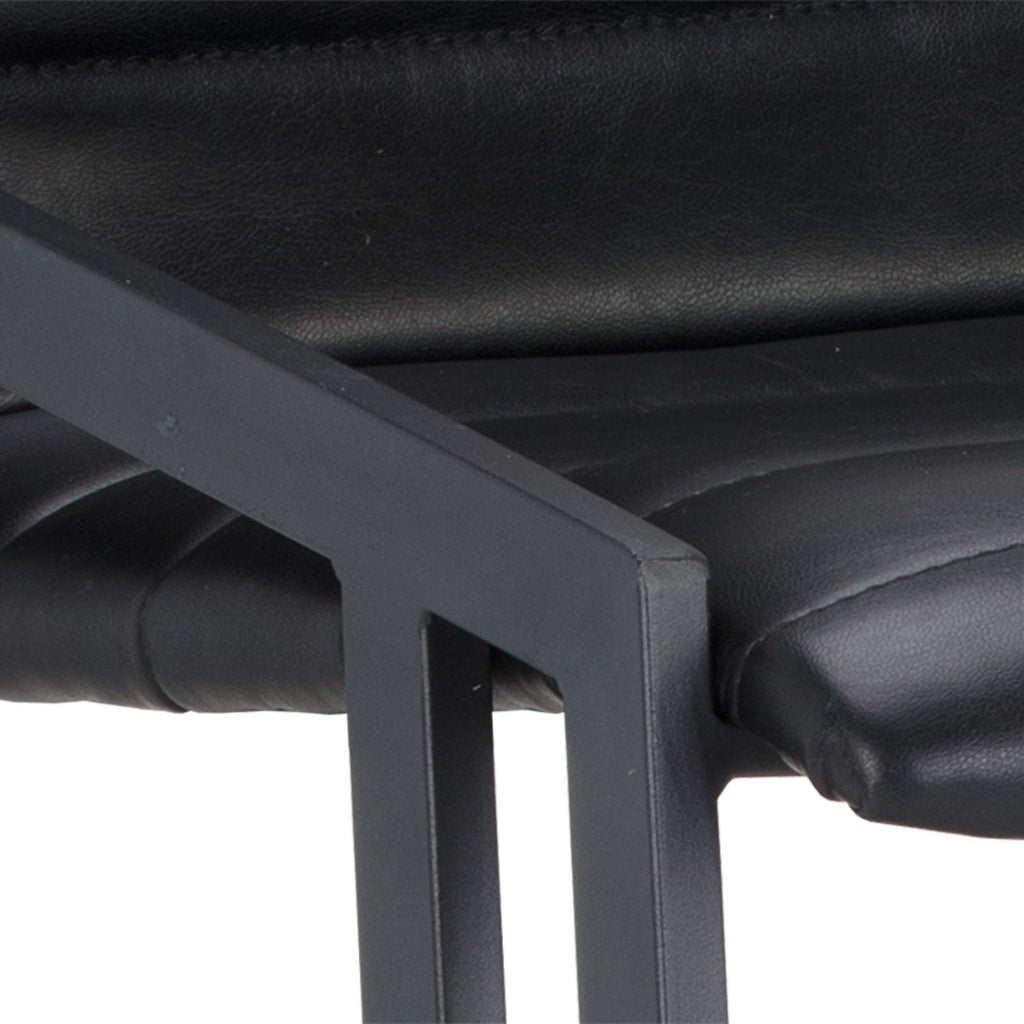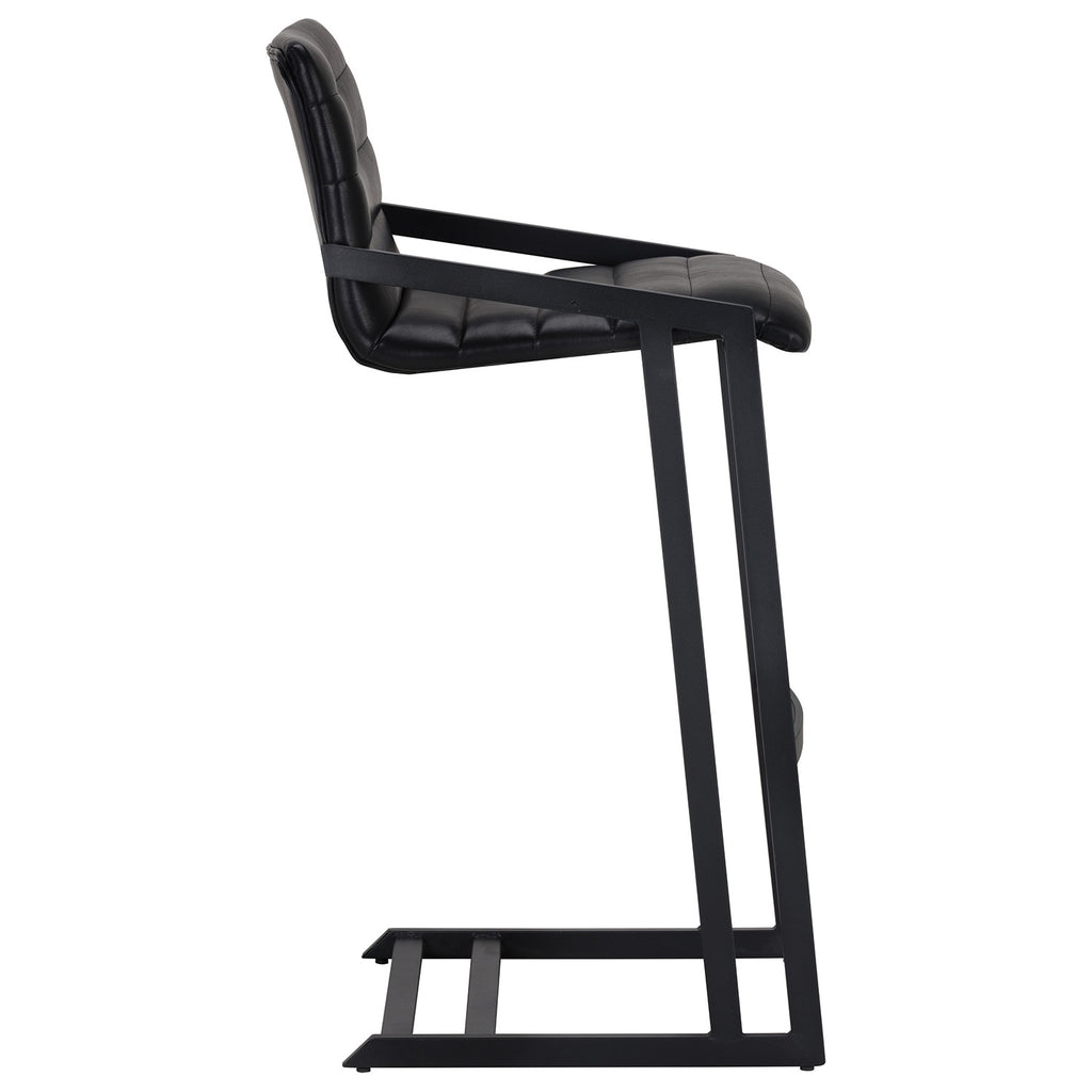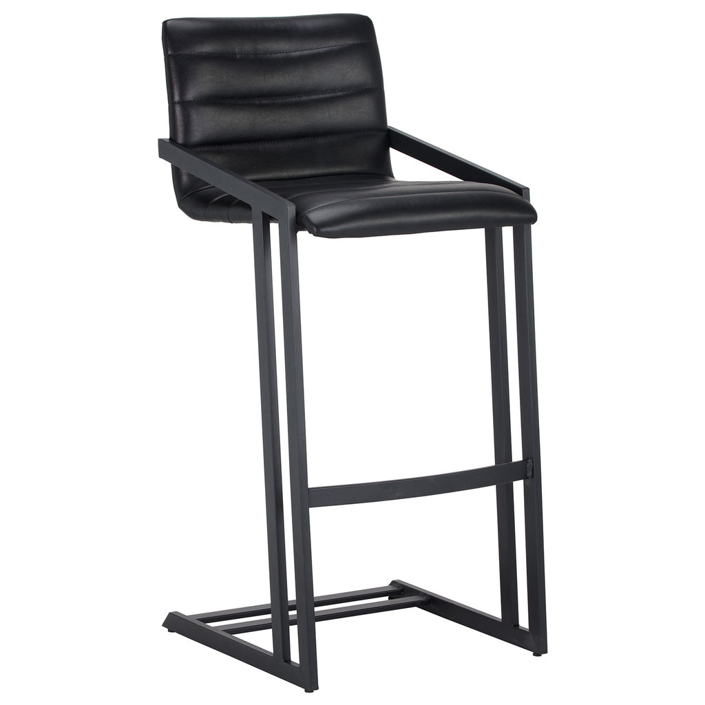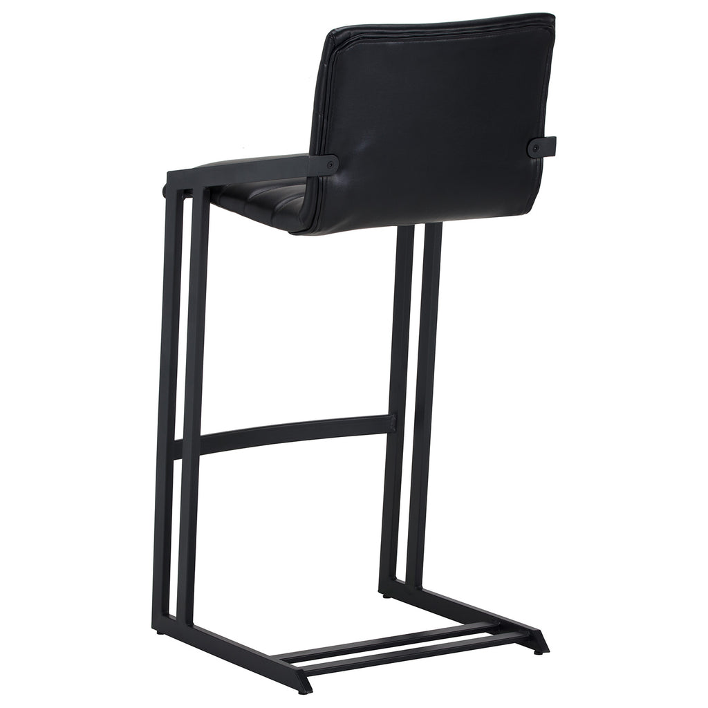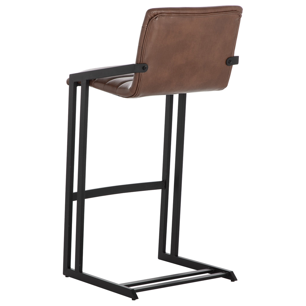 An industrial chic barstool. Features horizontal channel tufting on the seatback with an exposed black steel frame. Stocked in bravo cognac faux leather. Suitable for various dining, kitchen and bar spaces of all sizes. Counter stool version also available.