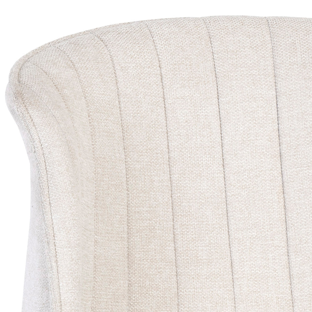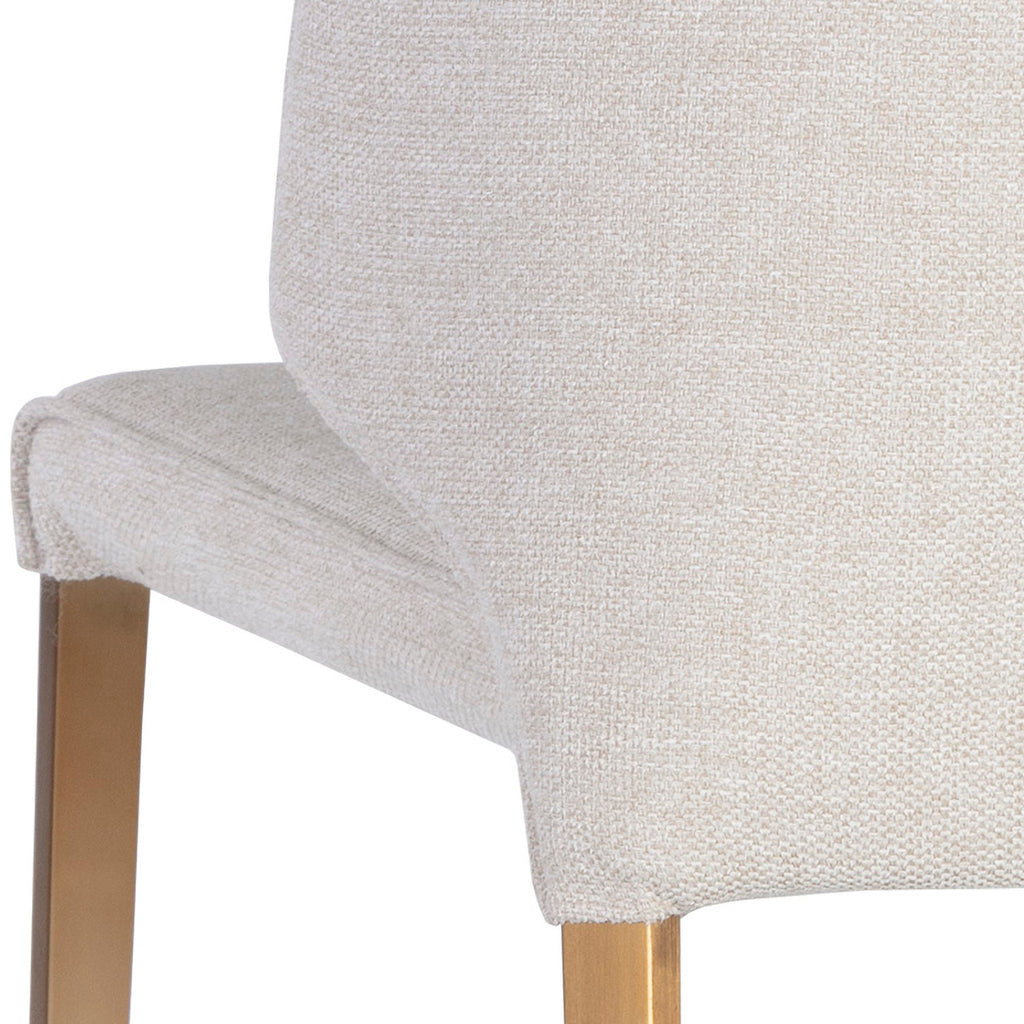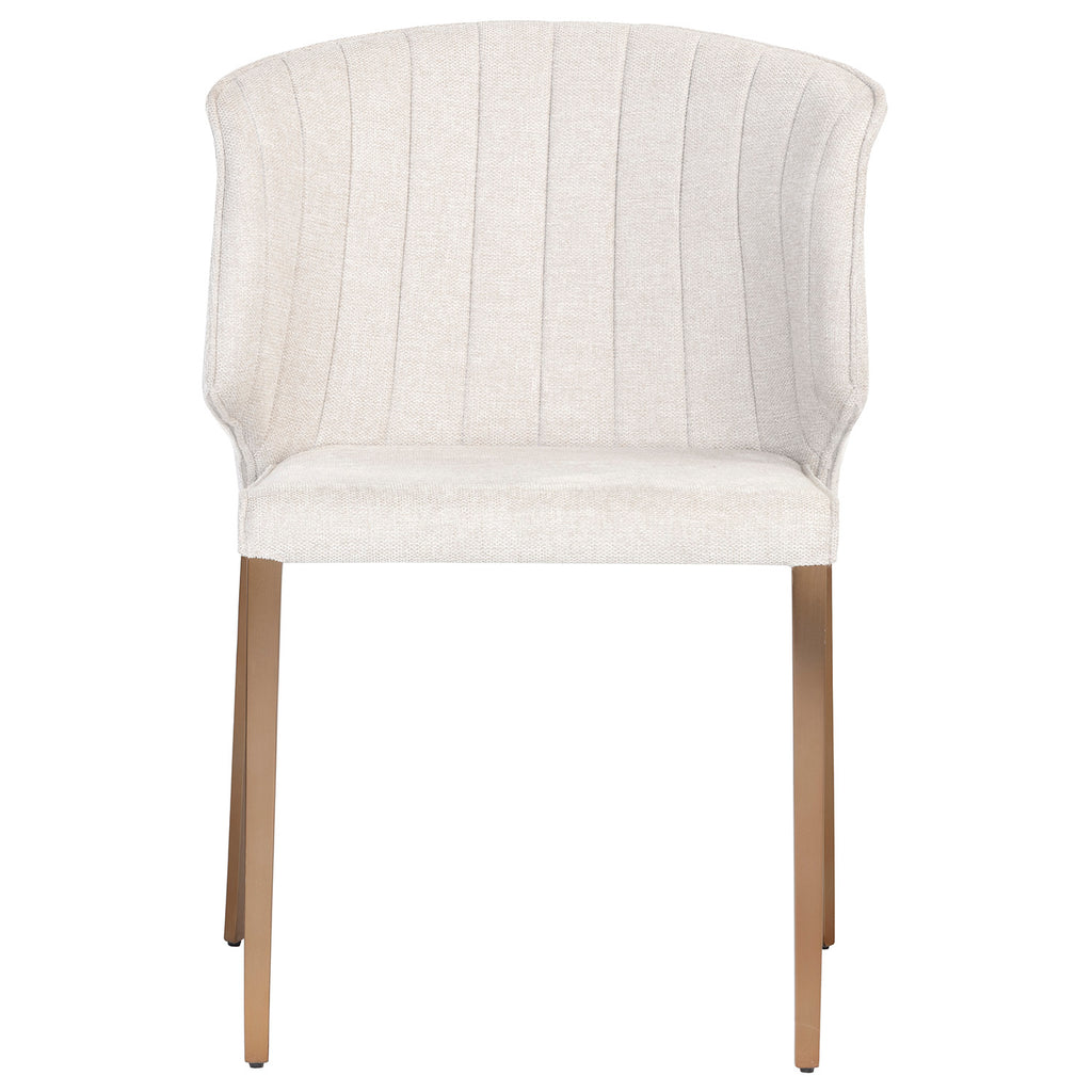 Fine and compact, this modern dining chair features a well-structured curved backrest with vertical tufting on the interior. Stocked in belfast oatmeal fabric and completed with stainless steel legs in a gold finish.